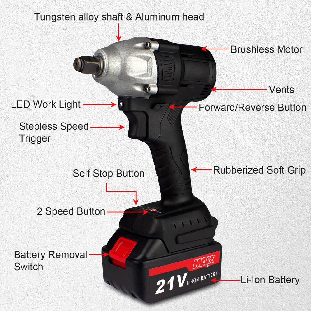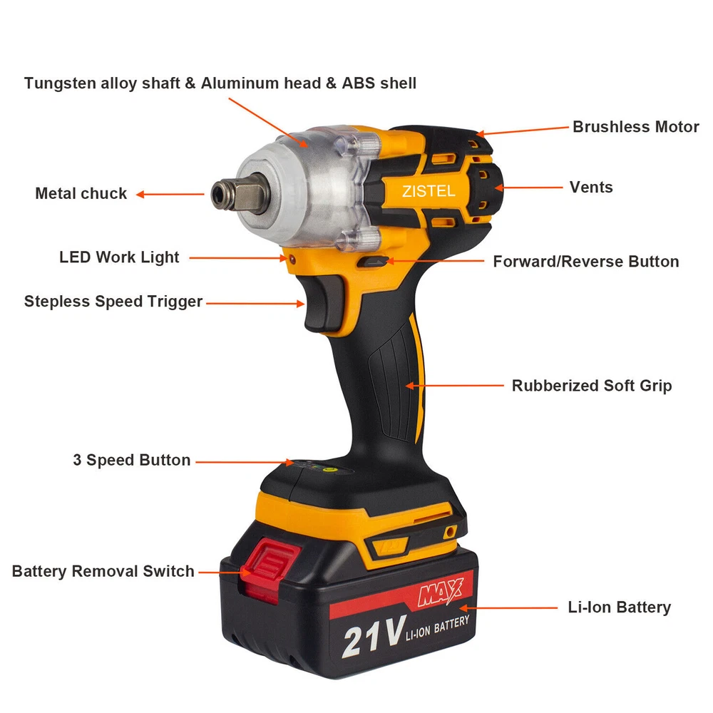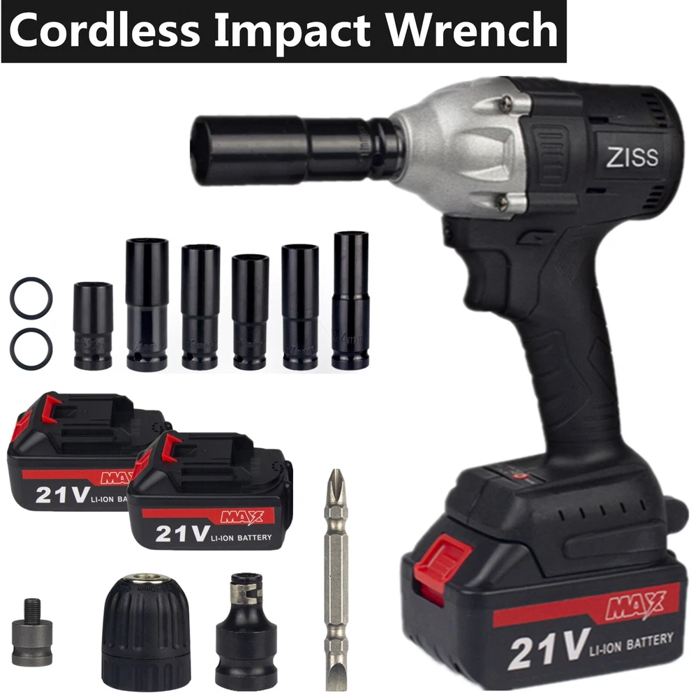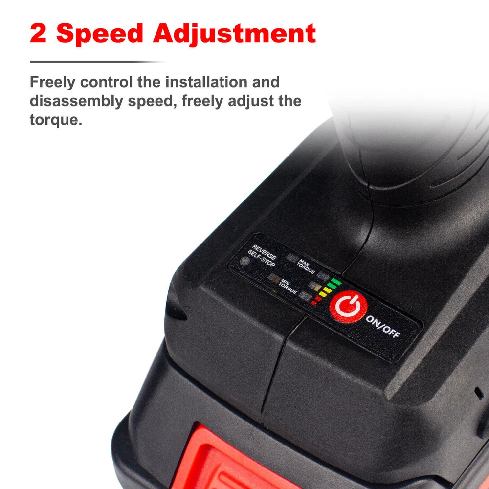 1/2'' Electric Impact Wrench Gun Cordless w/ Li-ion Battery High Power Driver Product Description Features: · Powerful Cordless Power Impact Wrench: This Impact Wrench has a powerful brushless motor, delivers a maximum torque of 520 N.M for fastening various applications. No load maximum speed of 2500r/min(frequency 1500r/min) for driving large fasteners quickly and easily. · Brushless Motor: Brushless motor for higher performance and durability with increased efficiency and runtime, less noise and sparkles compared to brushed motor. · Multi-Functional Cordless Impact Wrench, which can directly transform to Cordless Drill & Screwdriver,meet your work needs anytime, anywhere.It is equivalent to buying three tools at one price. · Configuration: Come with 3Ah Li-Ion Battery, which can last for 1.5-2H hours.The impact wrench have 2/3-speed & stepless speed, you can adjust the speed at any time. Equipped with LED light, there is no hindrance to work in a dark environment. · Forward / Reverse Button: enables easily change rotating direction,can be used for tightening or loosening nuts and bolts. Robust design combines with aluminum alloy housing which prevents damage to the tool. · Come with 14mm 17mm 18mm 19mm 21mm 22mm Wrench Sockets(Only Black,Yellow): different sockets used to be tighten or loosen the nuts and bolts, suitable for automobile repair, engineering maintenance and other applications.Come with a Tool Box as well,easy to carry and storage. · Humanized design: Light weight and compact size suitable for a variety of environments; Handle designed more comfortable and better grip. Specifications: · Voltage: 21V Li-ion Battery / 20V Li-ion Battery · Motor Type: Brushless · Speed: 2 / 3-Speed & Stepless Speed · Frequency Speed: 0-1500r/min · Max.Speed: 0-2500r/min · Max. Torque: 520 N.m · Wrench Chuck:1/2" · Drill Chuck:0.8-10mm / 3/8" · Powered Source: Battery Powered · Battery Capacity:3 Ah Li-Ion · Battery Qty:1 PC / 2 PCS · Working Time: 1.5-2 hours · Charging Time: 3-4 hours · Input:100-240V - 1.0MAX,50-60Hz · Output:21V 1.2ADC · Material: Metal&ABS Plastic · Socket Size: Black, Yellow: 14mm 17mm 18mm 19mm 21mm 22mm / Orange: 22MM Battery Tips: 1. Before first using,please make sure fully charge(3-4 hours) the battery to activate battery performance. 2. Keep the battery away from water,do not pound the battery violently. 3. If you encounter any problems during use, please let us know as soon as possible and our team will help you. Black + 2 Batteries Package Includes: 1 x 21V Impact Wrench 2 x 3Ah Li-ion Batteries 1 x Charger 6 x Socket Sleeve (14mm/17mm/18mm/19mm/21mm/22mm) 1 x Drill Adapter 1 x Drill Connector 1 x Hex Screwdriver Adapter 1 x Hex Screw Bit 1 x Rubber Ring 1 x Latch 1 x Portable Tool Box 1 x User Manual Yellow + 1 Battery Package Includes: 1 x 21V Impact Wrench 1 x 3Ah Li-ion Batteries 1 x Charger 6 x Socket Sleeve (14mm/17mm/18mm/19mm/21mm/22mm) 1 x Drill Adapter 1 x Drill Connector 1 x Hex Screwdriver Adapter 1 x Hex Screw Bit 1 x Rubber Ring 1 x Latch 1 x Adjustable Shoulder Strap 1 x Portable Tool Box 1 x User Manual Orange + 1 Battery Package Includes: 1 x 20V Impact Wrench 1 x 3Ah Li-ion Battery 1 x Charger 1 x 22mm Socket Shipping Policy All packages will be shipped within 1 business day. Notification of shipment will be sent to buyer through email on the same day that your item is shipped. We will ship this product via Standard shipping services. Normally, It takes * 1-3 business days to the Western United States * 4-6 business days to the Eastern United States However, please note that there are certain circumstances that we unfortunately can not have control i.e. weather condition, delay by post office, Sundays, National Holidays, etc. Besides, we don't arrange shipment on weekends. We appreciate your great understanding.