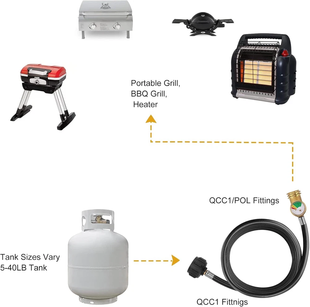 Store New Arrivals Add to Favorite View Feedback Contact 12 FT Propane Extension Hose with Gauge, Leak Detector Propane Hose for Propane Tank, Portable Grill, BBQ Grill, Heater and Most Propane Appliances, Acme to Male QCC/POL Fittings Description Color Silver, Gold, Black Material Brass, Rubber Item Weight 0.82 Kilograms Item Length 12 Feet Product Dimensions 3"W Size 12FT Compatibility: Compatible with all appliances with a QCC1/ Type 1/ POL connection. Universal: WADEO propane extension hose with gauge is used for most BBQ Grill, Heater, gas generator, burners, smokers, fire pit and all other propane appliances. Safety: Built-in detection system and safety monitoring system to restrict flow in case of hose or grill malfunction. Convenience: the 12 ft long propane hose allows to put the propane tank where needed with length to spare, get far enough away from truck, house and camper awning/tent. High Quality Material: The propane hose is made of long-lasting rubber and the connection is made of 100% solid brass construction withstands weather, scratching, denting and corroding. Product Description Products with the same function for you to choose Add to Cart Add to Cart Add to Cart Add to Cart Add to Cart Customer Reviews 4.5 out of 5 stars 768 4.4 out of 5 stars 15 4.5 out of 5 stars 44 4.5 out of 5 stars 19 4.4 out of 5 stars 1,409 Price $27.99 $ 27 . 99 $22.99 $ 22 . 99 $36.99 $ 36 . 99 $40.99 $ 40 . 99 $24.99 $ 24 . 99 with Gauge √ √ √ √ √ with POL to QCC1 Adapter / / √ √ / Length 12FT 6FT 6FT 12FT / Hose Connection QCC1 Tank Valve to QCC1/POL QCC1 Tank Valve to QCC1/POL QCC1 Tank Valve to QCC1/POL QCC1 Tank Valve to QCC1/POL QCC1 Tank Valve to QCC1/POL Material Brass Connection, Rubber Hose Brass Connection, Rubber Hose Brass Connection, Rubber Hose Brass Connection, Rubber Hose Brass Connection Hose Connection: Acme (QCC1/Type1) x Male QCC/POL. This hose can be used with all appliances with QCC1/Type 1 connection and up to 40 lb propane tanks. Hose Length: 12 Feet/ 144 inch hose adds a nice extension from RV / Camper to your propane devices. Enough to allow you to have some distance between the trailer and the BBQ. It's convenient that you don't need to move your propane tank. Material: Rubber & solid brass, can be effective corrosion protection. Propane Tank Gauge: This gauge can detect dangerous leaks and read on fuel level at glance. Screw it to the tank, hand tighten, open the valve, and start grilling. ABOUT US We offer the best prices around on high quality products. Our E-store includes media such as books, movies, music and games while offering electronics, toys, sporting apparel, clothing, tools, general home, garden items and more. SHIPPING We are always working hard to ensure your package arrives as soon as possible. Please understand that some factors like weather, high postal traffic, and the performance of shipping companies are outside of our control. We offer free shipping to the lower 48 states and ship within 2 business days of payment, usually sooner. We do not accept P.O. Boxes. Please provide a physical address. For shipping outside of the continental USA, we only use eBay's Global Shipping Program.The item is shipped to KY and then sent to the rest of the world. International customers are responsible for all duties and taxes. Continue to check out in order to calculate costs for shipping the item to your country. Messages regarding eBay's Global Shipping Program MUST be directed at eBay EXCLUSIVELY. RETURNS We offer a 30-Day Return Policy on items which you are not completely satisfied with. You have the option for a full-refund or an exchange of the item. No returns are available on items shipped outside of the USA. PAYMENT We accept PayPal. CONTACT US This page content is yet to come Please ad us to your favorite seller and visit again later Thank You CUSTOMER SATISFACTION We try our very best to make sure every customer is completely satisfied. If there's a problem, message us! We're happy to help. WE ACCEPT Copyright © 2021 AutoDS. | All Rights Reserved