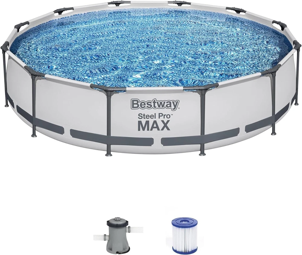 12 Foot x 30 Inch Round Metal Frame Above Ground Outdoor Backyard Swimming Pool Set with 330 GPH Filter Pump ENDLESS SUMMER FUN: Kids and adults of all ages can enjoy swimming and splashing in 's Above Ground Pool (12' x 30"), an above ground pool designed with extremely rigid, round-shaped frame for increased strength and durability. SUPERIOR FRAME DESIGN: The pool frames are applied with a rust and corrosion-resistant coating to protect the pool from UV and abrasion damage. A 3-ply PVC support band surrounds the pool for additional stability to the pool wall. MADE TO LAST: A durable, yet lightweight DuraPlus enhanced 3-ply liner provides structural integrity to your pool. It's puncture-resistant and won't fade overtime to sun exposure. UNMATCHED DESIGN: A corrosion-resistant steel frame is held together with our Frame System to provide remarkable strength and connection. EASY TO ASSEMBLE: No tools are required to install this above ground pool in your backyard. A flow-controlled drain valve provides a simple solution for emptying the excess water. Get ready to have hot summer fun in minutes! CONTENTS: 1 pool, 1 filter pump (compatible with Type I cartridge). Water capacity (90%): 1,710gal. Measures 12 feet in diameter x 30 inches high Includes 330 Gallon Filter Pump and Filter Cartridge so pool can be used after set up Heavy Duty PVC Repair Patch Kit included Includes DVD detailing pool set up and maintenance Flow Control Drain Valve for easy draining 12ft Steel Pro Frame Pool Set is a fantastic family swimming pool because it isn't too deep and has been built to last season after season. It's a great way to practice swimming, entertain guests or cool down in the sweltering sunshine. Rust-resistant, steel frames are used to construct the 12ft pool and are fitted together using simple 'T' connectors and 'C' clips. All the fittings have been specially designed to lock together with ease. The frames hold the heavy-duty, PVC and polyester 3-ply wall in place, whilst PVC flaps hide the 'T' connectors and 'C' clips to protect from rust and injury. The only tool needed is a screwdriver to fit the included 330gal filter pump to your pool. Setting up the metal frame pool takes no time at all with the included instructional DVD. From the Manufacturer gives you the most cost effective way to bring a durable long lasting swimming pool to your backyard. The 12'x32" Steel Pro Frame Above Ground Swimming Pool sets up in 60 minutes or less and includes everything you need to begin your swimming fun. With proper maintenance and care your 12'x32" Steel Pro Frame Above Ground Pool will give you s of enjoyment. The strong and rust resistant metal frame pools are wrapped with heavy duty PVC and polyester 3-Ply walls. At the end of the season draining your pool is made easy with the attached Flow Control Drain Valve. The valve can attach to your garden hose so water can be drained away from your home. Your pool comes with a 330 Gallon Filter Pump and Filter Cartridge, Heavy Duty Repair Patch and free DVD detailing pool set up and maintenance. Order today!