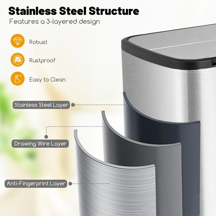 12 Gal Kitchen Stainless Steel Trash Can Basket Detachable Bucket With Wing Lids ● Detachable Inner Bucket: Simplify your waste disposal routine with the 12 gal trash can's easily removable inner bucket. This clever feature allows for quick and clean trash bag changes while also protecting the outer shell from spills and stains. ● Stainless Steel Structure: The kitchen waste bin boasts a 3-layered frame, composed of a stainless steel layer, a drawing wire layer, and an anti-fingerprint layer. Besides, it is robust and rustproof for long-term use, while being stain-proof for easy cleanup. ● Soft-Closing Mechanism: To improve the using experience, the hand-free garbage can allows for pedal control and has a soft-closing system that makes the wing lids descend gracefully, eliminating disruptive noise and avoiding pinch accidents. ● Full-Open Wing Lids: The waste bin's unique wing lid design makes it an ideal fit for low-clearance areas, allowing you to tuck it away neatly under counters or desks. The flaps open effortlessly from the center, offering a wide opening for discarding waste. ● Slim Shape and Wide Use: Designed to be space-saving, the step trash can properly fits into any corner space. In addition, it comes with side handles, enabling you to move it to your kitchen, bathroom, living room, office, and more. Color: Silver Material: Stainless Steel, PP Size of Closed Status: 20.5" x 10.5" x 27" (L x W x H) Height of Open Status31.5" Size of Inner Bucket: 16" x 9" x 24" (L x W x H) Max Capacity: 12 Gal Net Weight: 16 lbs