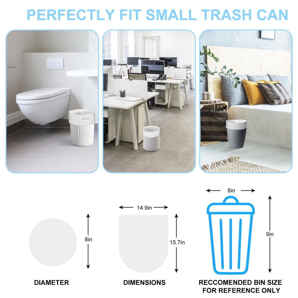 [Compostable Trash Bags] PSM (Plant Starch Material) is applied in these little trash bags for better and environment. 1.2 gallon mini trash bags are non-and unscent. mini garbage bags help reduce the amount of plastic waste in landfills and oceans. Don't miss this chance to get great small desk trash bags on great budget. [Mini Garbage Bags] The size of the small trash can bags for bathroom trash can is 15.7 inch long and 15 inch wide (38*40 cm). waste basket liners fit 1/1.2/1.3/1.5/1.6 Gallon Trash Can. Size: 15x15.7 inch (38*40 cm); You will receive 200 clear white trash bags in a pack. [Durable Trash Bags] Using 1.2 gallon small bathroom trash bags, you won't get frustrated by the leakage or spill. The bottom of the waste basket trash bags is sealed firmly with 450℉fusion. tiny garbage bags are strong enough to hold food scraps, paper waste and other small items. [Handy Trash Bags] The mini garbage bags are convenient to use. You can find bin liners in bathroom, office, kitchen, tampon, diaper, pet litter, travelling or so. It's a more budget-friendly alternative to simple human trash can bags code a, preventing messes and odors in your house. [Grateful to All Customers] We'd say thanks to all the customers who have been so supportive. Available in various quantities and sizes to fit different needs and preferences. 100% is guaranteed if you are not satisfied.