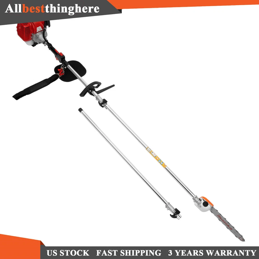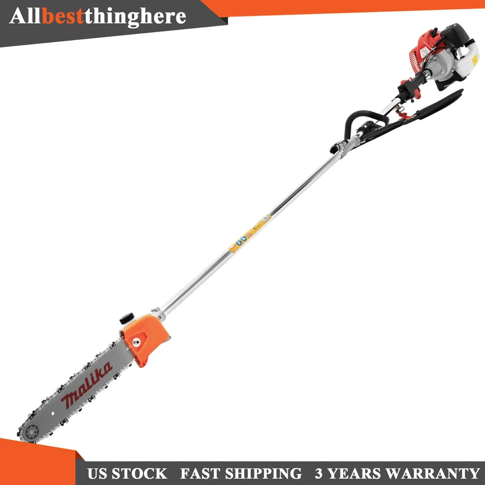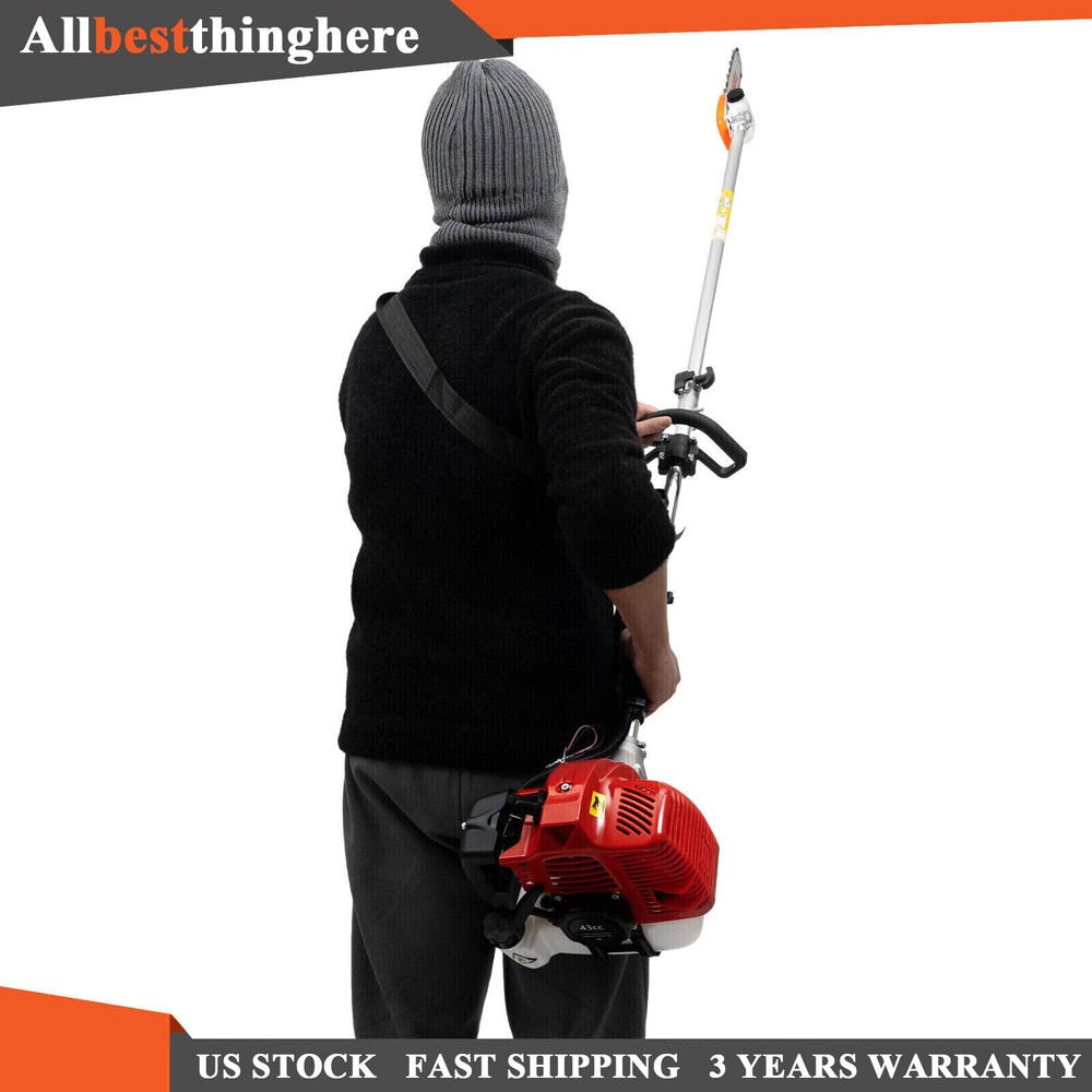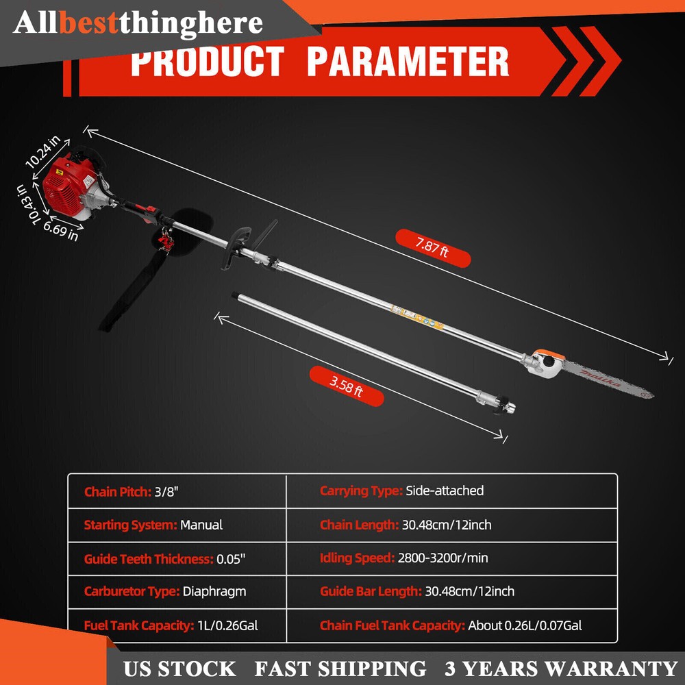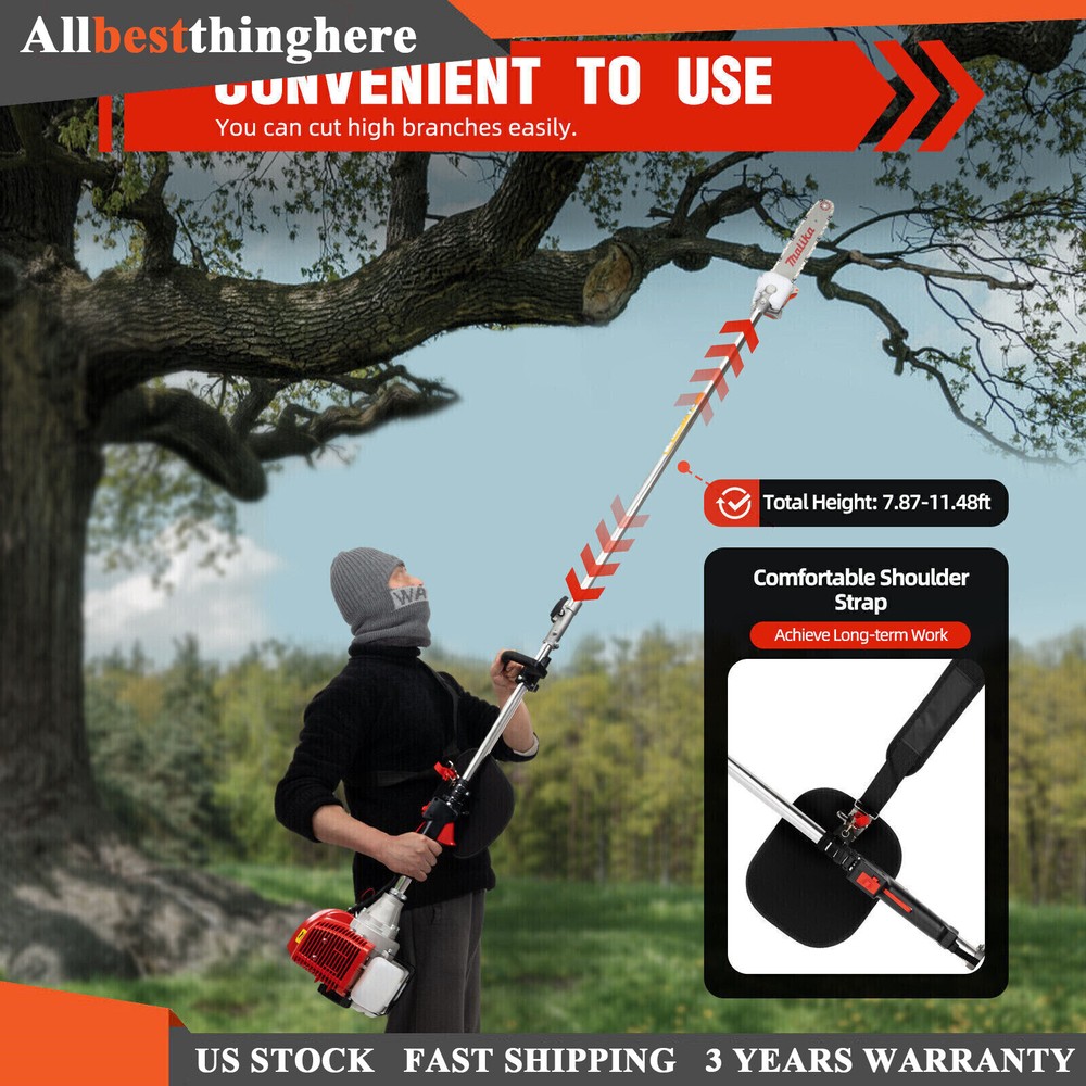 ❤❤❤Welcome❤❤❤ We are committed to providing customers with better and more favorable products!!! If you have any questions, please feel free to contact us!!! Thank you for your support~ 12" Gas Trimmer Saw Tree Trimmer Chainsaw Gas Powered Pole Saw Pruner Pruning Description Do you still have trouble trimming high branches? The pole chainsaw with a two-stroke engine has strong power, and the hard guide chain and guide plate can quickly cut through tree branches. The long enough pole as well as the strap design allows you to easily trim high branches without having to risk standing on high ground, making your pruning job safer. Key Features Good Durability : It is mainly made of high-quality aluminum alloy, manganese steel, and PP. These materials are not easy to deform and rust, therefore, it has a long service life and you can use it with confidence. Powerful and Efficient : The 1.25kw high-power, 6500-8500rpm high-speed two-stroke engine can provide strong cutting power for it. The sharp manganese steel chain and guide plate enable quick cutting of tree branches. It has a wide cutting range and high work efficiency with a maximum cutting diameter of 11.81 inches. Stable Engine: The excellent air-cooled cooling system and dense cooling holes can dissipate heat and cool down the engine in time. Moreover, the air filter helps to filter impurities in the air and reduce the wear and tear of dust and sand on the engine, which can achieve stable machine operation. Long Endurance Time: Its fuel tank is capable of holding 0.26 gal of fuel, which is a huge capacity. This gives the chainsaw a very long endurance time without frequent refueling. High Safety : It can only be activated by pressing both switches simultaneously, which can prevent accidental touch of the throttle switch. The push-button flameout switch also makes it safer for you to use. Convenient To Use: The detachable long pole makes it easy for you to store and carry. It can reach 7.87-11.48ft in height with the long pole attached, and the comfortable strap design allows you to use it with less effort, so you can easily cut high branches from the ground, which is very practical and convenient. Easy to Install : It has a simple structure and comes with detailed installation and operation instructions, allowing you to quickly install and operate it. Protective Package: To prevent the product from being damaged and bumped during transportation, we packed it with foam to protect your products to the maximum extent possible. Customer Service: Communication is the best way to solve problems. If you have any problems, please feel free to contact us. We will reply and solve the problem for you as soon as possible. Details Adjustable Handle : The ergonomic handle can be adjusted in position and angle at will by loosening the screws, so you can adjust it to a suitable position for use according to your height and arm length, making it more convenient to use. Start Handle: The anti-slip handle is easy to pull, making the machine start more convenient and faster. Quick Connector: The easy-to-use connector allows for quick disassembly and assembly of the connecting rod, making it more convenient to handle. Application It is suitable for sawing high branches and small trees in gardens, farms, parks, forests, pastures, orchards, and so on. Specification Material: Aluminum Alloy, Manganese Steel, PP Engine Type: Air-cooled, 2-stroke, Single-cylinder Engine Power: 1.25kw Speed: 6500-8500rpm Engine Displacement: 43cc Carburetor Type: Diaphragm Idling Speed: 2800-3200r/min Fuel Tank Capacity: 1L/0.26Gal Chain Fuel Tank Capacity: About 0.26L/0.07Gal Fuel Ratio: 1 Engine Oil: 20-25 Gasoline Starting System: Manual Carrying Type: Side-attached Extension Rod Length: 1.09m/3.58ft Total Length of Product: 2.4m-3.5m/7.87-11.48ft Guide Bar Length: 30.48cm/12inch Chain Length: 30.48cm/12inch Chain Pitch: 3/8" Guide Teeth Thickness: 0.05'' Max. Cutting Diameter: 30cm/11.81inch Engine Size: 26*17*26.5cm/10.24*6.69*10.43inch Packing Size: 110*30.7*29.5cm/43.31*12.09*11.61inch Net Weight: 8.8kg/19.4lbs Gross Weight: 10.95kg/24.14lbs Package Included 1x Pole Chainsaw 1x Extension Pole 1x Back Strap 1x Screwdriver 1x Goggles 1x Fuel Mixing Bottle 1x Funnel 1x Auxiliary Handle 2x English Manuals Other Accessories for Assembly Notes Before use, it is necessary to add gasoline and two-stroke engine oil to the fuel mixing bottle and mix them thoroughly. After use, please pour out the fuel in the fuel tank, drain it, or burn the fuel in the carburetor to avoid clogging the carburetor. Please pay attention to safety when using this product. Do not put your hands on the guide plate chain when the machine is running to avoid being hurt. Please read the user manual carefully before use and pay special attention to the safety precautions included. Please allow the slight color difference caused by the shooting light and 1-3cm error due to manual measurement, and make sure you do not mind before ordering. Payment Delivery details Terms of sales About us Contact us Payment We accept ebay payment 。 Fees such as import duties, taxes are not included in the item price or shipping costs. These charges are the buyer's responsibility. Delivery details Shipping: 2-9 working days to: USA Terms of sales We maintain high standards of excellence and strive for hundred percent customer satisfaction. Feedback is very important to us. We hope that you contact us immediately before you give neutral or negative feedback, so that we can address your concerns. It is impossible to address issues if we do not know about them! About us Your satis faction is our ultimate goal. We work hard to earn your trust and future business. Our certified technicians have tested each item before shipping. The unit comes with 1 year limited warranty on all manufacturing defects. a) If you receive a defective item, you may return it or ask for a discount. Please contact us within 14 days after you r