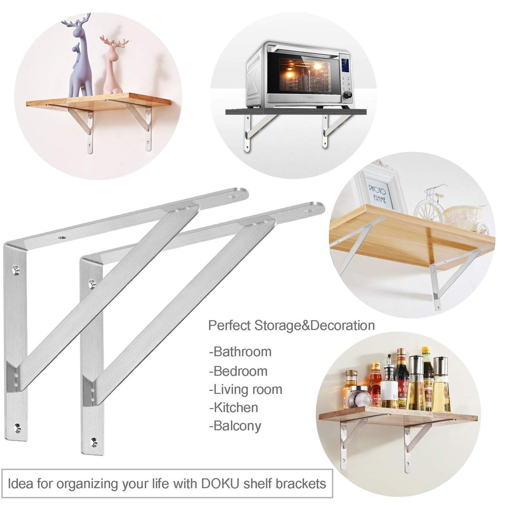 ✔STURDY &STRONG - The heavy duty shelf brackets that made of premium stainless steel will remian its good look for a long period. NO BEND, NO RUST, NO TARNISH OR CORROSION with brushed nickel finished! It makes the bracket good quality with high hardness, sturdy and strong bearing force, strong capacity could hold up to 400LBS. ✔SPACE SAVING - The folding shelf bracket hinges lock at 90 degrees.Great to use for decoration and space saving.Just open it for work and folded if down for space saving. Ideal for making a workstation in your garage, a folding study table for your , bench in your backyard, clothes table in laundry room, bookshelf, kitchen shelf, exhibition stand, etc. ✔EASY INSTALLATION & USE -The shelf brackets are suitable for DIY jobs, each package will contain premium quality anchors, screws and installation manual.This shelf bracket is designed to fit nominal size. Shelf bracket: 12 x 8 inch, which is suitable for installing 14”wide lumber board sold by Homedepot.(Wood plank is Not included). ✔TRIANGULAR DESIGN - Wall shelf brackets are designed by triangular structure, provide good stability.90 degrees close to the wall, stable without shaking and tilt.Maximum load is 450lbs per pair.Just install with a wooden plank and use the shelves to display photos, keepsakes, plants, other decoration pieces or use as a workbench. Hang wall mounted shelves in your bedroom closet,family room, or dining room. ✔MONEY BACK AFTER SALE SERVICE - 90 days return and money back if you don't like it. free .Any issues of the product, please us! DOKU provides any in future use. Just feel free to us once you have any problem. Backed by DOKU’s Limited .
