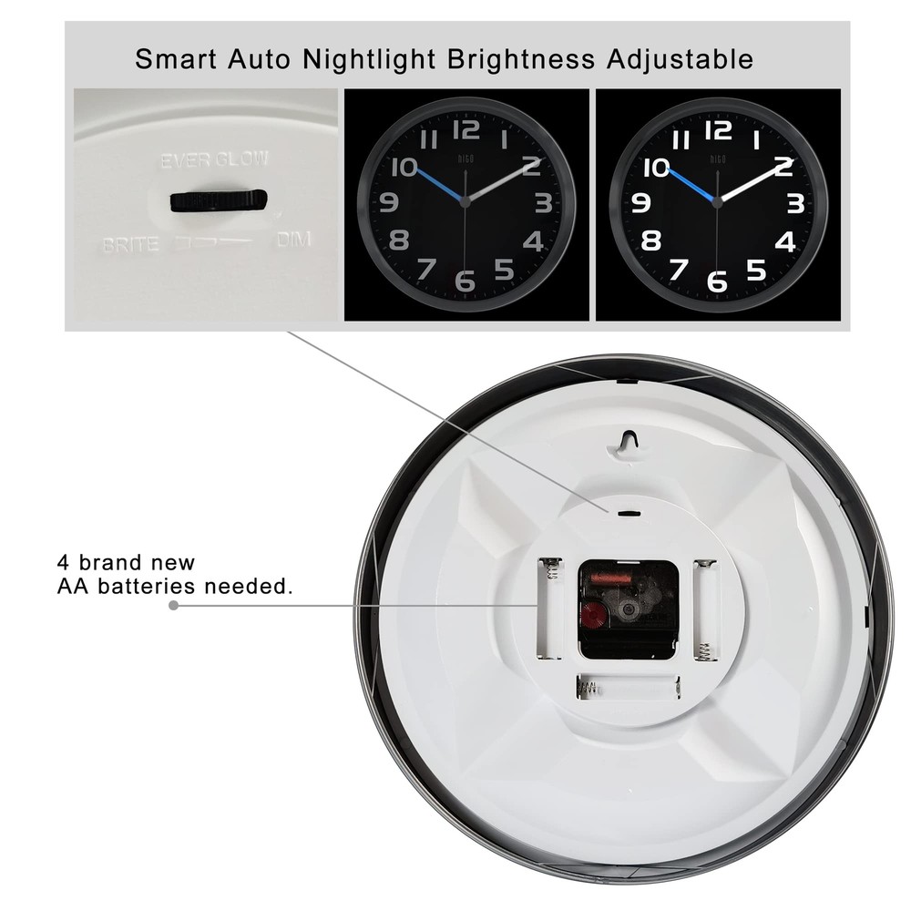 Note: ht2001: hour hand, minute hand and 1-12 numbers on clock dial luminous; ht2002: hour hand and minute hand luminous. Sensor Nightlight: You can read time clearly in darkness. There is a light sensor on the clock face. So, in the dark, hour hand (turn BLUE), minute hand (turn WHITE) and 1-12 numbers on the clock dial (not with model ht2002) light up. Notice: During the day time or when It's bright around, the clock won’t light up with the light sensor, to save battery energy. Brightness Adjustable: In darkness when the clock lights up, the brightness is adjustable with the brightness controller located above the battery compartments. Q& A: Q: Why the luminous hand blinks sometimes? A: It’s very likely that the second hand passes by and blocks the light from the luminous hand. And it looks like the luminous hand blinks. It’s back! We know how much you missed this wall clock. Yes, the one with smart Auto nightlight. Finally a wall clock you can read time clearly in the night with. You know what, you can also adjust brightness of the smart auto nightlight. Isn’t it thrilling? Most importantly, we sell only silent non-ticking wall clocks. For details: We use different colors of light to distinguish hour hand from minute hand. Blue for hour hand and White for minute hand. And we have two models to choose from. ht2001: both Hands and Numbers Illuminate; while ht2002: Hands Illuminate. The clock needs 4 brand new AA batteries. Insert one AA battery into each battery compartment. Please pay attention to the battery polarity. Notice: During the day time or when It’s bright around, the clock won’t light up with the light sensor, to save battery energy.