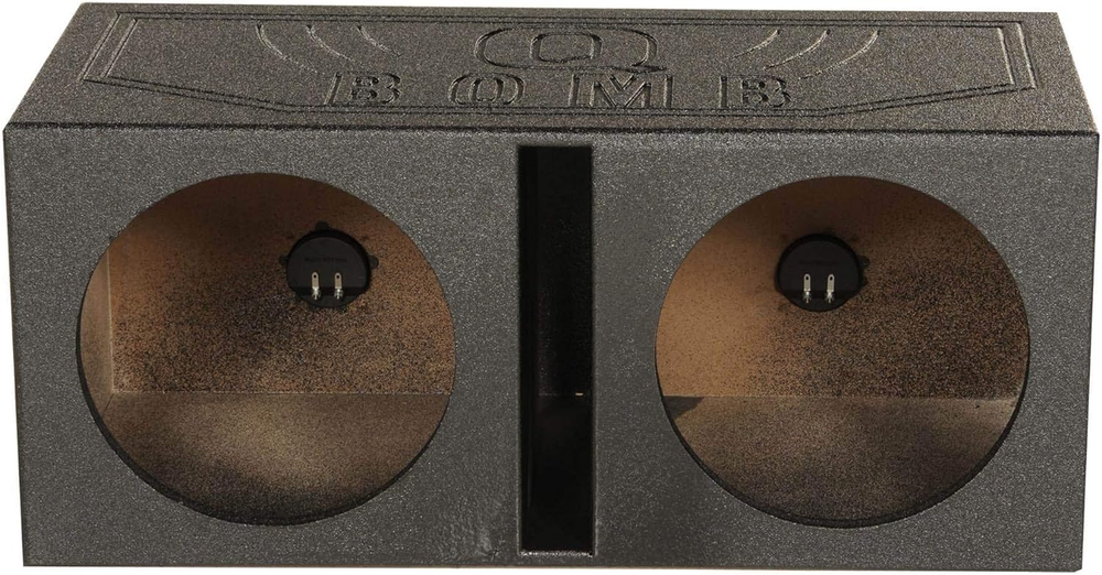 Dual 12 Inch Sub Box vented enclosures designed to hold 2 Subwoofers (not included) playing your music; Rock out and let the streets hear your anthems Dual-chamber design of 12 inch speaker box makes your sound twice as hard; Strong bass and smooth audio enhancement by your 12 inch subwoofer box will make your ride twice as fun Keep yourself and your 12in car speakers safe with a shared slot port vent design inside the 2 12 inch subwoofer box that ensures the speakers stay cool Put some class in your car with the 12 inch subwoofer enclosure built with durable black bed liner spray finish; Impress your friends and family with a stylish yet tough 12 inch subwoofer speaker box Dimensions (L x W x H): 14 x 32 x 13.25 inches, Cutout diameter: 11 inches, Air space (per sub): 1.5 cubic feet, MDF construction: 0.75 inch, Tuning frequency: 40 hZ Product Description Durable Bedliner Spray Finish Behind Seat Design