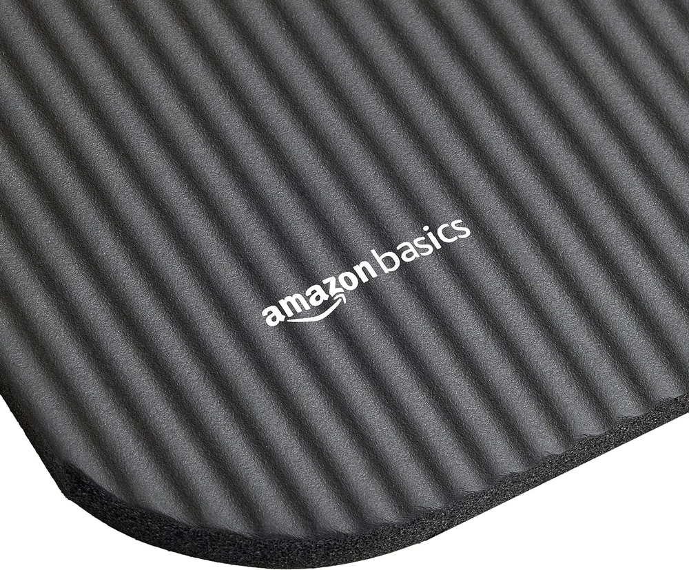 100% NBR foam Imported Extra thick, cushy floor mat in Black for yoga, gym, and everyday exercise 1/2 inch thickness offers comfortable padded support and shock absorption; textured surface provides extra traction Durable foam construction offers stretchability and springs back into shape Elastic strap for secure rolled-up mat storage and easy over-the-shoulder carrying Wipes clean easily Product Dimensions: 74 x 24 x .5 inches (LxWxH) Product Description Amazon Basics 1/2-Inch Extra Thick Exercise Yoga Mat From the Manufacturer Amazon Basics