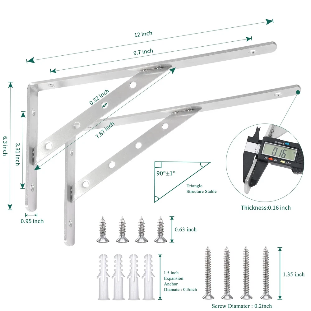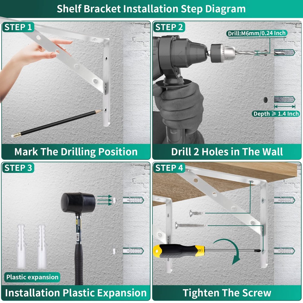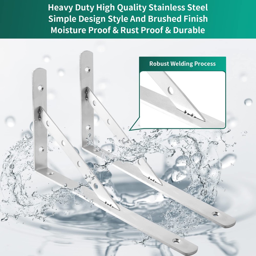 [Sturdy] The metal shelf brackets is made of high quality solid stainless steel,with a polished and brushed surface,no coating,no painting, wear resistance,corrosion resistance,and rust resistance. [Welding bracket] Large l brackets corner bracket adopts double sided multi point welding technology,welding is firm and durable,the 90 degree angle is stable,and has good corrosion resistance and rust resistance. [Size] 12" x 6.3",the wall shelf bracketst can bear a maximum weight of 440 lbs/200 kg,suitable for kitchens,laundry rooms,bathrooms,balconies, restaurants,garages,backyards,recreational vehicles,shops,benches and tables. [Installation]Draw the installation position of the shelf support,drill 2 holes on the wall with an M6 drill bit,then install the expansion plug on the hole,and fix it with a long screw.Install the plank and fasten it with short screws.
