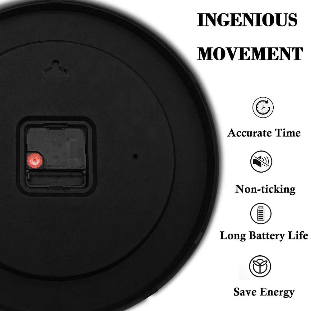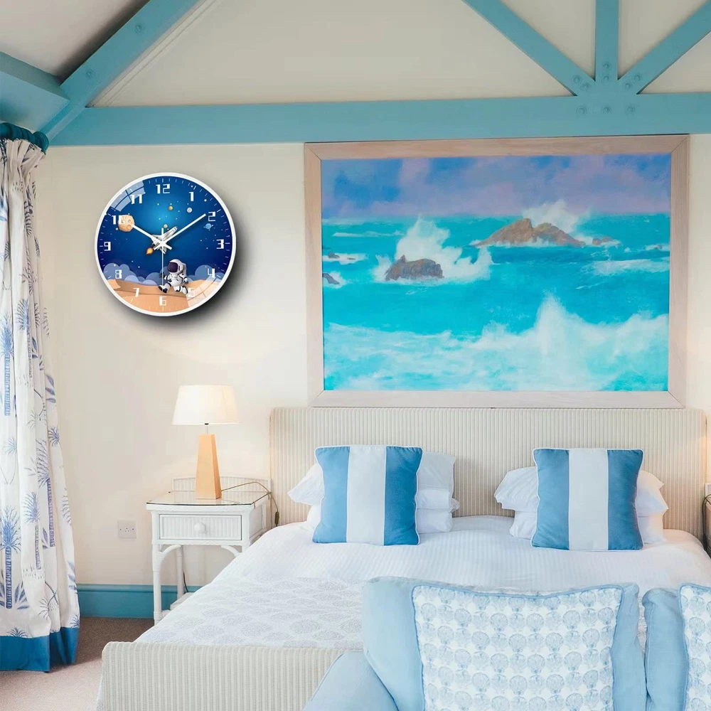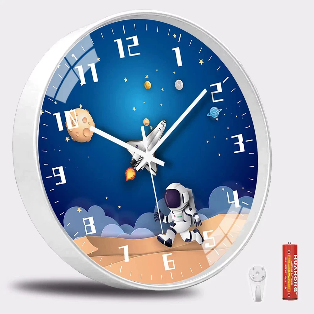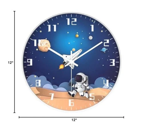 【Completely Silent Movement Wall Clock】------Precise quartz sweep movement of this kid wall clock show accurate time and is absolutely silent. non-ticking wall clock suitable for bedroom, school, living room and any other places which needs a silent environment 【Wall Clock with Unique Novel Design】------- This kid wall clock is designed by space travel theme, makes your bedroom full of vitality, and satisfies children to longing for space. Gold borders and hands are classy. Perfect color matching wall clock is made of high quality materials. 【Perfect size wall clock with Large numbers】------ Our clock with 12 inch size makes it easy to tell time ,Large white numbers and hands contrast to the white face, highly transparent glass which makes reading the time easy from any angle. Perfect boys bedroom wall clock. 【wall clock battery operated】------Powered by AA battery which included in the package. This wall clock is perfect for your children's room. Please use normal carbon battery for the clock, don't use alkaline battery and rechargeable battery which will cut down the life of the mechanism and affect the accuracy of the time.