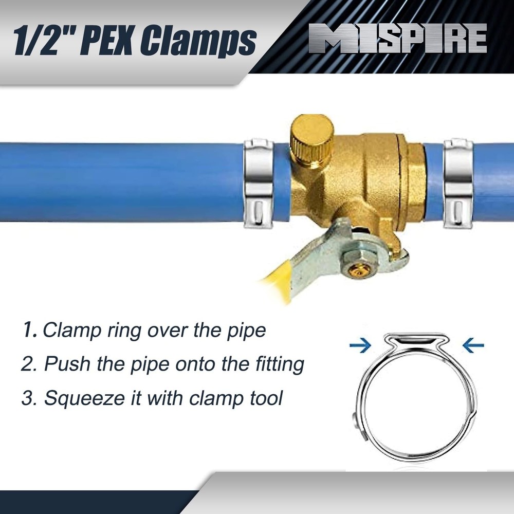 1/2 inch PEX Pipe Clamps 50 PCS, PEX Cinch Clamps Stainless Steel 304 Pinch Clamps for PEX Pipe Tubing Fitting Connections by MISPIRE Product Details Size: 1/2", 50 Pack Brand: MISPIRE MPN: MI-PC-012-50 UPC: Does not apply EAN: Does not apply Material: Stainless Steel Brand: MISPIRE Color: Silver Style: PEX Pipe Clamps Item Weight: 0.2 Kilograms Manufacturer: MISPIRE Manufacturer: MISPIRE Part Number: MI-PC-012-50 Item Weight: 7 ounces Package Dimensions: 7.6 x 5.63 x 1.14 inches Item model number: MI-PC-012-50 Size: 1/2", 50 Pack Color: Silver Style: PEX Pipe Clamps Material: Stainless Steel Shape: PEX Pipe Clamps Item Package Quantity: 50 Included Components: pex clamps Batteries Included?: No Batteries Required?: No Date First Available: September 24, 2023 [Package & Quantity] Pack of 50, 1/2 inch (17.5mm) PEX cinch clamp rings, fit for 1/2 inch PEX pipe. [Premium Quality] -High precision PEX clamps are made of 304 Stainless Steel, has good corrosion resistance, heat resistance, low temperature strength and mechanical properties, a good choice for long-term use. PEX cinch clamps are used to seal various types of pipes. [Leak-Proof & Easy to Use] -These interlocking rings provide a fast and reliable connection of all PEX pipes fittings. Form a complete 360-Degree watertight seal protection. The slide the clamp ring onto the pipe, push the pipe onto the fitting and squeeze it with a clamp tool. Provide a firm, leak-free and reliable crimp joint connection. [Widely Applications] -Widely applications in all plumbing system - Hydronic heating system, air condition system, water heater, Telecommunications electrical plumbing, food pipeline system etc. Providing a strong and reliable crimp fitting application. [Customer Service] Please feel free contact MISPIRE customer service team if any issues, we will do our best to fix the issue you meet.