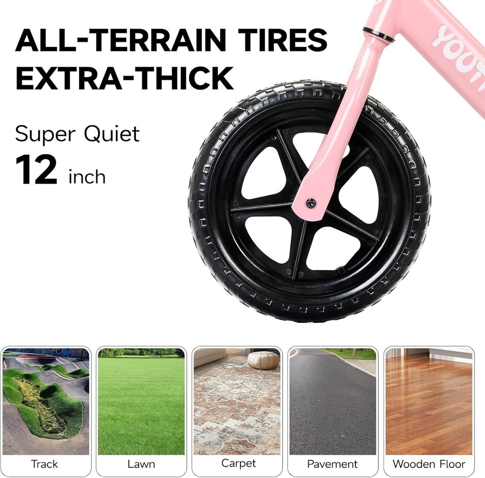 12 Inch Toddler Balance Bike for 1-3 Year Olds, No-Pedal Bike with Tool-Free Adjustable Seat, Quick Assembly, Gift for 1-3 Year Old Boys & Girls with Customizable Plate Size: KC Bike Type Balance Bike Age Range (Description) Kids Number of Speeds 1 Color Pink Wheel Size 12 Inches Frame Material Aluminum Suspension Type Dual Special Feature Lightweight, adjustable Size KC About this item Develop Balance & Coordination - The Toddler Balance Bike is expertly designed to help young children build balance and coordination. Its pedal-free design allows kids to focus on mastering balance, while the low center of gravity and adjustable seat height ensure a stable and confidence-boosting ride. Sleek & Ergonomic Design - With its modern, vibrant colors and sleek look, this balance bike appeals to both kids and parents. The ergonomic design promotes a natural and comfortable riding posture, making it easy for toddlers to enjoy hours of fun while developing essential motor skills. Durable & Reliable Construction - Weighs Up to 110 Lbs.Built to last, the balance bike features a high-quality, robust frame that can withstand everyday wear and tear. Its sturdy design handles bumps, falls, and rough terrain with ease, ensuring long-lasting durability for endless adventures. Safety First - Safety is at the heart of the Toddler Balance Bike. It comes equipped with non-slip handlebar grips, a padded seat, and puncture-resistant tires for superior traction and stability. The frame is carefully crafted with rounded edges to minimize the risk of injury, giving parents peace of mind. The Perfect Gift - The Toddler Balance Bike is an ideal birthday gift for kids, combining fun and skill development in one. Watch your child’s face light up as they unwrap their new bike, ready to explore the world on two wheels. It’s a thoughtful and practical gift that encourages outdoor play, physical activity, and unforgettable memories.
