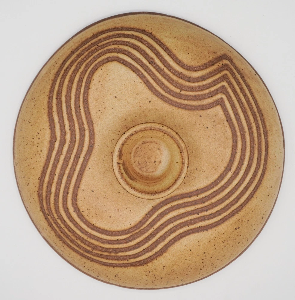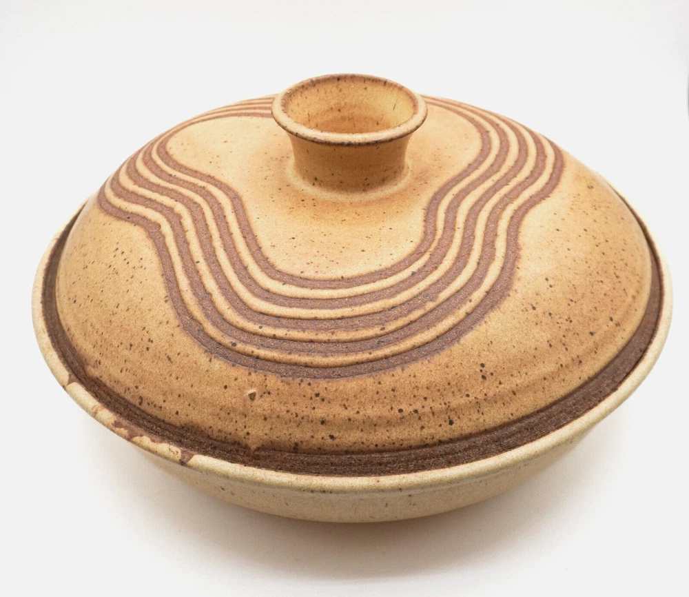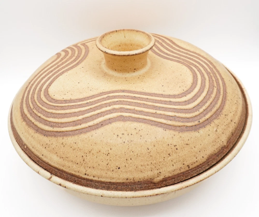 This is a stunning casserole dish made by the famous contemporary potter John Givvines of North Carolina. John was in the art department at Meredith College as well as worked in his studio, Sphericles of Rare Device. He is best known for his modern sgraffito line work as demonstrated in this dish. This piece is a base and lid. Measures 12" in diameter and 6.25" high with lid, 2.75" to the rim. It weighs approximately 6 lbs. Very heavy but a beautiful dish for serving or as a decorative piece in your home. Unsure of heat tolerance for the oven. Excellent condition with no chips, cracks, or other issues. Really remarkable work. Local pickup available or ships USPS Priority. Please let me know any questions. If at all unhappy with your purchase, please contact me before leaving feedback so that I may have the opportunity to try and make it right. I want you to be happy with your purchase!