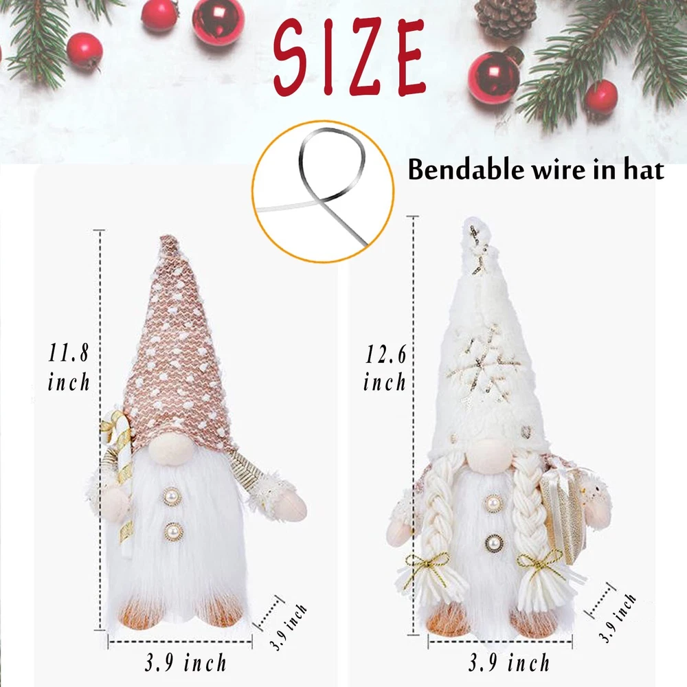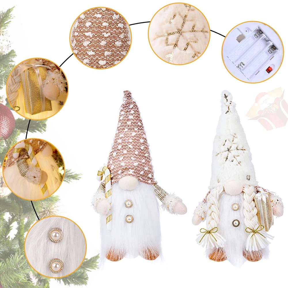Package include: 2 x Christmas Gnomes Light Up & Battery Operated: These Christmas Gnomes will glow, because there are warm white LED lights on their round bellies. You can turn on the switch of the base at night, very suitable to light up your Christmas night and spread warm in the cold winter. 3 AAA Batteries operated( not included ). Mr and Mrs Christmas Gnome: Christmas Swedish elf gnomes represent luck and happiness and protect the family from evil and misfortune, it is an ideal Christmas gift for kids, family or friends. Add a festive atmosphere to your home and bring good luck & warmth to the whole family. Premium Quality & Fine Craftsmanship: Handmade Christmas Gnomes plush are made of high-quality non-woven fabric and fiber fur material, reliable and safe, smooth and comfortable, soft to the touch. Christmas Gnomes Decorations: The couple Christmas Gnomes will be a joy to you, and give any interior an atmosphere of comfort and fairy tales. Our Christmas Faceless Plush Doll are nice for decorating your home, hall, table, shelf, tier trays, Christmas trees, Christmas stockings gift bags, and anywhere you like. The Christmas gnomes Plush Ornaments will be ideal addition to Christmas holiday decor. Ideal Christmas Holiday Gift: Christmas gnomes plush will bring fortune, love, luck, and health into your home, which are perfect gift choice for Christmas, Thanksgiving, Birthday, New Year, and Christmas holidays.