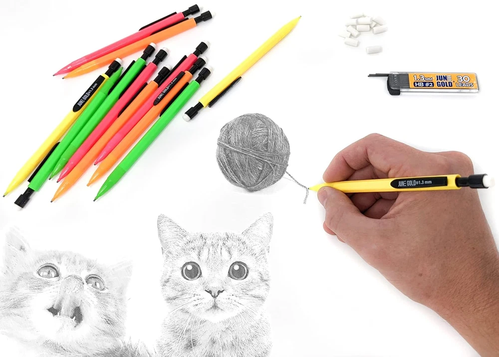 12 Pack of 1.3 mm HB #2 Refillable Mechanical Pencils Pre-filled with 2 Black Graphite Leads GRAPHITE LEAD: 1 dispenser with 30 graphite lead refills are included. Each lead is break resistant, writes smoothly, and appears dark & vibrant on paper. ERASER: 12 bonus eraser refills are included. Each eraser is durable, smudge resistant, and leaves no residue. REFILL PROCESS: Each pencil can be refilled by removing the rear eraser and dropping additional lead down the tube. You can also hold the rear clicker down and slide the lead through the front. BARREL: Each pencil sports a hexagon barrel and clip to prevent your pencil from rolling away. Product Description Premium Where it Matters Balanced, Comfortable, and Premium When it comes to mechanical pencils, we have a pencil for everyone. Our pencils come with a variety of features and sizes that will meet your needs. Compare some of our products below to find what works best for you. Refill Sizes and Hardness We offer graphite refills in 0.3 mm, 0.5 mm, 0.7 mm, 0.9 mm, 1.3 mm, 2.0 mm, 2.8 mm, and 5.6 mm. Some sizes are available in hardness HB, 2B, and 4B. Colored refills are also available in 2.0 mm and 2.8 mm. Scroll down to view a sample of these options. Important Details Graphite in HB, 2B, and 4B Pencils in 0.7 mm, 0.9 mm, 1.3 mm, 2.0 mm, and 2.8 mm Break resistant lead Comfortable pencils Premium components