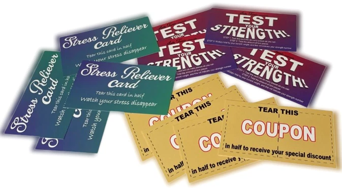 NEW 12 No Tear Cards ! One pack of 12! Hand these cards over to your friends, or leave them out for unwitting victims to find - and watch them get exasperated as they try to tear them in half! These nifty novelty cards are made up of un-tearable material - impossible to tear with bare hands! Each package contains 12 cards - 4 each of the "Free Coupon," "Stress Reliever," and "Test Your Strength." Printed in the USA. KEEP ONE IN YOUR WALLET! Sale is for 12 cards! WOW FREE SHIPPING! BEST PRICE ON EBAY or anywhere else! Robb. Sale - Clear drawer - F -1 Take advantage of this great price! Check out our other items including the Geist Visual Comedian DVD! 74 minutes of pure fun and other great comedy/magic props!