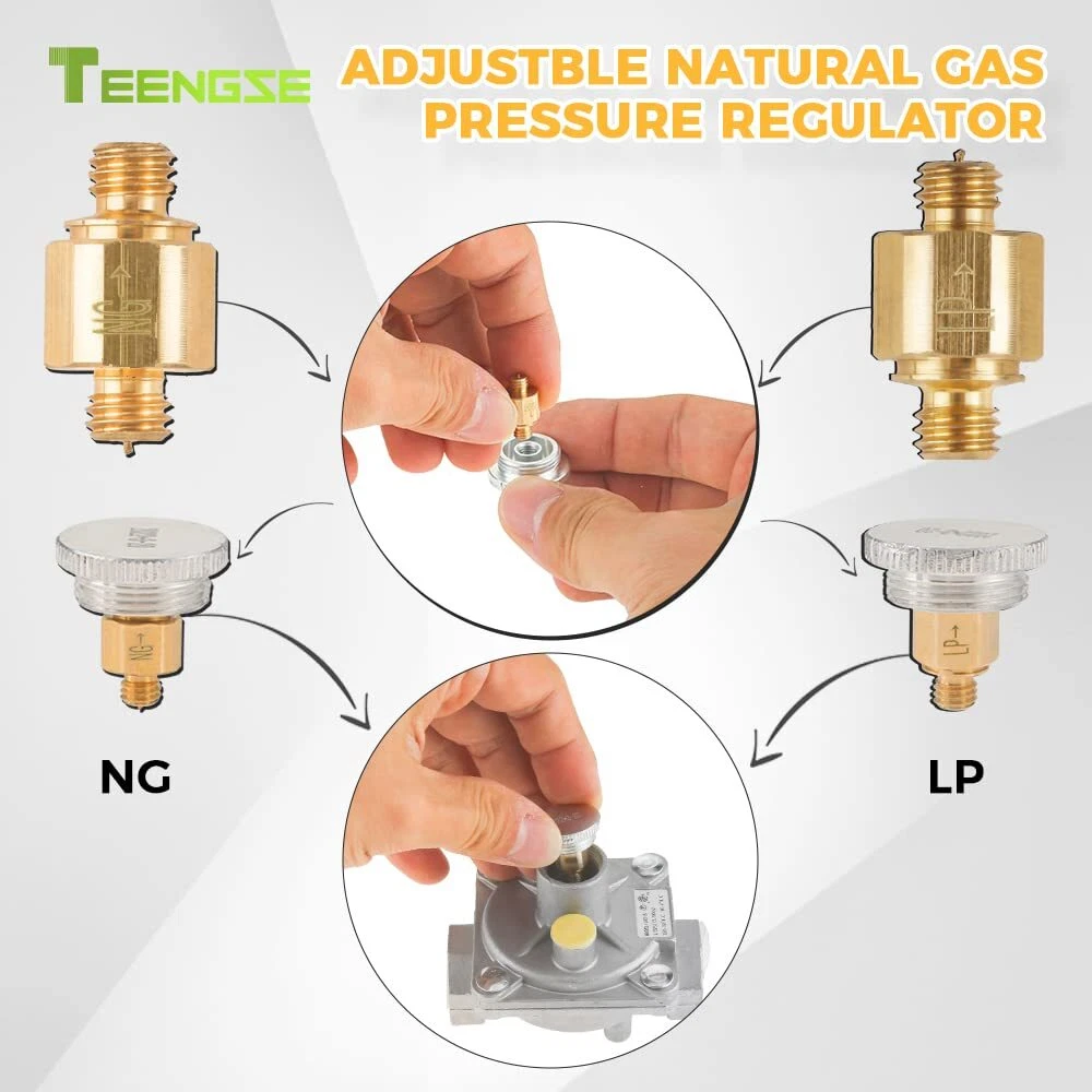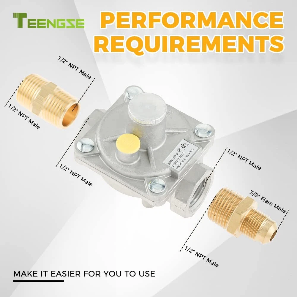 【SPECIFICATIONS】The 1/2 PSI gas regulator of the 102-B model fit for natural gas and liquefied gas valves. Both the inlet and outlet of the valve are 1/2" FPT pipe threads. We additionally furnish a brass 1/2" NPT conversion adapter-1/2" NPT male x 3/8" flare male. 1/2" NPT male x 1/2" NPT male. Plus joint thread tape. 【INSTRUCTIONS FOR USE】When the LPG gas regulating valve is used: LP inlet pressure is 2.74Kpa(11"w.c), outlet pressure is 2.45~2.55 kpa(10"w.c), and gas flow rate is 30L/min; when the natural gas regulating valve is used: LP inlet pressure is 1.74Kpa(7"w.c). Outlet pressure is 0.95~1.05 kpa(4"w.c), flow rate: 50L/min 【CONVENIENCE USE】This gas regulator is adjustable, which can be used for natural or propane application, but original setting is LP state. Please unscrew the 20.3mm diameter aluminum knob in the gas valve to switch the direction of the LP/NG copper shaft core. It is more simple, fast, and convenient. 【PERATE TEMPERATURE】32°F-225°F (0°C-107°C). Do not install the regulator too close to the heating equipment or use in very cold environment. Heat or cold can change the resistance of the spring inside the regulator. And the gas pressure regulator will not turn off the flow of gas. 【APPLICATION】This natural gas pressure regulator fit for natural gas grills, heater, oven, gas welding equipment, NG gas and liquefied interchange pressure regulator, etc.