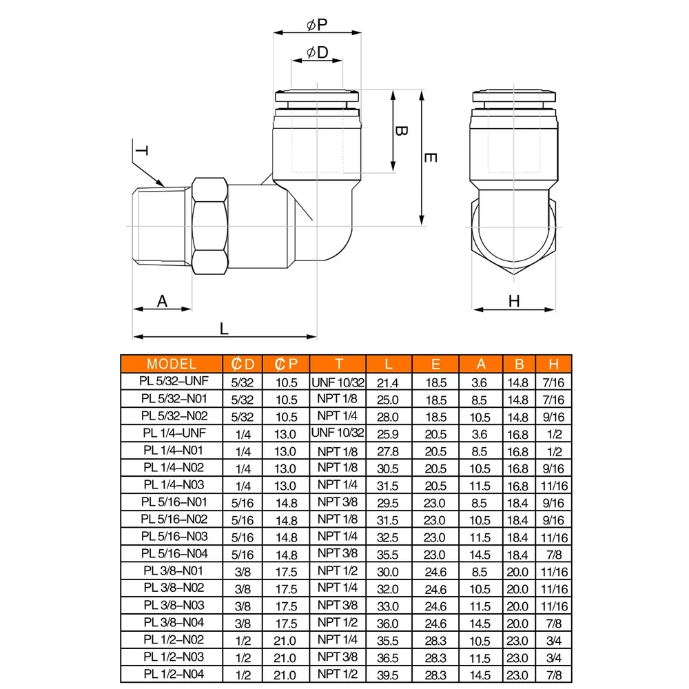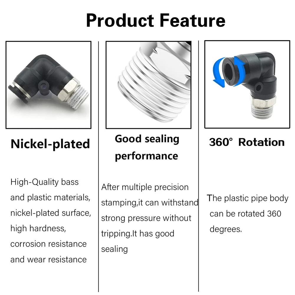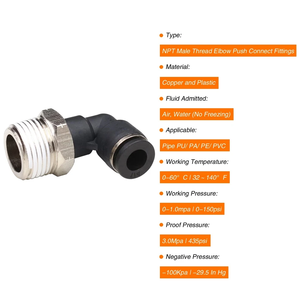 Type:1/4 Od x 1/2" Npt Thread Push to Connect Fittings; Body Style: male 90°Degree Elbow ;Made of quality plastic and stainless steel; corrosion resistance, ductility 1/4 Od Air Fittings Fluid Admitted: Air, Water (No Freezing); Applicable: Pipe PU/ PA/ PE/ PVC; Working Temperature: 0-60°C | 32~140°F;Working Pressure:0-1.0mpa | 0-150psi; Proof Pressure:3.0Mpa | 435psi; Negative Pressure:-100Kpa | -29.5 In Hg The 1/2 Airline Push fittings are available in various styles and models ,All models of push in connectors are designed to suit your pneumatic piping needs perfectly Easy to install to 1/4 OD tubing and removed, even can change the tube connector direction after installation easily,360-degree rotate freely The release ring of Pneumatic Air Tube 1/4 od Fittings conforms with the ellipse design to ensure that the disconnecting unit is in good shape;offering good seal property