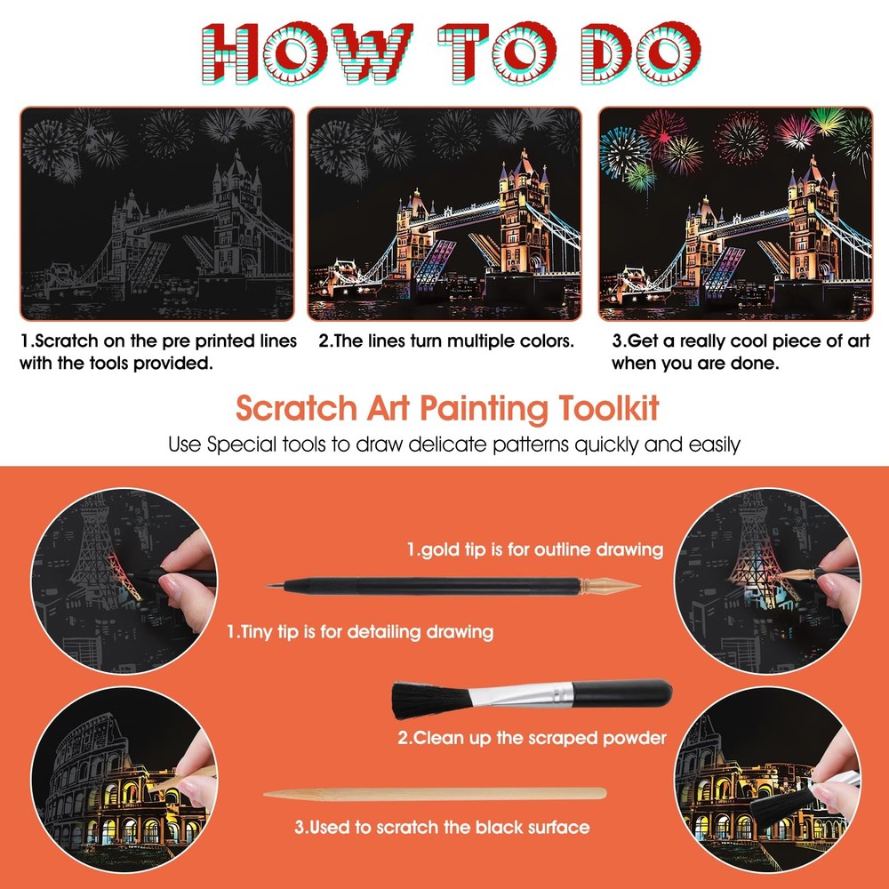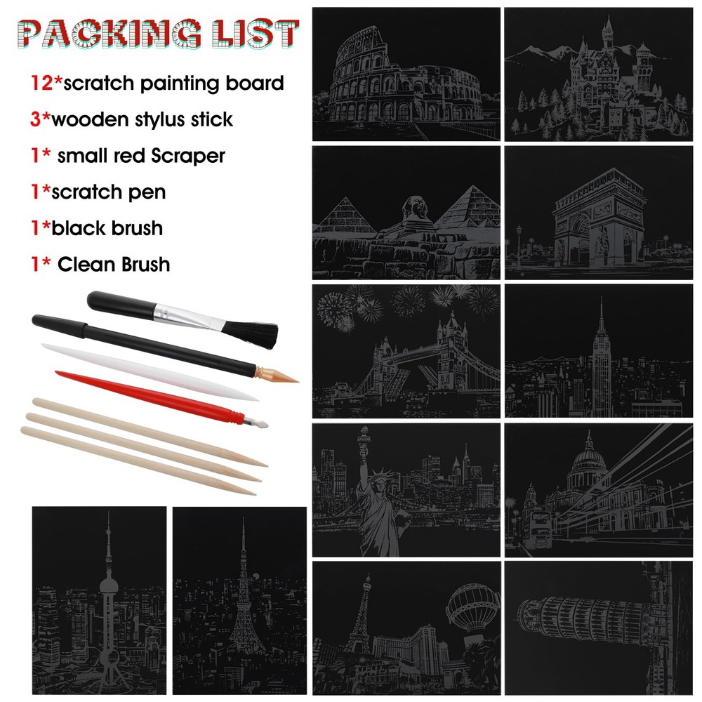 eBay Product Listing Welcome to Your Favorite My Store Your satisfaction is our top priority – Shop confidently 12 Pcs Scratch Art Paper Rainbow Scratch Paper with Scratching Tools Kit World Famous City Landmarks Scratch Art for Adults and Kids(A5 Size) Item Gallery Item Description Package Includes: you will receive 12 sheets scratch art paper (A5: 20 x 14cm/7.8 x 5.5in), 3pcs scratch pens (black, red, white), 2pcs wooden stylus for scratch art, 1pcs cleaning brush, which can meet your needs Different DIY needs High-Quality Material: these scratch art for adults are made of non-toxic colored hardboard and coated with black coating, which is safe and healthy for the human body and the environment, you can use it with confidence Easy to Use: you just use the wooden stylus to scratch on the cardboard, leaving the background surface, revealing a whole new world, easy to use and very artistic Widely Applicable: this rainbow scratch art for kids can not only be used to cultivate children's interest in painting and develop their creative and hands-on abilities, it is also a very good decoration, helping to relieve stress and relax Fun Gift: the magical scratch paper is great for creative and fun activities, and when you match the cards with the frames, they make a perfect gift for friends, kids, or family Special Features Specifications: Product name: 12-piece scratch paper set + pen set Product color: black Product material: paper + alloy Product packaging size: 27*20*1.9cm/10.6*7.8*0.74in Product size: Scratch paper: 20*14cm/7.8*5.5in Pen: Wooden: 14*0.5cm/5.5*0.19in Red: 13*0.8cm/5.1*0.31in Black: 17*0.8cm/6.7*0.3in White: 13.7*0.8cm/5.4*0.31in Brush: 12*1.5cm/4.7*0.6in Packaging list: 12 pieces of urban scratch-off set + pen set Our Guarantee To You We offer fast shipping, free delivery, and 100% customer satisfaction guarantee. Not satisfied? Return your item for free within 30 days. 30-Day Free Returns Shipping Details Items will be sent to your eBay address. Please verify before purchasing. Typical delivery within 3-7 business days. Professional shipping services used for all orders. We ship to the continental US (48 states only). Unable to deliver to Alaska, Hawaii, or territories. No APO/FPO or PO Box deliveries available. We use eco-friendly packaging Payment Options We accept these secure payment methods: All transactions securely processed through eBay's payment system. Simple Returns 30-Day Satisfaction Promise Contact us through eBay messages within 30 days of delivery. We'll provide return instructions and our address. Return the item in its original condition. We'll process your refund within 48 hours of receiving the item. Get In Touch Have questions about your order? Contact us through eBay messaging for prompt assistance. We typically respond within 24 hours.