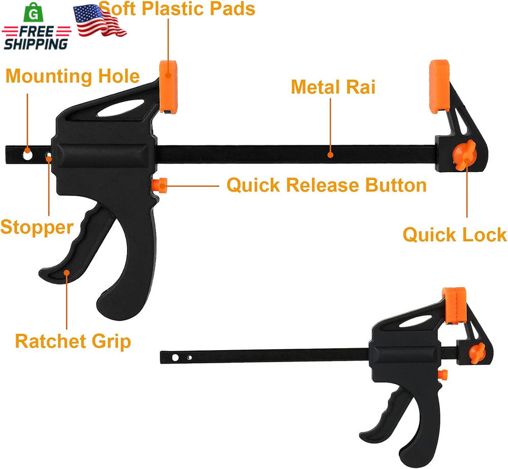 Store New Arrivals Add to Favorite View Feedback Contact 12 Pack 4 Inch Bar Clamps for Woodworking Quick Grip Clamps Trigger Clamp One Handed Ratchet Clamp, Mini Small Bar Clamps for Craft Wood Clamps for Gluing Description Item model number 4 Inch Bar Clamps for Woodworking Part Number DOUS-BarClamp-4inch-12pcs-210710 Style Modern Item Package Quantity 1 Color Black Set Name 12 Pack Brand LISHINE Material High Speed Steel Batteries Required? No Tensile Strength 65 Pounds Item Weight 0.87 Kilograms Batteries Included? No Package Dimensions 8.62 x 8.58 x 2.87 inches Manufacturer DAOST 【Bar Clamp 4''】Wood clamps woodworking capacity up to 4 inch. Throat depth: 1.25inch. 【Powerful Clamping Force】4 inch trigger clamp with up to 65lbs of squeezing force and a metal ratcheting mechanism, suit for light duty works, woodworking F clamps and DIY carpentry. 【Clamp And Spreader】4 inch quick grip clamps for woodworking is used in two ways, clamp or spreader. Easy to reverse jaws can turns clamp into spreading clamp or stretching tool. 【One-Handed Clamp】One handed release F clamp is adopted new grip and trigger design provides simple, you can operate with one hand. Spreader bar grip is comfortable to hold, press quick-release button to slide arm into desired length. 【Durable And Sturdy】Mini bar clamps are made of nylon body and high-quality hardened steel that provide great impact resistance. 4" One Hand Clamp/Spreader Woodworking Clamps, 65 Lbs Clamping Force, E-Z Hold Bar Clamps Set, Light Duty, 8-pack Light Duty, Ideal for Small Workplaces and Projects. Just simply press the button, then you can quickly release and adjust the clamp bars. The bar clamps can be easily converted to a spreader clamp. The main handle is perfect for ratcheting this clamp to the right amount of pressure. Soft jaw pads offer sure grip, but won't damage surfaces. Great woodworking tools for hobbyist, carpenters, cabinet makers, woodworkers, metalworkers and professional trades people of all types. Wide Application: - Light duty woodworking - Cabinetry - Metalworking, and other DIY needs Specification: Total length: 7.6inch/195mm Clamping Capacity: 4 inches Maximum Spreading Capacity: 8 inches Throat Depth: 1.25 inch ABOUT US We offer the best prices around on high quality products. Our E-store includes media such as books, movies, music and games while offering electronics, toys, sporting apparel, clothing, tools, general home, garden items and more. SHIPPING We are always working hard to ensure your package arrives as soon as possible. Please understand that some factors like weather, high postal traffic, and the performance of shipping companies are outside of our control. We offer free shipping to the lower 48 states and ship within 2 business days of payment, usually sooner. We do not accept P.O. Boxes. Please provide a physical address. For shipping outside of the continental USA, we only use eBay's Global Shipping Program.The item is shipped to KY and then sent to the rest of the world. International customers are responsible for all duties and taxes. Continue to check out in order to calculate costs for shipping the item to your country. Messages regarding eBay's Global Shipping Program MUST be directed at eBay EXCLUSIVELY. RETURNS We offer a 30-Day Return Policy on items which you are not completely satisfied with. You have the option for a full-refund or an exchange of the item. No returns are available on items shipped outside of the USA. PAYMENT We accept PayPal. CONTACT US This page content is yet to come Please ad us to your favorite seller and visit again later Thank You CUSTOMER SATISFACTION We try our very best to make sure every customer is completely satisfied. If there's a problem, message us! We're happy to help. WE ACCEPT Copyright © 2021 AutoDS. | All Rights Reserved