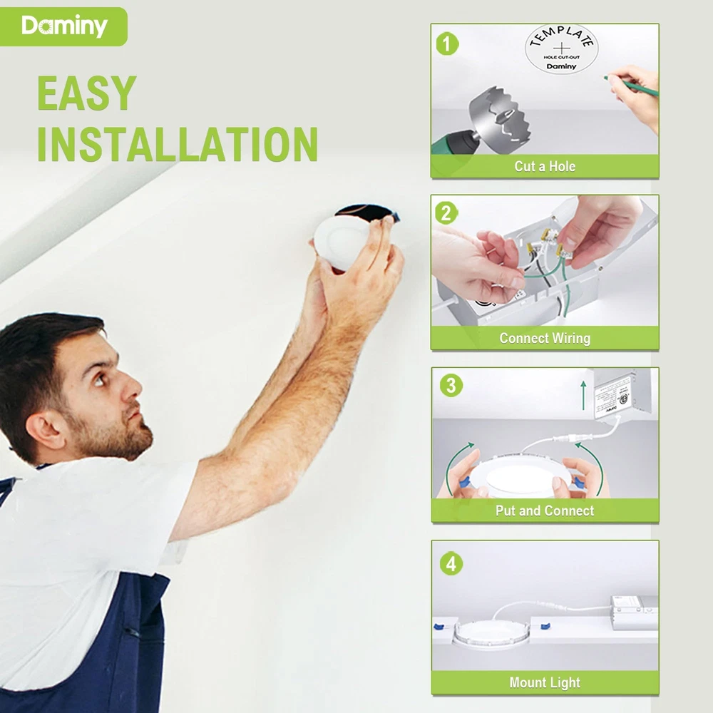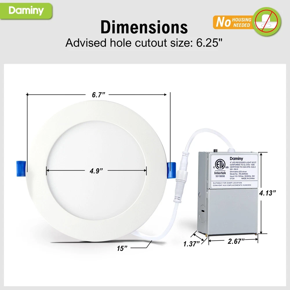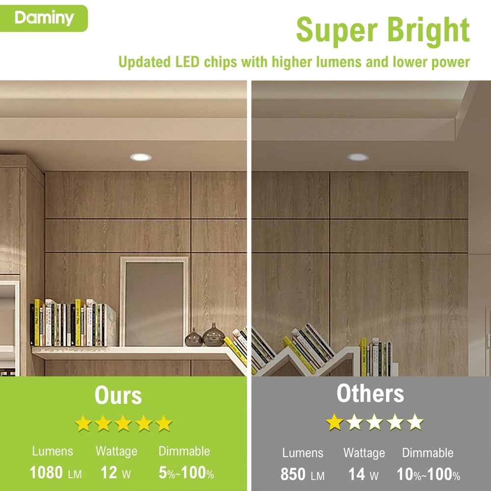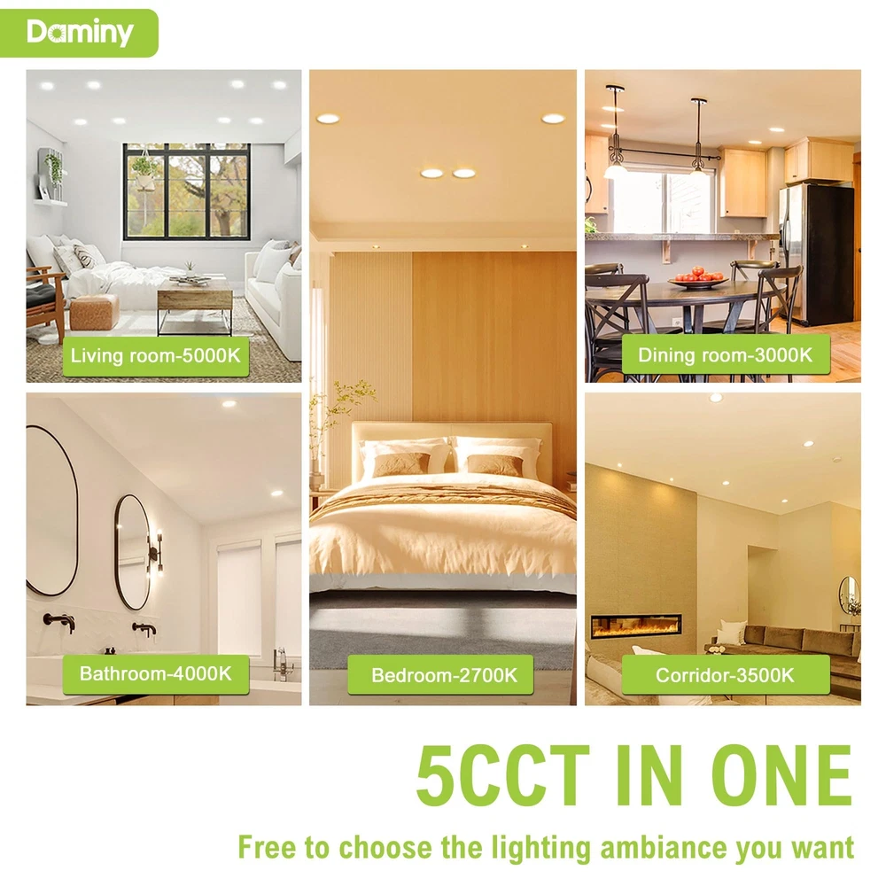 【5 CCT-in-1】recessed lighting 6 inch has five color temperature options (2700K/3000K/3500K/4000K/5000K) for different the application scenarios, wafer lights give you a unique home.Do not worry about what color temperature to buy, eliminates the hassle of returning or exchange products due to inappropriate color temperature. 【Easy Installation】The canless recessed lighting 6 inch is suitable for renovation and new decoration: a hole is cut in the ceiling with a 1:1 hole template; Connect the Jbox to the cable; Attach it to the ceiling with spring clips. Easy and efficient,recessed led lights installation can be completed in minutes. Suitable for all kinds of ceilings and joists, canless lamps will be your new choice. 【High Brightness】The canless recessed lights use the world's leading LED chips with higher lumens and lower power. recessed lighting led 1080LM consumes 12 watts of power, equivalent to 110W of incandescent lamps, saving you up to 92% of energy costs. 【Dimmable】6inch recessed led lights has 5%-100% smooth dimming, compatible with most dimmers, moisture-proof and heat-resistant, wide brightness adjustment to meet the needs of various space use, living room, bedroom, bathroom, kitchen, workplace, outdoor soft eaves, etc., led recessed light dimmable lights up your life. 【IC Rating】 led recessed lighting 6 inch are IC rated and ETL certified, have passed strict safety certification, and are suitable for a wide range of ceiling and joist mounting lights without fire risk, so you can use them without worry.5-Year Warranty is our confidence in led recessed light.