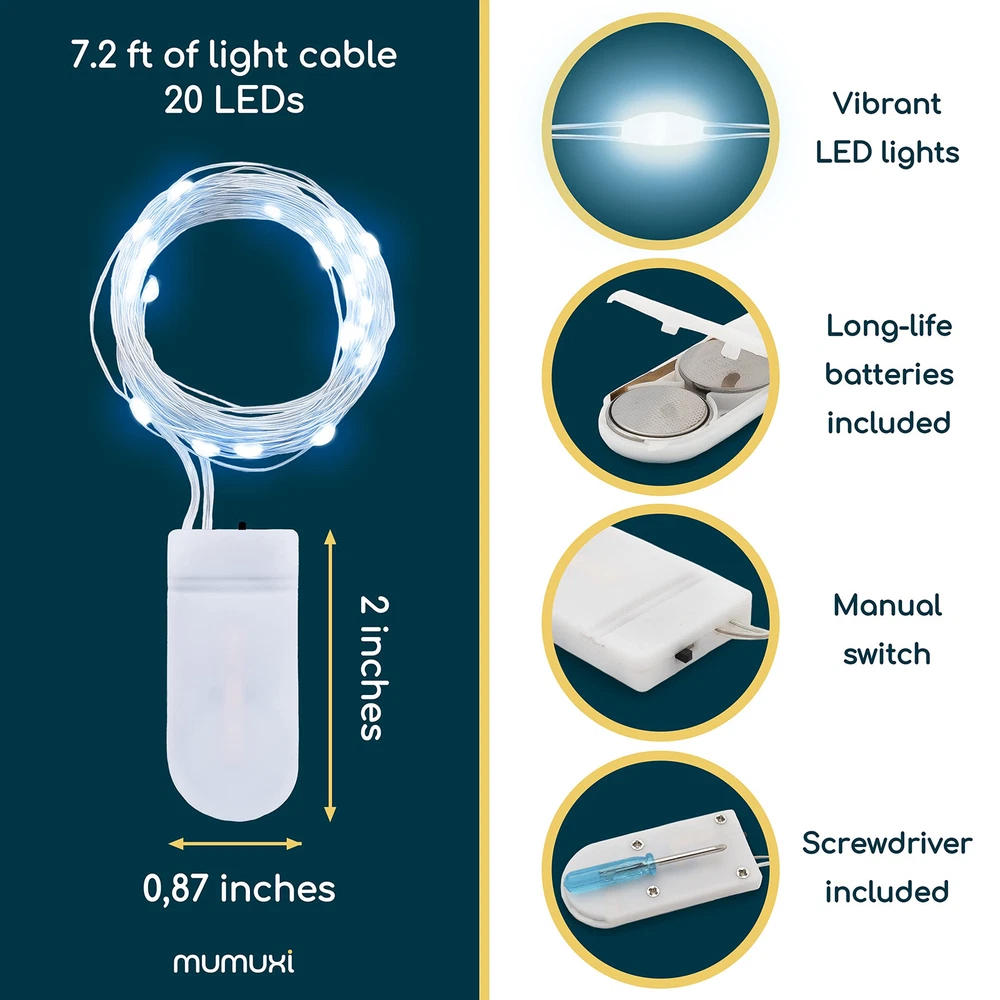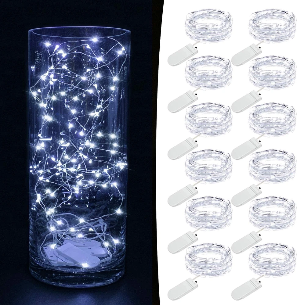 Light up your home - The 12-pack of 7.2ft mini fairy lights is a pretty addition to any home, bringing cozy and warm vibes. Add a string of 20 cool white fairy lights to a mason jar to create a lantern or a magical centerpiece table decoration for a wedding or any other party. Durable Material & Easy to bend - Our battery lights are made of high-quality strong silver wire and LED bulbs that can last up to 20 years or more! That’s a whole lot of light to brighten up your space! Place these easily indoors and bend them to your liking, and shape them around plants, furniture and walls. These small string lights come with long-life batteries as well and the fairy bulbs are made with vibrant LED lights. Easy To Use & Safe To Touch - Each of our products is high quality at and this is no exception. Save time and effort with replaceable batteries and a tiny on/off switch to turn them on for parties and switch 'em off when everyone leaves. Incredibly low voltage makes these battery fairy lights super safe in your home or place of work and carries no risks. Highly Efficient Long Lasting Batteries & Easy to Use - With the included batteries, you can supply these fairy lights to stay lit for over 72 hours! With an easy way to turn them on or off by pressing the button, these fairy lights are the perfect way to quickly change your environment from cold to cozy. Comes with a small and easy-to-hide battery box. Take them Indoors or Outdoors - Enjoy these beautiful glowing mini Christmas lights inside your bedroom or outdoors on your patio, or balcony. A waterproof and portable option so you can take it with you to your next event. Gift these to your family and friends to appeal to anyone who wants to spruce up their surroundings.