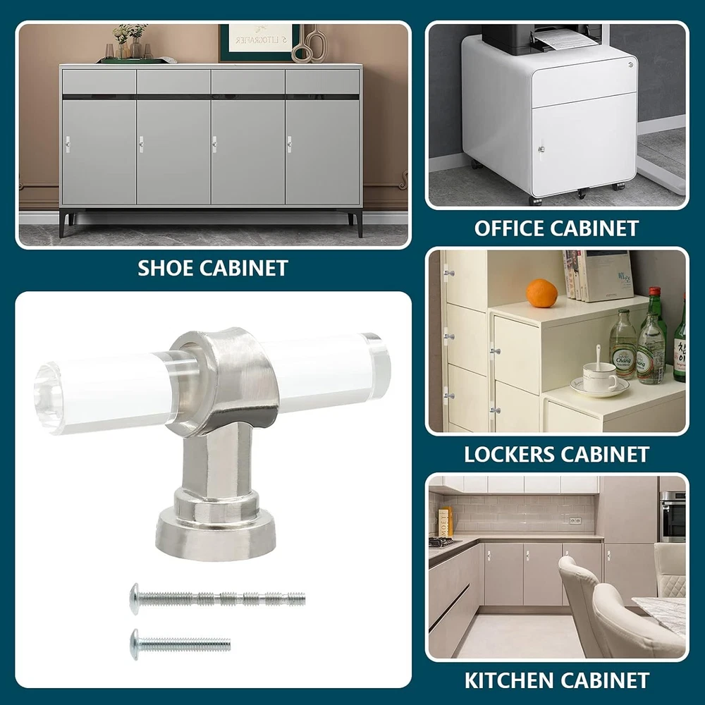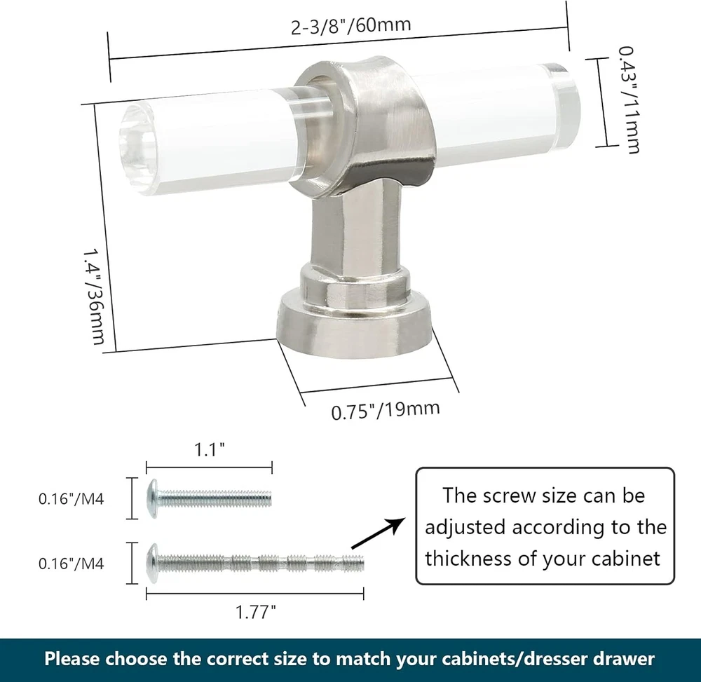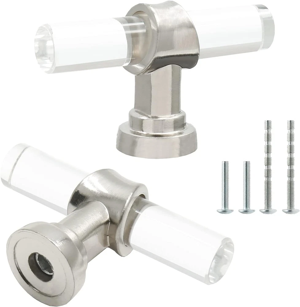 12 Pack Acrylic Kitchen Cabinet Handles Knobs Chrome Drawer Knobs T Bar Silve... T-Bar Cabinet Pulls Knobs Size: Total Length: 2-3/8"/60mm, Total Height: 1.4"/36mm, Rod Diameter: 0.43"/11mm, Base Diameter: 0.75"/19mm What You Will Get: You will get 12 pack acrylic drawer knobs, each knob is individually packaged to protect its beautiful appearance. At the same time, we provide mounting screws in two lengths, M4x1.06"" and M4x1.85"", which are suitable for cabinet doors of most thicknesses High-Quality Material: This cabinet knob is made of high-quality transparent acrylic and zinc alloy. The acrylic surface is not easy to leave fingerprints, and the brushed nickel solid zinc alloy base makes your knobs stronger and smoother. Very durable and stylish Fashionable & Elegant Appearance: Our round T-Bar cabinet knobs have crystal clear shapes and simple lines, which are very fashionable, luxurious and modern. Perfect for any kitchen cabinets, furniture doors, closets, cabinets, desk drawers, wardrobes or bookcases. Nice replacements for old cabinet knobs, give your cabinets a new looking! Excellent After-Sales Service: We focus on quality and after-sales service. If you are dissatisfied with our products, please let us know. We promise to give you 100% satisfactory after-sales service. No risk. Don't hesitate. Just buy it. Shipping We offer FREE shipping on all orders! We ship within Three business days of payment, usually sooner. Local pickups and combined shipping options are not provided at this time. Return You can return a product for up to 30 days from the date you purchased it. Any product you return must be in the same condition you received it and in the original packaging. Please keep the receipt. Payment We accept payment by any of the following methods: PayPal Please pay as soon as possible after winning an auction, as that will allow us to post your item to you sooner! Feedback Customer satisfaction is very important to us. If you have any problem with your order, please contact us and we will do our best to make you satisfied. Contact Us If you have any queries, please contact us via ebay. We usually respond within 24 hours on weekdays. Please visit our eBay store to check out other items for sale! Thank you for shopping at our store.