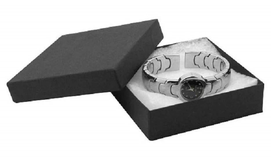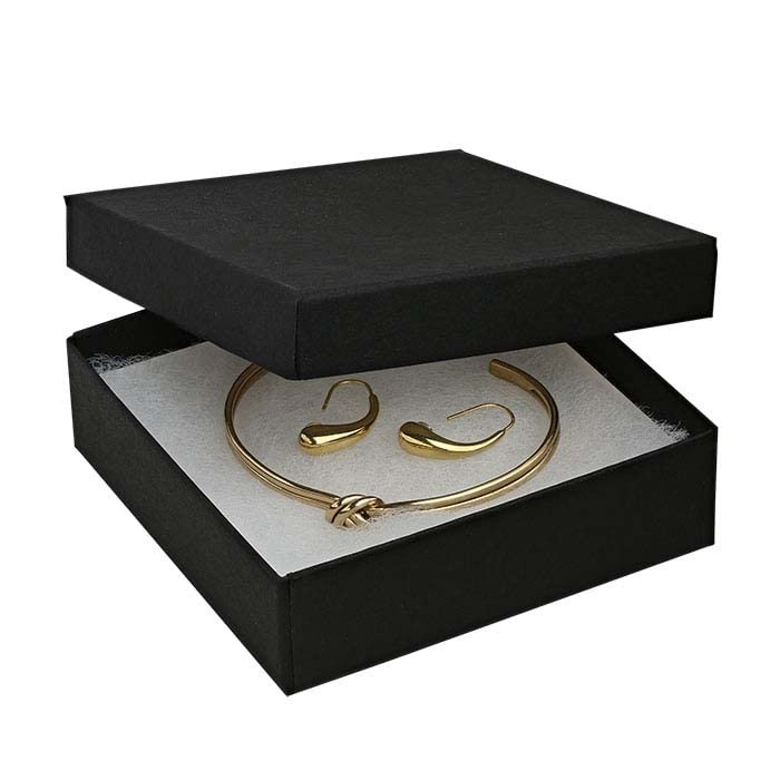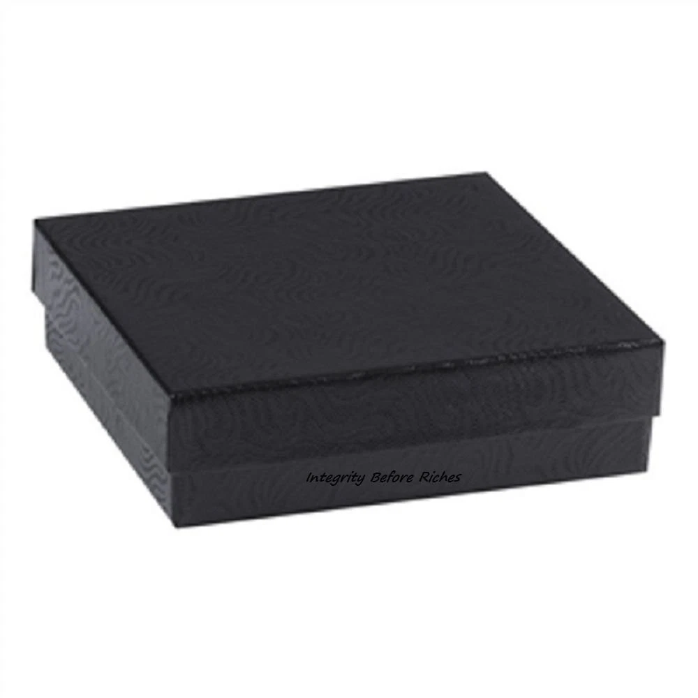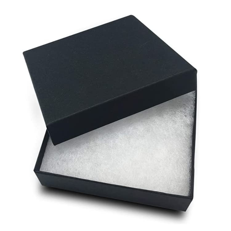 12 Pack Cotton Filled Black Matte Color Paper Cardboard Jewelry Gift and Retail Boxes 3 X 3 X 1 Inch Size This sturdy cardboard box with a unique Matte Black exterior pattern is essential for jewelry crafters, retail stores, and Etsy sellers to display their small jewelry. This handsome box can also be used as a gift box for your jewelry to further enhance the gift. Each box is lidded and filled with cotton inside to protect the contents. Smooth textured outside paper finish. Jewelry Necklace, Bracelet, Bangle, Earrings, Brooches Gift Packaging and Retail Display Boxes 【QUALITY MATERIAL】: Our Premium Matt Black Cotton Filled Cardboard Paper Jewelry Boxes are crafted using high-quality materials to ensure your precious jewelry remains safe and secure. The sturdy cardboard construction is designed to withstand everyday use while protecting your jewelry from scratches and damage 【ELEGANT DESIGN】: The Sleek Matte Black Cardboard Paper Jewelry Boxes add a touch of elegance and sophistication to your jewelry presentations. Whether you're using them for personal use or showcasing your products in a retail setting, these boxes will make a lasting impression 【COTTON-FILLED INTERIOR】: Each box is lined with soft cotton to protect your jewelry from scratches and damage. Versatile and Suitable for personal use, gift-giving, and retail displays. 【QUANTITY】: Pack of 12, Matte Black Jewelry Boxes. Our Stylish Jewelry Boxes are designed for safety and elegance. Ideal for from the Jewelry Necklaces, Bracelets, Pocket Watches, bracelets, bangles necklaces, Earrings, and Brooch to the most substantial pendants. Each purchase, , includes 12 boxes, perfect for jewelry stores, crafters, or gift-giving 【DIY Packaging Box】: Plain Jewelry Gift Boxes are perfect for adding your design artwork. You can customize and personalize these jewelry gift boxes with drawings, paintings, and stickers for personal-brand jewelry packaging for your business. DIY the jewelry gift box to be your unique jewelry box or gift box. 【SECURE LID CLOSURE】: Jewelry Display with Secure Lid Closure. Enhance your jewelry presentation with RJ Displays' Matte Black Cotton-Filled Jewelry Boxes. They feature snug-fitting lids for secure storage and are perfect for craft fairs or gifting