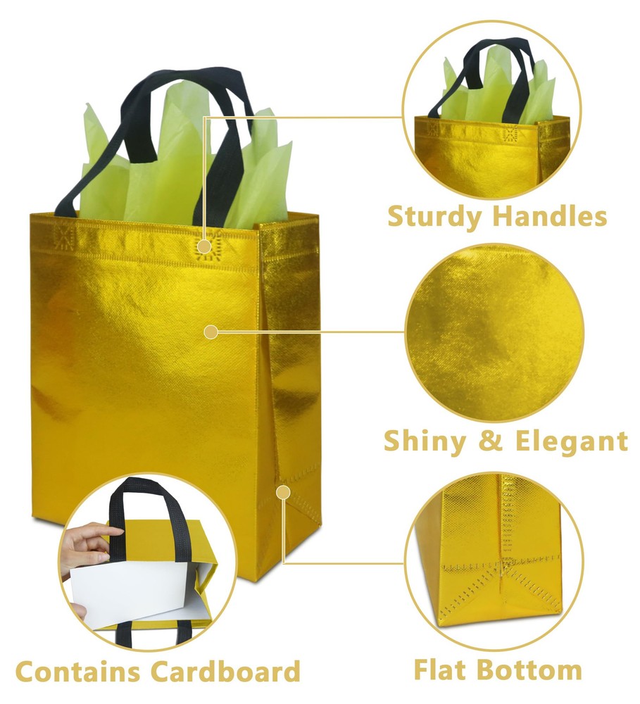 PREMIUM MATERIALS: This gold gift bags are made of high-quality non-woven fabric, so it can withstand heavier weight, stronger and not easy to break. ELEGANT & BEAUTIFUL: This shiny gift bags have a charming metallic luster on the surface, the appearance is beautiful gold, the handle is black, elegant and beautiful, fashionable and exquisite, as a gift bag is absolutely unique and attractive. REUSABLE: This reusable gift bags are made of strong and durable non-woven material, the surface is waterproof, the bottom is matched with cardboard, it can withstand heavier items, while ensuring that the bottom is flat, it can be used daily as a shopping bag, grocery bag, economical and practical. MULTIPLE OCCASIONS: This metallicl gift bags are suitable for various occasions, you can DIY various words and patterns with stickers or paint pens (please stay away from heat sources), which is very suitable for christmas, diwali, wedding, birthdays, party and other occasions. SIZE INFORMATION: The size of the gold gift bags are 8 x 4 x 10 inches/20 x 10 x 25 cm (L x W x H) , it can hold most gifts and enough party supplies.
