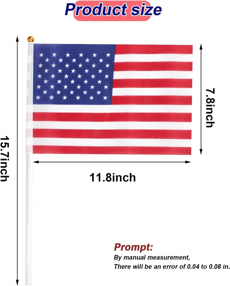 12 Pack Small American Flags Mini American Flag/Us Flags on Stick 8X12 Inch US 【High-quality Materials】: These mini American flags are made of durable polyester fabric, ensuring long-lasting use and resistance to fading. 【Perfect Size】: Measuring 8x12 inches, these handheld flags are the ideal size for displaying your patriotism in a compact and portable way. 【Pack of 12】: With this 12 pack, you'll have enough mini American flags to decorate your yard, patio, or even hand out at patriotic events and celebrations. 【Easy to Use】: Each flag comes with a sturdy stick that allows you to easily wave and display your American pride.