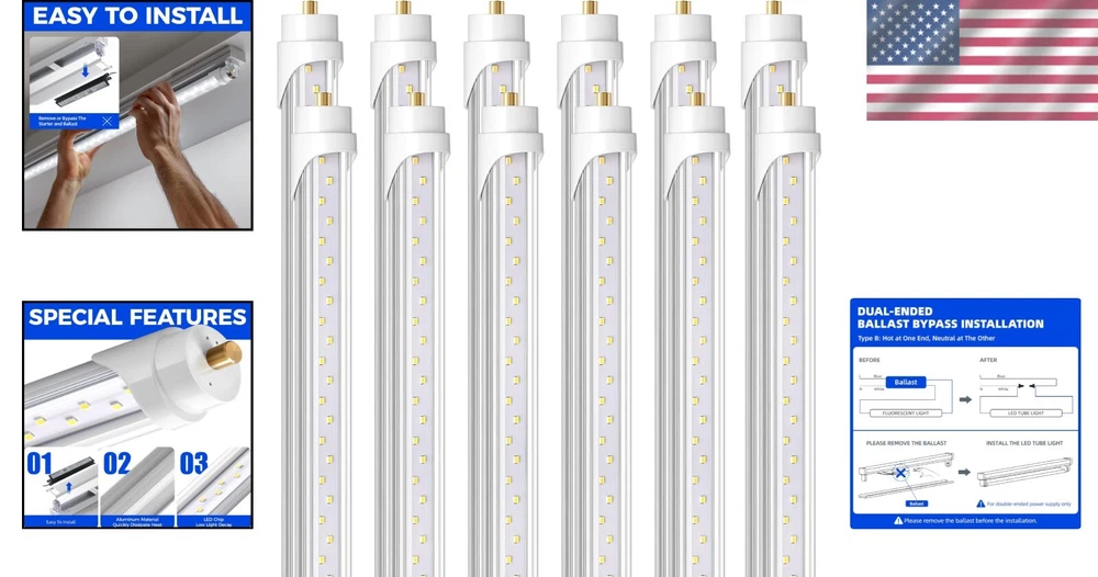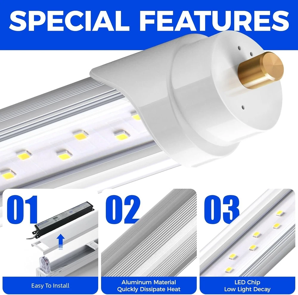12 Pack of 8 FT T8 LED Tube Lights, Clear Cover, Easy Install, ETL Listed ‹ › ‹ › ‹ › ‹ › ‹ › ‹ › ‹ › ‹ › ‹ › ‹ › ‹ › 12 Pack of 8 FT T8 LED Tube Lights Super Bright: Illuminate your space with over 5500 lumens and a CRI rating of 85+. Experience vibrant colors and enhanced visibility in your garage, warehouse, or office. Energy Efficient: Consuming only 44W, these high output 8ft tubes are equivalent to 140W fluorescent tubes. Enjoy significant energy savings while reducing your carbon footprint. Long Lasting: With a lifespan of over 50,000 hours, these LED tubes outlast conventional lighting by up to 10 times, ensuring a dependable and lasting light source. Dual Row LED Design: A wider LED board promotes excellent heat dissipation, enhancing longevity and eliminating common issues like ballast buzzing or flickering lights. Easy Installation: Designed to easily replace traditional T8, T10, and T12 fluorescent bulbs; simply bypass or remove the starter and ballast for a hassle-free setup. Safe and Eco-Friendly: Free from mercury and hazardous materials; emit no UV or IR radiation, making them safer for both you and the environment. Why Choose Our 8 FT T8 LED Tube Lights? Transform your lighting experience with our 12 Pack of 8 FT T8 LED Tube Lights. Engineered for high performance and longevity, these lights not only brighten your space but also do so efficiently, reducing energy costs and maintenance. Perfectly suitable for various applications, from residential garages to commercial settings, they redefine visibility and reliability. Illuminate your space with the power of innovative lighting solutions—order your 12 Pack of T8 LED Tube Lights today and see the difference! Shipping Free & Fast Shipping - We offer free shipping to most of the USA with a normal delivery time of 3-7 days. However, due to the current situation, additional delivery time (up to 3 weeks) may be required for some items. Alternative Carriers - We may use alternative carriers (e.g. USPS, FedEx, UPS, etc.) to ensure your package arrives safely and on time. Due to the use of multiple carriers, we are unable to provide a tracking number automatically. Handling Time - Orders are processed and shipped within 1-2 business days of receiving cleared payment. Shipping Restrictions - Shipping to Alaska, Hawaii, Puerto Rico, Guam, and other US territories may incur shipping charges or delivery restrictions. Please contact us before ordering, or your order can be refunded/cancelled. State Restrictions - There may be restrictions based on your state of purchase. For example, certain items may not be shipped to California due to state regulations. Contact for Tracking Updates - If you require tracking updates or have any concerns about the delivery of your order, please feel free to contact us, and we will be happy to assist you. Return Please see our eBay Return Policy. Thank you. Payment We accept all major credit cards, PayPal, and Apple Pay for your convenience. Your payment information is secure and encrypted to ensure a safe and seamless transaction. Please complete your payment within 3 days of purchase to avoid any delays in shipping. Feedback Your feedback is extremely important to us. We strive to provide the best products and customer service possible. If you are satisfied with your purchase, please take a moment to leave us a positive review. If you have any concerns or issues with your order, please contact us before leaving negative feedback. We are committed to resolving any problems and ensuring your satisfaction. Contact Us If you have any questions or concerns, please feel free to reach out to our customer support team. You can contact us through the eBay messaging system. We are available Monday to Friday, 9:00 am to 5:00 pm EST, and we will do our best to respond to your inquiry within 24 hours. Thank you for supporting our small family business! UPC: Not Set Size: 12 pack Item Height: Not Set Lumens: 5500 Power Consumption: 44 watts Unit Quantity: 12.0 count Occasion: Multipurpose Features: Ballast Bypass,Instant On,Corded,ETL Listed,Single Pin FA8 Base Light Color: White,Daylight White-5000K Control Style: Push Button Department: Adults Theme: Not Set Room: Garage,Workshop,Warehouse,Office Material: Aluminium and PC,Aluminium,PC Character: Not Set Labels & Certifications: Not Set Brand: Unbranded Type: Tube Light Lighting Technology: LED Light Shape: Oval Installation Area: Indoor Sensor Type: Light Color: White Power Source: AC Cord Color: Clear Number of Settings: Not Set LED String/Strip Type: Not Set Energy Star: Not Set MPN: Not Set EC Range: Not Set Voltage: 120 volts (AC) LED Chip Code: Not Set Output Voltage: 120 volts Manufacturer: Not Set Character Family: Not Set IP Rating: Not Set Amperage: Not Set Number of Lights: 12 Country/Region of Manufacture: Not Set Style: Modern Color Temperature: 5500 Kelvin Bulb Life Hours: 50000 hours Model: Not Set Unit Type: Unit