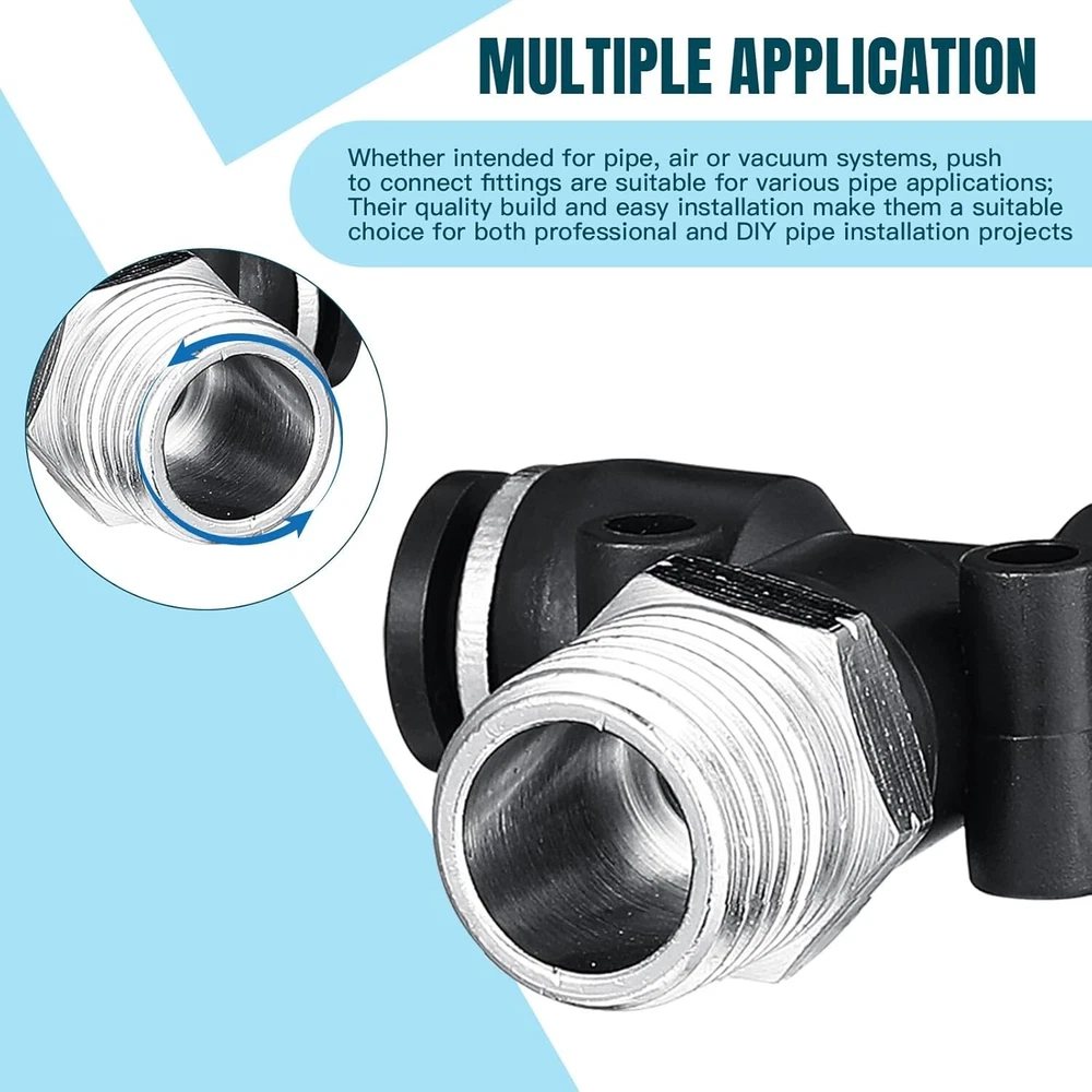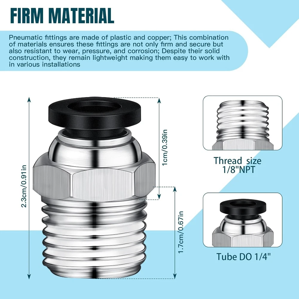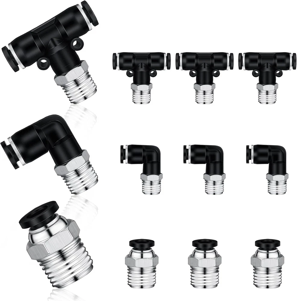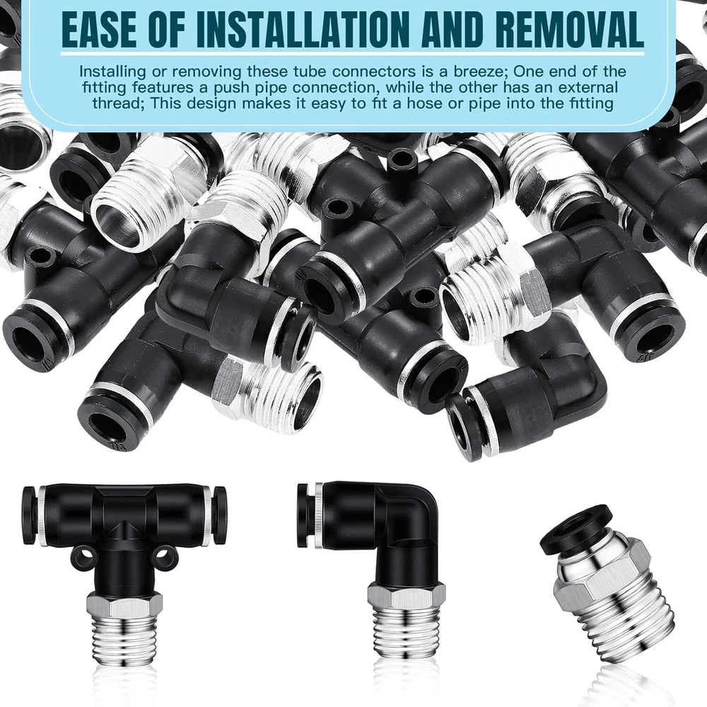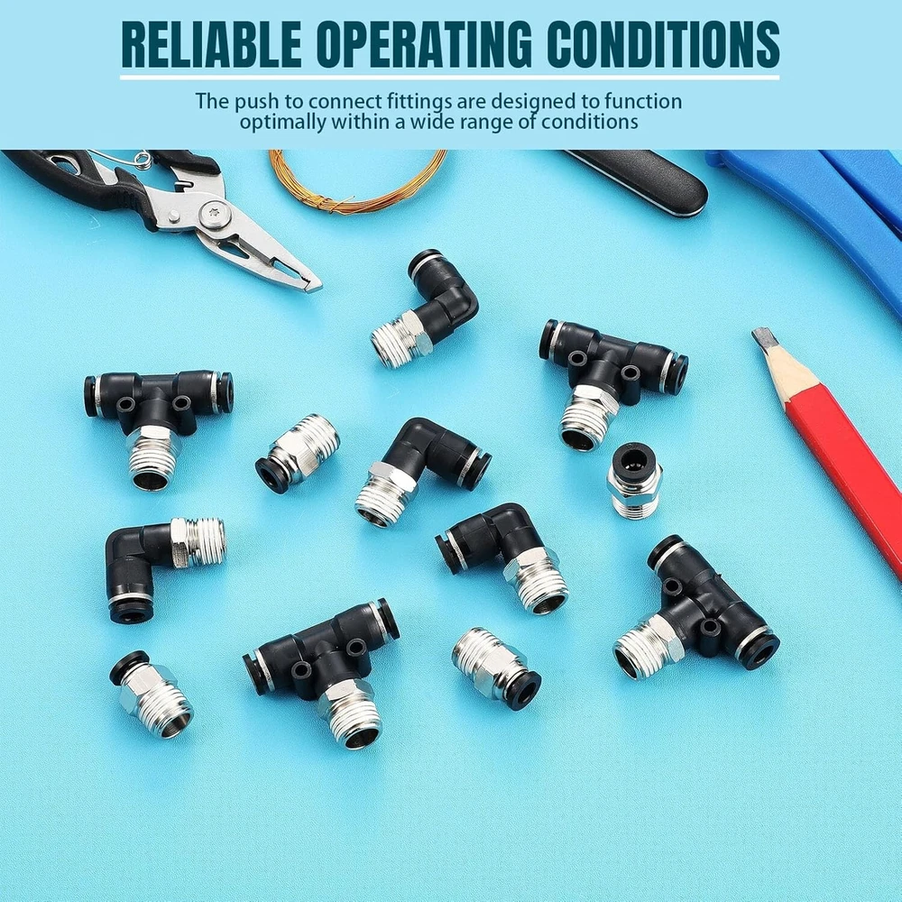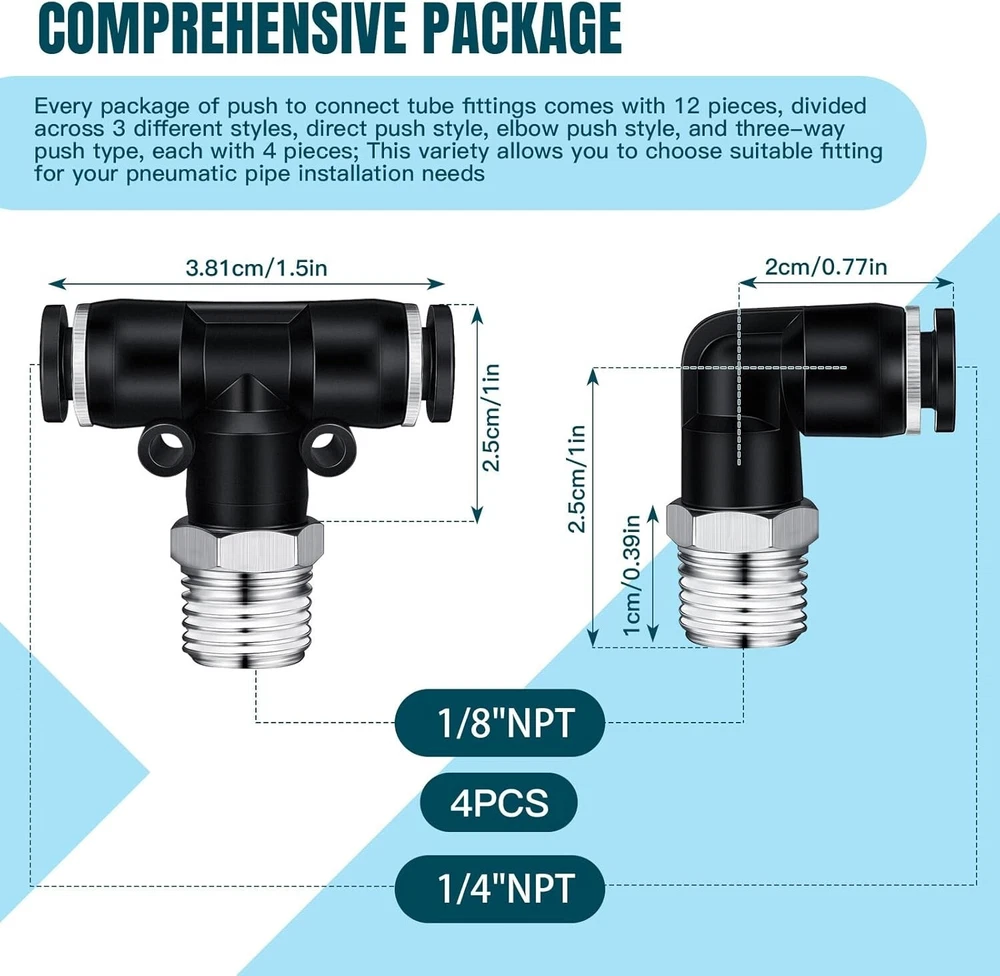 12 Pcs Push to Connect Fittings 1/4 Inch Tube OD X 1/8 NPT Air Line Fittings About this item: Comprehensive Package: every package of push to connect tube fittings comes with 12 pieces, divided across 3 different styles, direct push style, elbow push style, and three-way push type, each with 4 pieces; This variety allows you to choose suitable fitting for your pneumatic pipe installation needs Firm Material: pneumatic fittings are made of plastic and copper; This combination of materials ensures these fittings are not only firm and secure but also resistant to wear, pressure, and corrosion; Despite their solid construction, they remain lightweight making them easy to work with in various installations Ease of Installation and Removal: installing or removing these tube connectors is a breeze; One end of the fitting features a push pipe connection, while the other has an external thread; This design makes it easy to fit a hose or pipe into the fitting Multiple Application: whether intended for pipe, air or vacuum systems, push to connect fittings are suitable for various pipe applications; Their quality build and easy installation make them a suitable choice for both professional and DIY pipe installation projects Reliable Operating Conditions: push to connect fittings are designed to function optimally within a wide range of conditions, operate efficiently within temperatures between 32 and 140 degrees Fahrenheit (0-60 degrees Celsius) and pressures ranging from 0 to 159 psi or 0 to 1mpa; These parameters make them a reliable choice for various plumbing installations