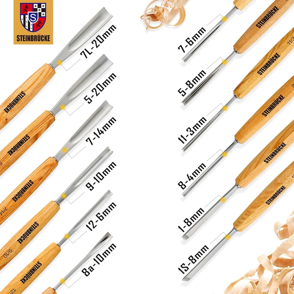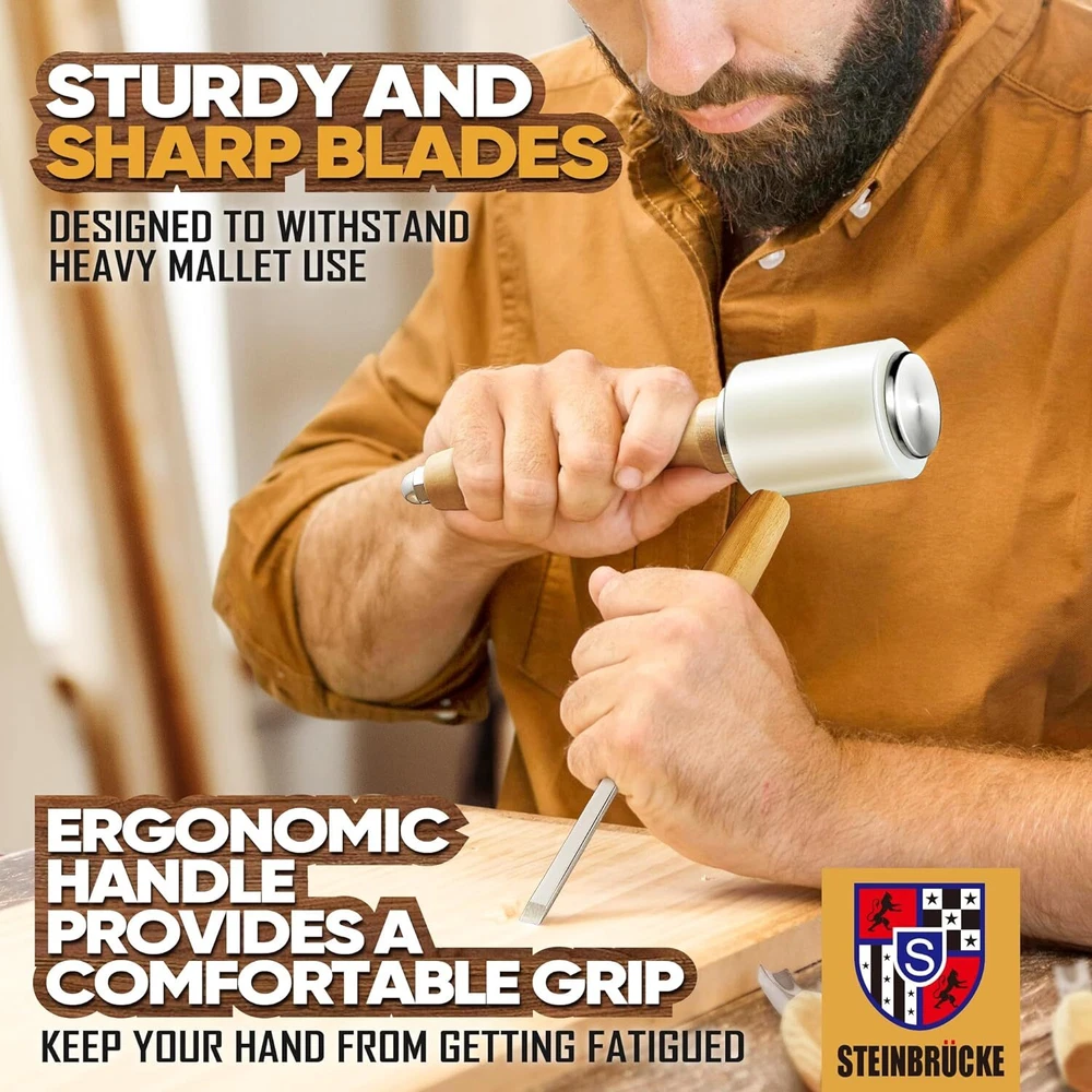 About this item 【Carve Longer】 This wood whittling kit is made from high-quality alloy chromium-vanadium steel and hardened to Rockwell C60, so blades will hold an edge for a long time and won't dull quickly with repeated use. Sturdy, hefty blades are designed to withstand heavy mallet use. 【White Wax Wood Handle】White wax wood, high bearing capacity, not easy to deformation. The wood handle surface painted treatment with high moisture-proof and wear resistance characteristics can be very good and the blades are uniquely designed with grooves on the tail, guaranteeing a firm and sturdy connection to the wooden handle, suitable for different working environment. And the octagonal handle shape prevent tools from rolling off your workspace. 【Wood Mallet】 The wood mallet head is made of wear-resistant and corrosion-resistant nylon material, which can absorb the rebound force better during percussion, so that the force can be transferred to the tool more directly, without damaging the tool. A comfortable handle and excellent ergonomics keep your hand from getting fatigued. All joints of the wood mallet adopt durable 304 stainless steel structure, and the tail is fixed with round convex nuts to ensure high reliability and durability of the product. 【Canvas Roll for Storing】 Come with a canvas roll which keeps everything organized and the blades well separated. The canvas roll is made of 400D cotton canvas, which has good abrasion resistance and softness. It is very compatible with the knife edge, and has a very good protection and storage effect on the chisel knife edge. 【Start any of your Project】This wood carving set features 12 versatile wood carving chisels you need to start any beginner woodworking project: relief carvings, wood spirits, house signs, caricature figures, bowls and spoons. It would be a great gift for beginners or experienced carver. Product Description 12pc High Quality Set of Wood Carving Tools Features Chromium Vanadium Alloy Steel High Hardness High Corrosion Resistance Ergonomic Handle High Bearing Capacity White Wax Wood Handle Come with Wood Mallet, No Need to Purchase Separately Canvas Roll Keeps Everything Organized Carved knives of different shapes and sizes meet all your needs for cutting contours and carving details Study and Sharp Made from high-quality alloy chromium-vanadium steel and hardened to Rockwell C60. The blades are uniquely designed with grooves on the tail, guaranteeing a firm and sturdy connection to the wooden handle. White Wax Wood Handle White wax wood, high bearing capacity, not easy to deformation. The wood handle surface painted treatment with high moisture-proof and wear resistance. Octagonal handle shape prevent tools from rolling off your workspace. Canvas Roll for Storing Come with a canvas roll which keeps everything organized and the blades well separated. It is very compatible with the knife edge, and has a very good protection and storage effect on the chisel knife edge. Come with wood mallet for full-size wood carving gouges and chisels Handy for jointing, perfect for chisel-cut dovetails and mortise and tenons Shock absorbent urethane striking head absorbs punishment to protect your tools so they last longer All joints of the wood mallet adopt durable 304 stainless steel structure, and the tail is fixed with round convex nuts to ensure high reliability and durability of the product. Start any of your Project