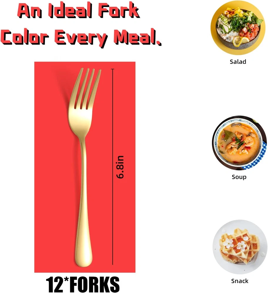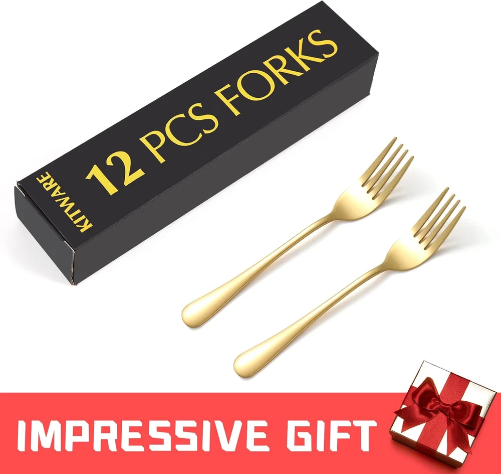 ✅Where are ALL the Forks?--Why you need more KITWARE bulk forks set? As forks are somehow disappearing around the appartment over the time. Spare forks can greatly secure your meals and dinners. With classic design, it will well match your existing knifes forks and spoons silverware. Can they fork? Yes, the metal forks do, as well as any other salad forks. Let's get forking happy :) ✅Shape/Balance + Price = Perfect!--All the kitchen utensils are in excellent shape. Perfect balance of toughness with simple elegance. The kitchen forks is attractive and feel good in hand. It is a pleasant suprise as cost isn't high. They make a great stainless steel forks for cake, salad, meat, dessert, appetizer, cocktails, as well as blending fork. GREAT FORKS SET to have with TEENAGER in the house. ✅Quality and Size-- KITWARE flatware set is made of food grade 18/0 stainless steel and eletroplated by the newest technology. It is rust-proof, durable and strong against bending. The stainless steel utensils are mirror polished and smoothen edges for pleasant using. The long fork size is 6.8 inch. With ideal size, the decent forks can live in your standard lunchbox. Nice bulk silverware for company gathering, family daily use, dinner party, Holiday, camping and festival gatherings. ✅Modern Silverware Forks only -- The heavy duty forks set adds a nice decoration to your home & kitchen. You will get compliments when your people sees them. A nice cutlery enable you enjoy your meals in ease. Make a worthy investment which not only cost effective, but a useful tableware set you will appreciate. It is DISHWASHER SAFE. ✅Buy with Confidence--Whether you are buying a kitchenware folk set for yourself or as a gift for newlyweds or new apartment essentials for the first apartment, we are sure you'll love our modern cutlery set as much as we do. We craft our tableware using only quality materials and focus on better designed. Our goal at KITWARE is to provide our customers with premium products at an affordable cost, so you can better enjoy your comfortable life and leave the details to us. Product Description Easy to Care: Hand wash recomended. Dry them before put them back into kitchen drawer. Every Piece is a direct spin off from space technology and nicely plated colored, very smooth surface, elegant colors, makes you feel in palace when dinning with them. The size of the fork and spoon set is perfect for everyday dining, and the front tines make it easy to pick up different foods in an ease way. Sturdy and fine material. Every piece is handpick and run through careful inspection before wrap up to ensure you receiving a perfect items.