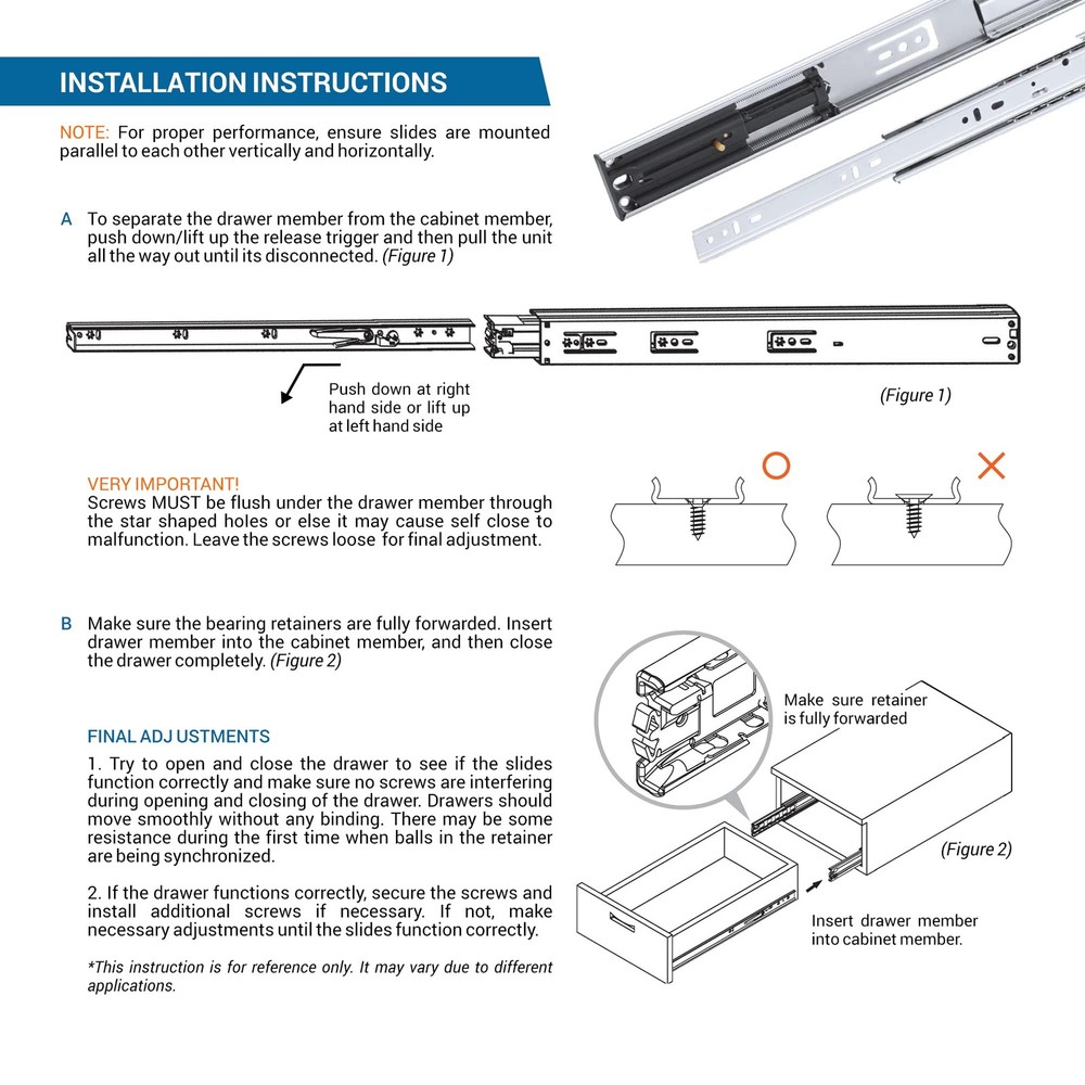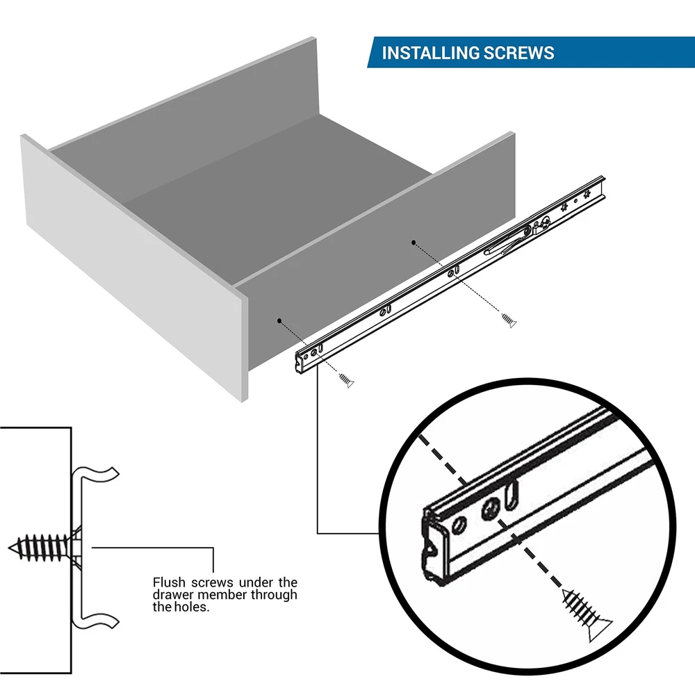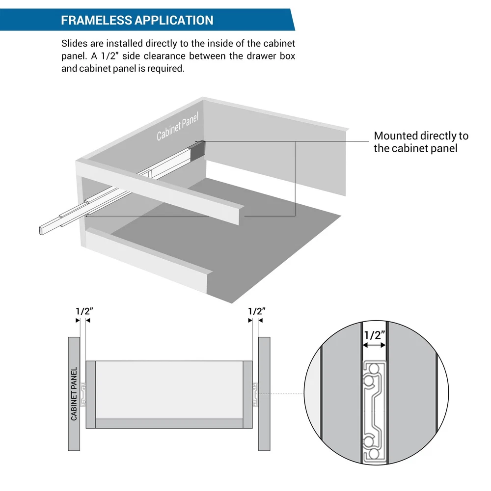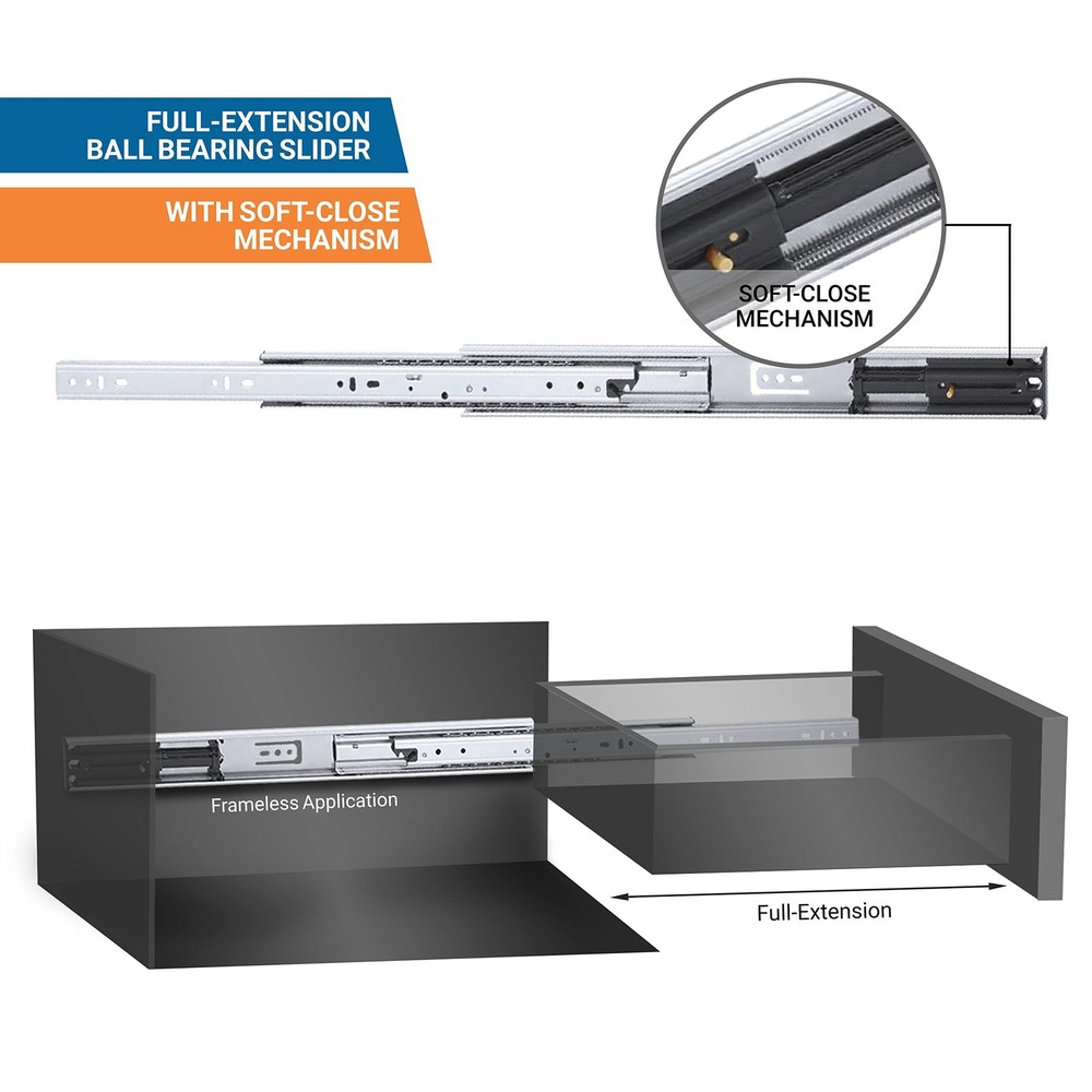 Note: Although technically 'full extension' slides by design, 12" and 14" slides with integrated soft close devices will not provide double the original length when fully extended. This is due to the limitations on member length imposed by the small package and integration of the soft closing mechanism. Actual extended length: 20-5/16". Height: 1-13/16" (45.7mm). Zinc Finish. Requires a 1/2" side spacing per side (Overall 1"). Pull force of 5.5 to 6.5 lbs. Smooth and reliable, this soft close drawer glide is perfect for your job. Hardware provides products with quality that can be both seen and felt! No more slamming drawers with these full extension soft close drawer slides! Soft-close device dampens and absorbs force, causing it to close slowly and quietly. Extremely light with a 2" soft close stroke. Pull force of 5.5 to 6.5 lbs Requires a 1/2" side spacing per side (Overall 1"); Includes: 2 Slides and Mounting Screws 12" Slide provides 10" of travel; 12" Slide actual slide length = 11-7/8"