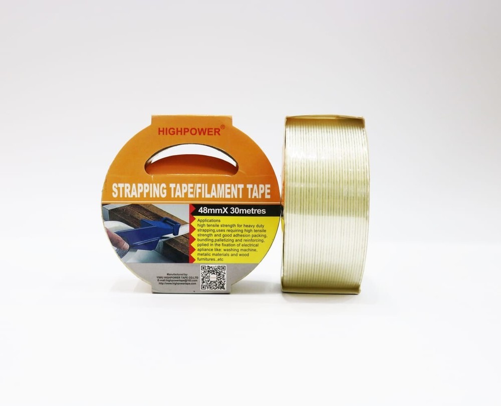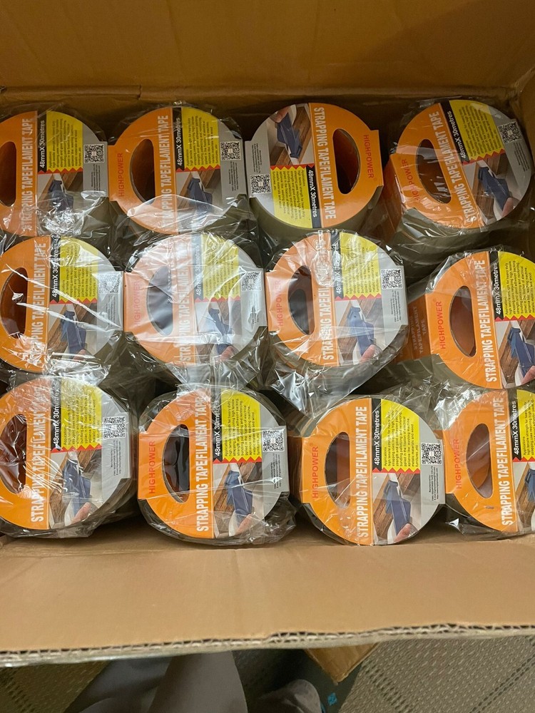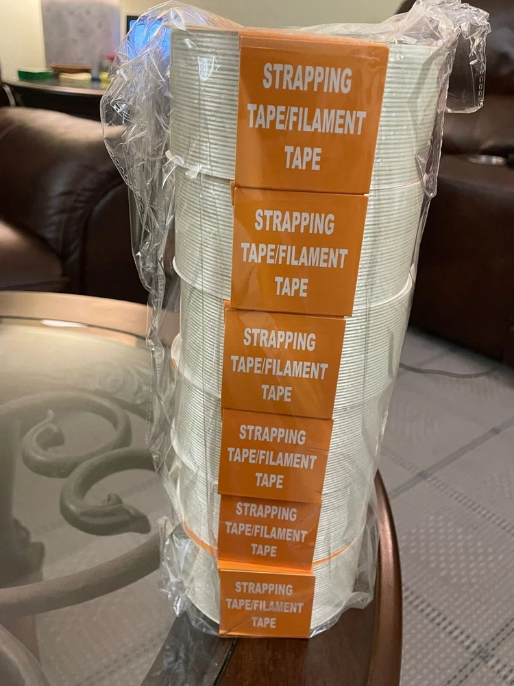 Product Description : Filament Tape is a fiberglass reinforced polypropylene rubber based pressure sensitive strapping tape with a 69 oz/in. adhesion, 4.0% elongation, and 3 in. neutral core. It is used for packaging, palletizing, and unitizing applications. Appl ications : Uses for the Heavy-Duty Tape include: Box closing and sealing - Reinforcing - Packaging - Carton sealing - Bundling operations - Holding - Strapping - General bundling and tabbing/seaming in the metal fabricating industry. Size : 2"(48MM) X 30M (100 ft) Quantity : 12 Ro lls