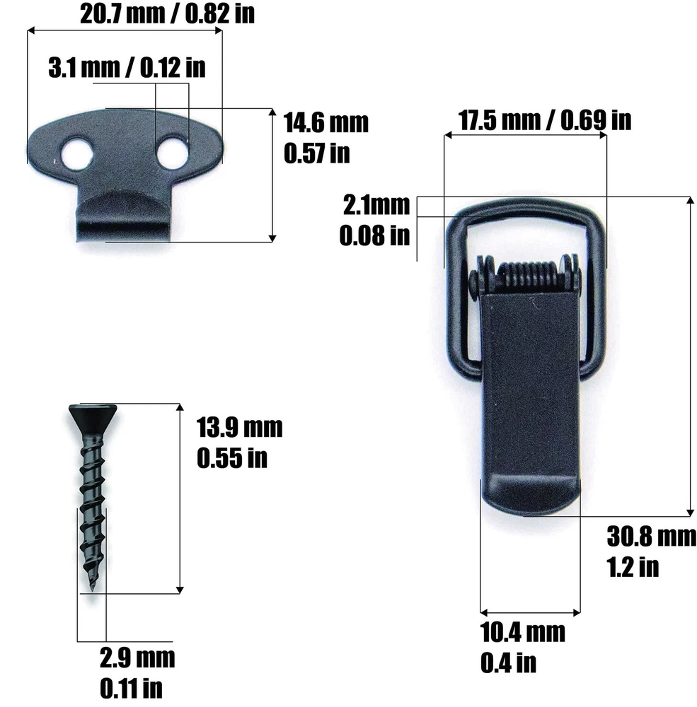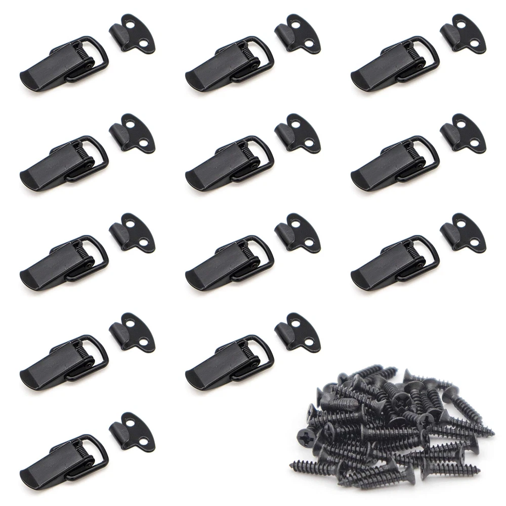 Packing Includes: ➤12 x Black spring loaded toggle latch ➤48 x Black Screws Material: ➤stainless steel Color: ➤Black Size: ➤as the photo showed WARM NOTE: ➤It is not suitable for children under 3 years old. 【Widely Applications】These stainless steel toggle latches are super practical for boxes, cases, toolboxes, drawers, chest, trunk, cabinet, closets, lockers, great to use at home, office, shop, and so on 【Premium Quality】These spring loaded toggle latches are Made of stainless steel, these practical catch clamps perform their duty greatly with high quality, which are anti-corrosion, anti-rust, strong, tough and not easy to deform, without any sharp edges, sleek and comfortable to touch further providing safety. 【Easy to Use】These practical catch clamps are easy to install, Spring loaded design and excellent tension make it hold firmly while locking. which Can provide good protection for locked items. 【Value package】There 12 sets black spring loaded toggle catch latches and Screw all together in one pack that can meet all your defferent needs. 【Note】 If you have any problem for our product, you can click “seller contact” button in your Amazon account to contact us. We will be delighted to help you and reply as soon as we can