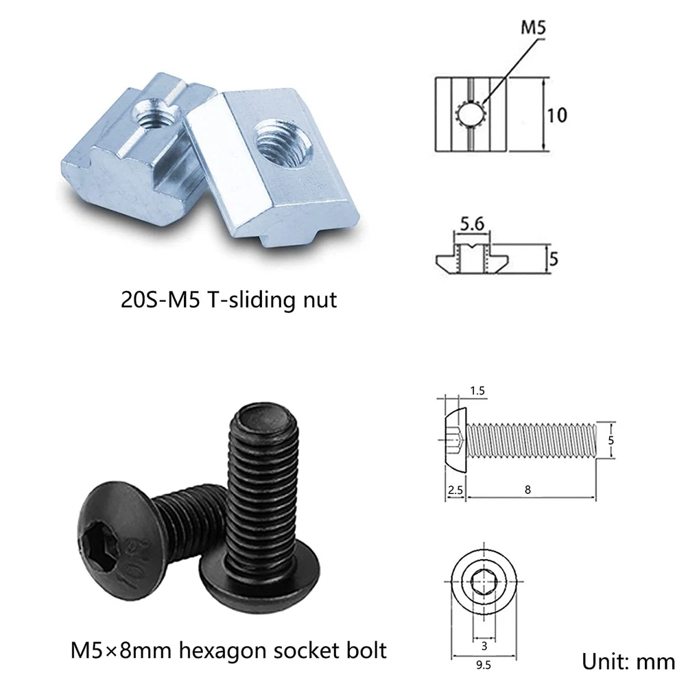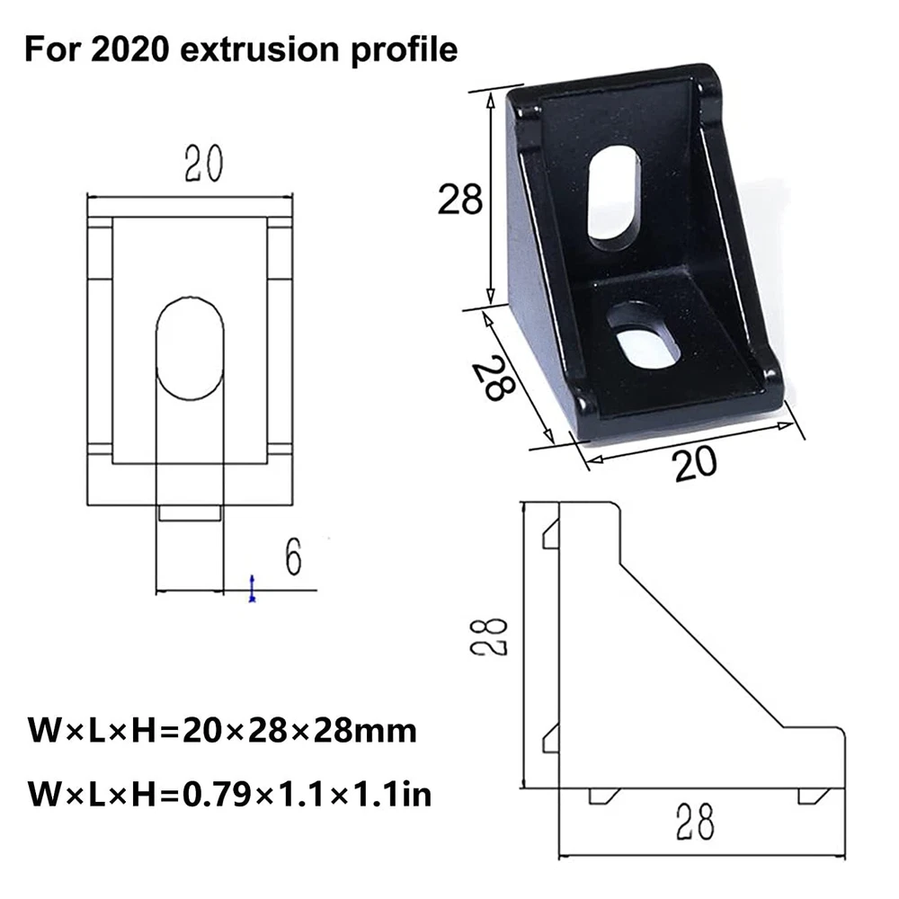 2020 Series Aluminum Profile Connector Set Black 2028 Corner Fitting Right-Angle Brackets for 2020 Aluminum Profile Accessories 90 Degrees Connector Fasten with 24pcs M5 T-Slot Nuts 24pcs M5 Screw Quantity: 12pcs; Material: Aluminum. Brackets Size: 20mmx28mmx28mm; for aluminum profile 2020 series. with 24pcs M5x8 Hex Socket Button Head Bolts Screws Nuts and 24pcs 20-M5 T nut. Rigid connection, used to connect pieces of 20mm aluminum extrusion at a 90 degree angle. Convenient to use, they can be simply fastened with bolts and nuts. 2020 Series Aluminum Profile Connector widely used for building industrial aluminum frame structures, 3D printers, CNC Routers, CNC laser cutters, Robotics Projects Package: 12 pcs 2020 Series Black corner brackets;24pcs M5 slide in T nuts; 24pcs screws and 1pcs wrench Size: 20x28x28 mm(0.79x1.1x1.1 inch).2020 Extruded aluminum connector set are used to connect pieces of 1inch aluminum extrusion at a 90 degree angle Material: 2020 Corner connector:aluminum;M5 Sliding T nuts are made of carbon steel, not easy to deform Suitable: Fit for 2020 seriesT-slot aluminum extrusion profile rail Use: 2020 Aluminum extrusion corner brackets are widely used to build industrial aluminum frame structures, CNC routers, CNC laser cutters, 3D printers, 3D carver machine, robotics projects, etc