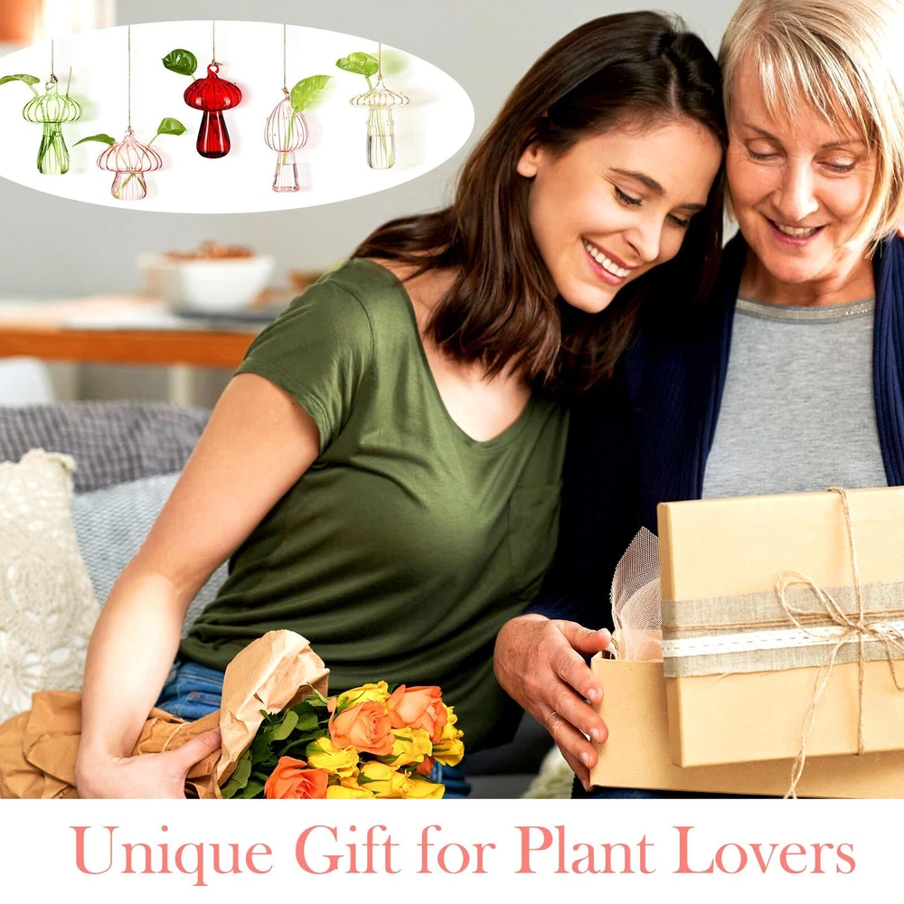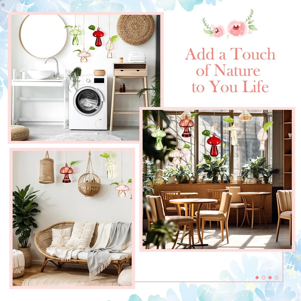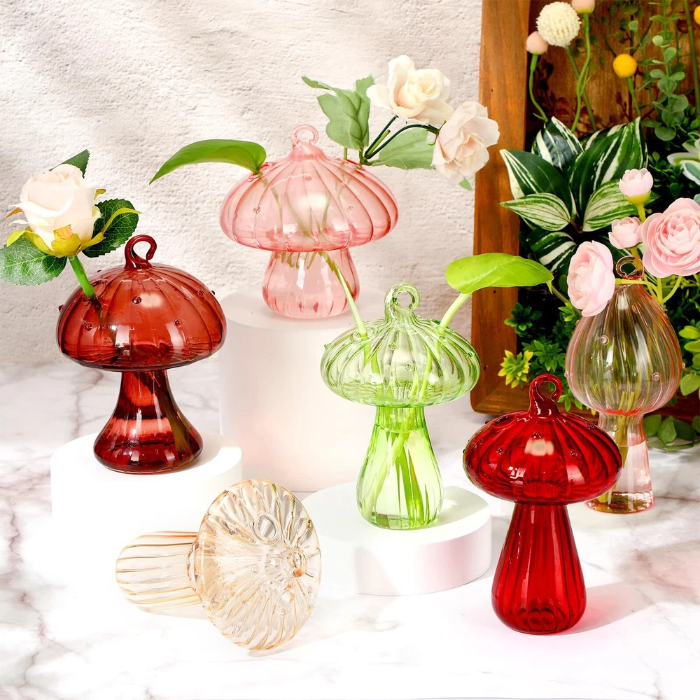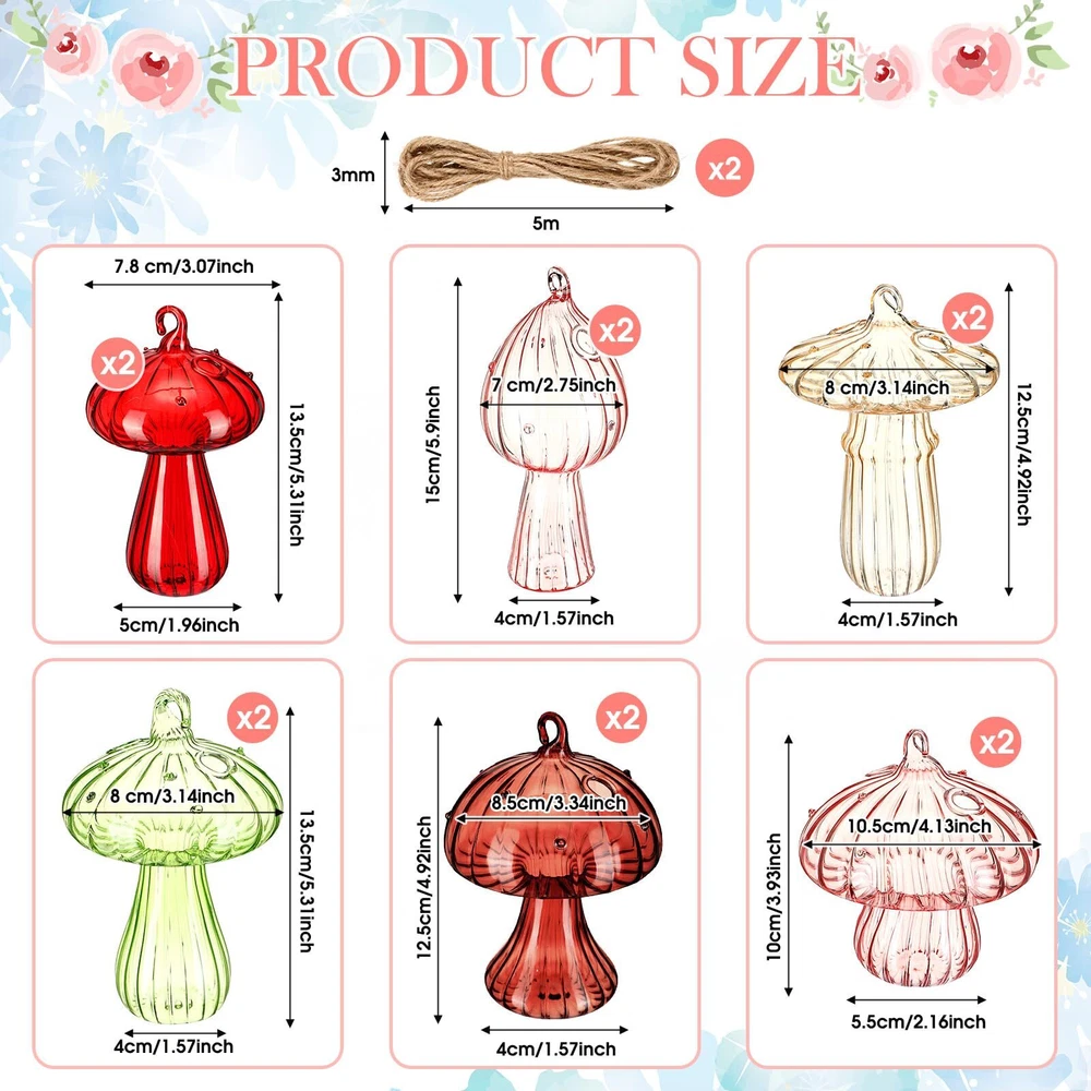 Features: Mushroom shape style: Distinctively crafted in a creative mushroom shape, our flower vase set stands out against the competition. This cute style adds a playful touch to your decor and creates an eye catching display that will surely captivate your guests' attention. Multi color selection: Our mushroom glass pots for plants are available in a wide array of colors. They are designed to add a splash of color to any space they adorn. With their vibrantly colored profiles, the containers create an atmosphere of cheerful energy, illuminating your environment with their lively presence. Specifications: Material: glassColor: colorfulSize: various sizesPackage includes: 12 x Hanging mushroom vases2 Rolls of ropesNotes: Manual measurement, please allow slight errors on size. The color may exist a slight difference due to different screen displays. You Will Receive: 12 delicate mushroom propagation vases and 2 rolls of 16.4 ft/ 5 m length twine, 6 small vases each in different styles, shapes, sizes and colors for you to choose according to your own preferences; See the details on the pictures of the product for the size; The design of the small vase is chic enough to show the beauty of the plant when paired with the plant Multiple Purposes: exhibiting versatility at its finest, our mushroom propagation vases are not merely table vases; You can fill them with your favorite plants and convert them into a hanging plant terrarium, breathing life into your space Durable and Sturdy: the mushroom hanging jars are made of glass, ensures a long service life; These mushroom vases have a more stylish, smooth shape and greater transparency; The bottom of the vase is wider than the ordinary transparent vase, more stable, not easy to tip over, and the top has added a hanging hook, which can be hung in addition to the decoration placed Double Security Packaging: we have designed a special packaging for our lovely mushroom planter, each irregularly shaped glass mushroom vase is safely wrapped in custom built in foam and covered with a sturdy cardboard box to avoid damage during transport; If you receive a broken or cracked vase, please contact us a Wide Range of Use Scenarios: you can not only give delicate glass hanging planter as useful gifts to gardeners, flower and plant lovers, mothers, colleagues, friends, etc., but also as sweet wedding parties, anniversaries, housewarming celebrations and important occasions