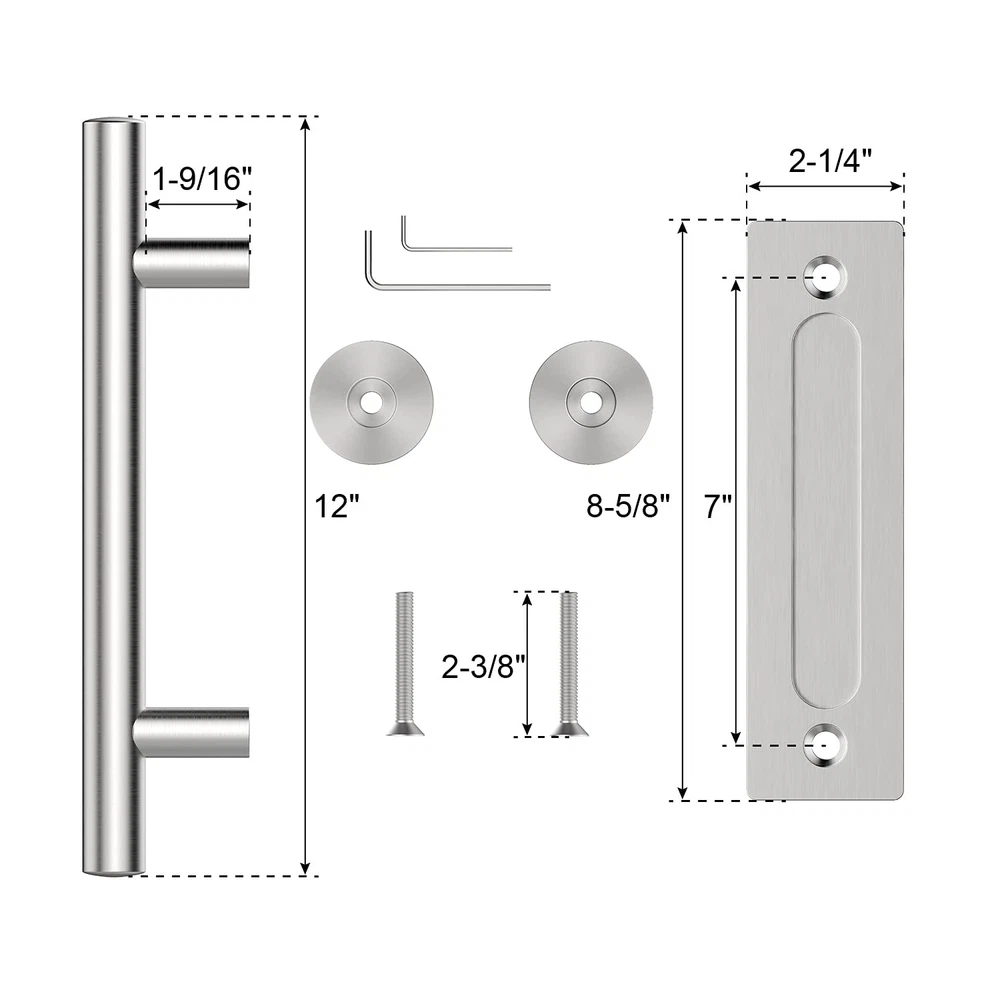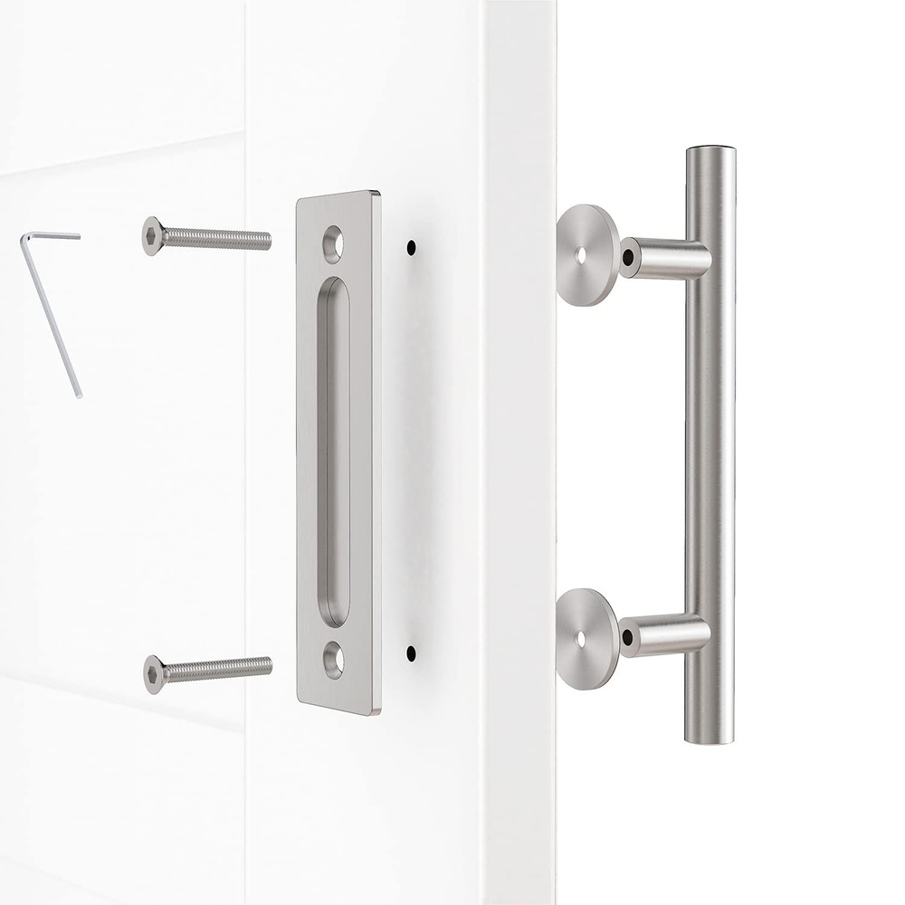 [ EXCELLENT MATERIALS & CRAFTSMANSHIP ] -- Made of high-quality metal material and coated with the excellent powder. Solid and well-made, with good rust and corrosion resistant. Superior finish provides greet touch feel. No sharp edges, and it will not scratch your hands. [ TWO-SIDE DESIGN ] -- This handle set can be used on the inside and outside of the door, the inside flush pull and the outside door pull handle. The door can be easily opened wherever you are. It is a perfect application for barn doors. [ DOOR PANEL THICKNESS ] -- Suitable for 1 3/8"- 1 3/4" thick door. It can used interior or exterior doors. Suitable for barn doors, closet doors, garage doors, garden sheds, wine cellars, etc. [ EASY TO INSTALL ] -- All the necessary hardware is included. Just drilling two holes in the door to install, no need to chisel the door, you can complete the installation in a few minutes. [ SERVICE ] -- 5 years warranty, 7 x 24 hours customer service. If there anything wrong with this door handle, our customer service will try best to solve your problem.