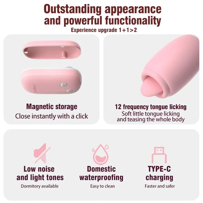 Guarantee 100% discreet shipping on the package and no wirtting on package. Product description : Two-in-one function: G-spot vibration stimulation + tongue licking function, you can enjoy different pleasures at the same time! Quality: Medical silicone material, odorless and skin-friendly Power supply: strong battery life, USB fast charging. Noise <50db, almost no sound! You can use it anywhere in the bathroom, bedroom, living room. Material: ABS & Food Grade silicone Rated voltage: 3.7V Functions: tongue licking , vibration, 12 frequency modulation Box Size:100mm*60mm*35mm(3.93inch*2.36inch*1.37inch) Product size: Vibrating body: 20mm*46.7mm(0.78inch*1.83inch) Tongue licking body: 25mm*50.8mm(0.98inch*2inch) Accessories: USB charging cable Package Included: 1 * Vibrator 1 * USB charging cable 1 *Storage bag(sealed package) Instructions for use 1. Long press to start the vibration of the vibrating egg, into the first frequency, touch once to change A mode of a total of 12 kinds. Long press 1.5S to switch off. 2. Long press another key to start another tongue licking vibrating egg, enter the first frequency, lightly touch to change one mode at a time, 12 kinds in total. Press and hold 1.5S to switch off the device. 3. After use, please wash the body of the egg with water and wipe it with disinfectant paper towel. After the egg body is completely dry, put the two wires together and then wind the wires until the two egg bodies can be put into the slot. Then put the lid on. 4. Charging method: when charging, please insert the charging port into the DC charging port on the top of the box, the indicator light blinks when the power is turned on. When the power is on, the indicator light is flashing, and when it is fully charged, the indicator light will be on for a long time. During the charging process, the appliance circuit is in the charging process, the circuit of the appliance is in a protective state and cannot be activated. It is recommended that the device be fully charged before use.