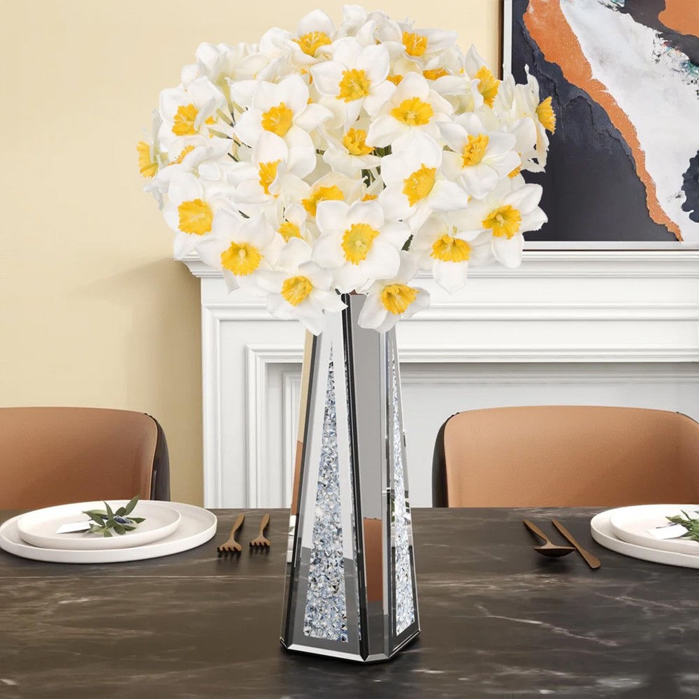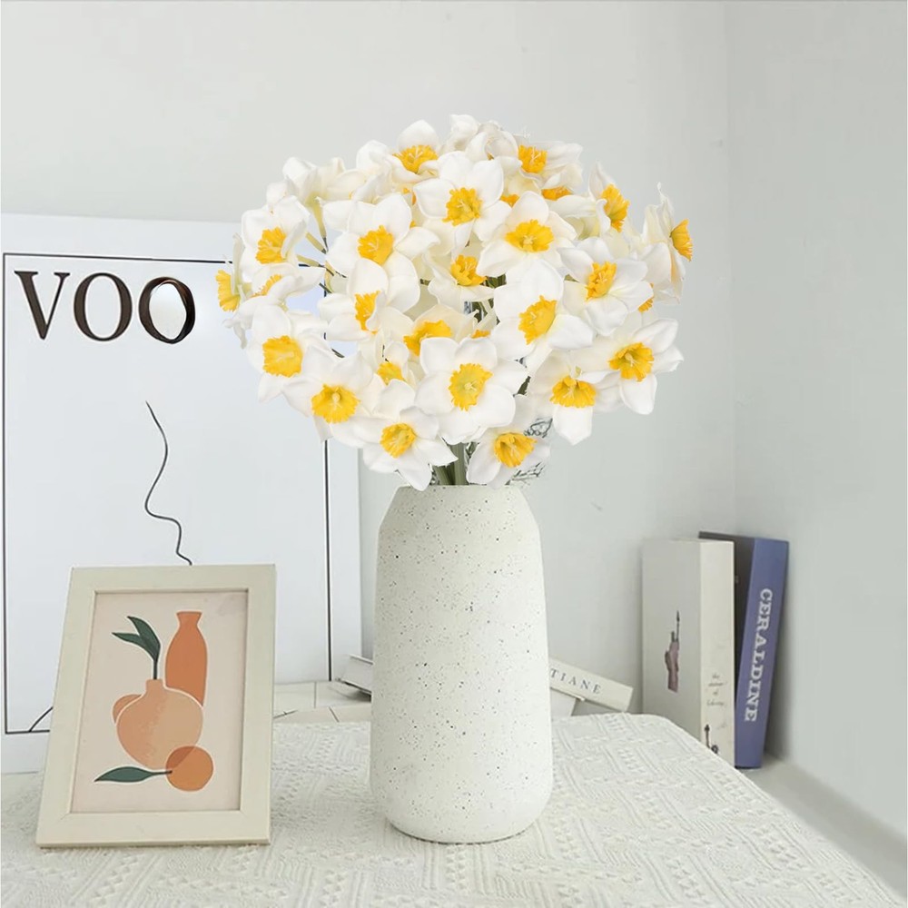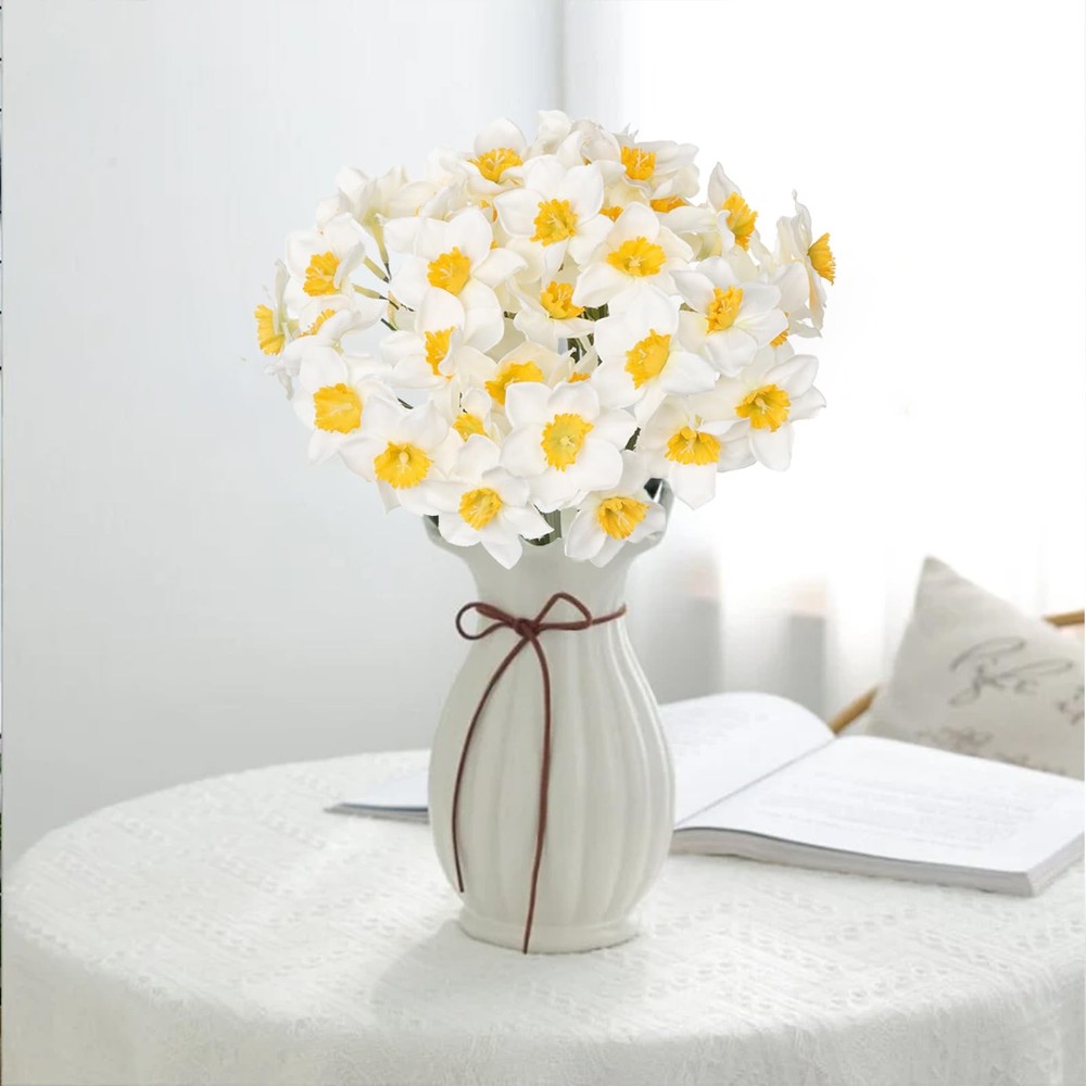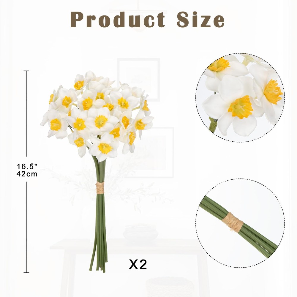 Daffodils are eye-catching with their graceful colors and elegant shapes. These artificial daffodils bunch have a realistic look and natural colors, making them perfect for your home, weddings, or many other occasions with no flower maintenance required. The design of this narcissus artificial bouquet is very detailed, and the flowers are lively and as natural as real narcissus. Beautiful and delicate, this is a great centerpiece for your flower arrangement. Combine with other flowers or artificial greenery to add a natural touch to your design. Daffodils bouquets perfect for wedding flower decorations, wedding table settings, flower arrangements or simply placed in vases, baskets, jars or tin buckets for a simple yet elegant display. Artificial Daffodils bunch with 9 individual stems. Flower diameter 11cm (4.25 inch), overall bunch height 33cm (13 inch) Internally wired stems retain the desired shape. Stems do not have any leaves. Material : Silk ,Plastic Color : White , Yellow 2 colors Dimension: Overall : 15.75"(40cm) High Each Bloom Diameter : 1.57" (4cm)wide REAL TOUCH DAFFOLDILS: The beautiful and lifelike daffodil bulbs are made of high quality fabric silk petals and realistic textured stems. These real flowers are not perfect that the flowers have some of the petals wrinkled but not squashed petals . The stems are very long and you will need a very tall container or vase to hold them unless you are planning to bend or trim the stems. VERSATILE DECOR: Fake daffodil bunch can be used in various ways to enhance your decor. They can be displayed in vases, used as centerpieces for special occasions, or added to wreaths and floral arrangements. Their versatility allows you to incorporate them into a variety of settings and styles. And perfect for wedding, party, home, office, garden, hotel, centerpieces decoration, or DIY flower bouquets, lapel boutonnieres, gift packages, etc. VIBRANT COLOR ALWAYS LOOKING FRESH: Unlike fresh daffodil bouquets that wither and fade after a short time, artificial daffodils retain their vibrant appearance indefinitely. They can be enjoyed as a lasting decoration, providing a touch of springtime no matter the season. And adjustable stems are easy to make any flower arrangements. PACKAGE: 6 Single long stem faux daffodils in a set.( the vase is NOT ). The artificial daffodils measures about 16 ½'' (40cm) in length. Feel to bend or trim these long stems. LOW MAINTENANCE: Artificial daffodil bouquets require minimal maintenance. They don't need watering, sunlight, or special care to keep them looking fresh. Simply dust them occasionally to maintain their visual appeal. It is good choice for people whom are not good with live plants and use less money to have beautiful flower.