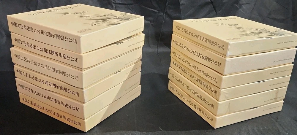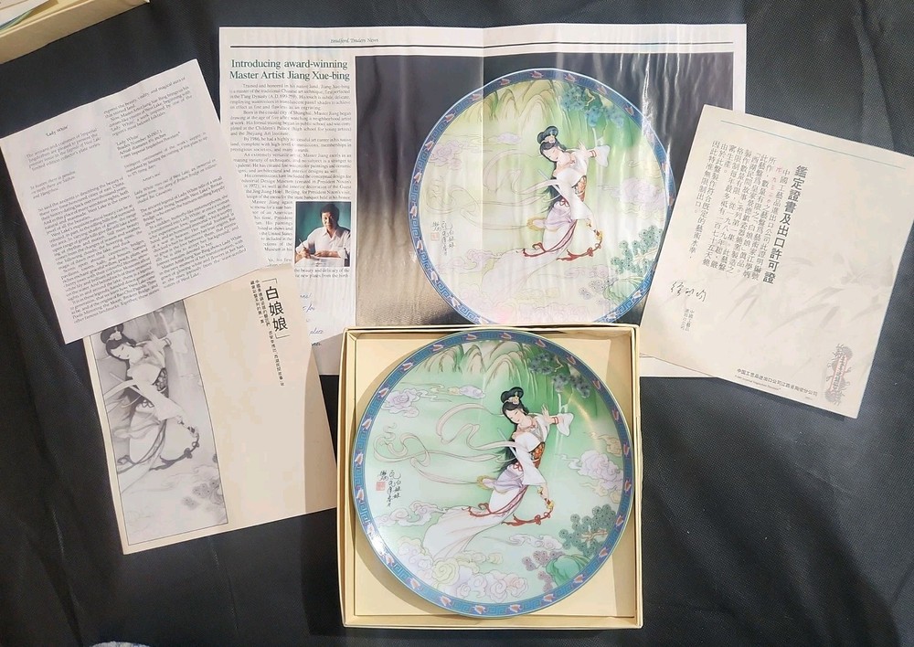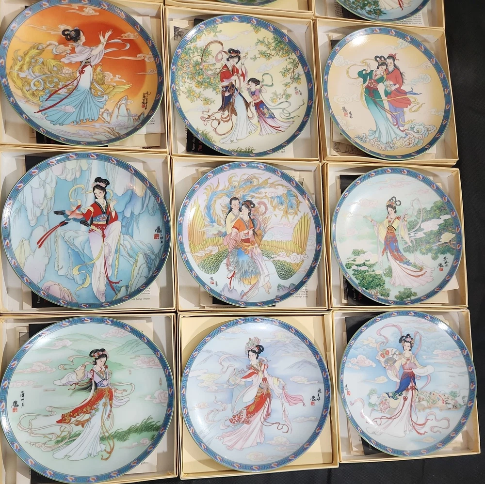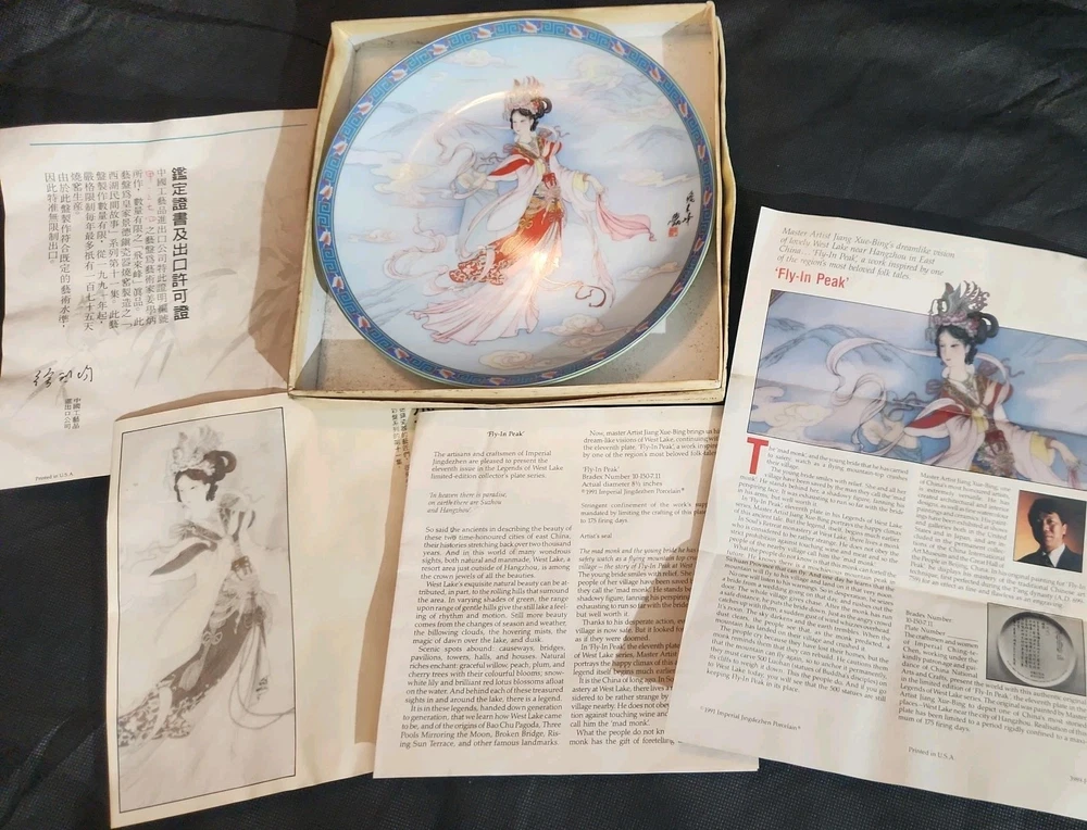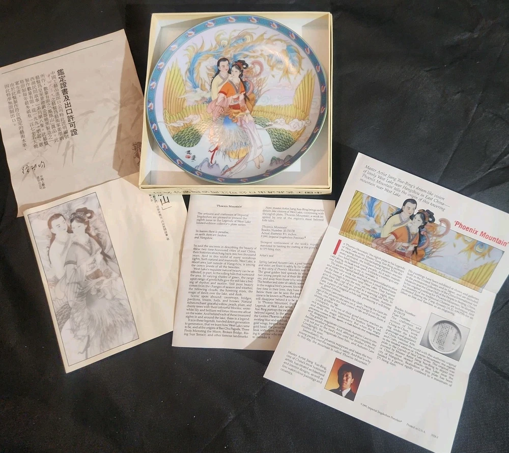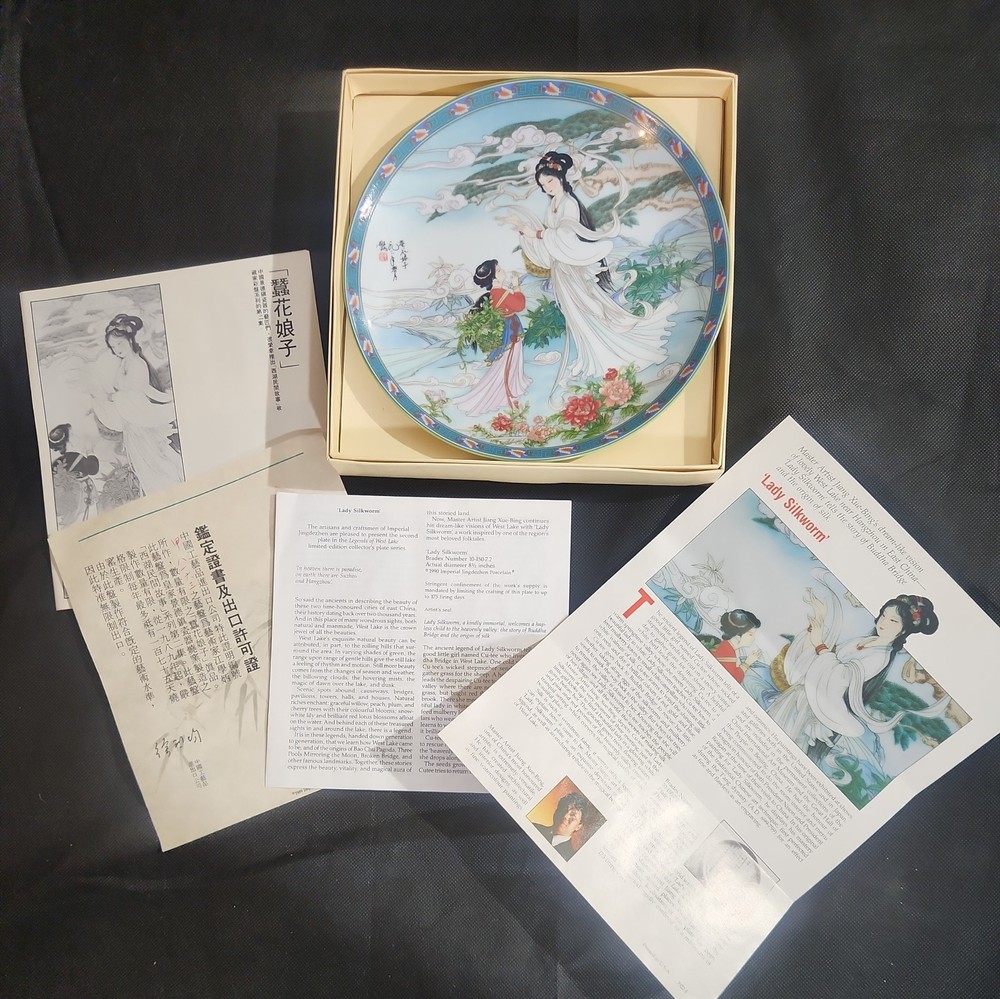 The product is a set of 12 round Imperial Jingdezhen porcelain collector plates from the Legends of West Lake series. These antique vintage decorative plates feature a bordered pattern drawn by the Master Artist Jiang Xue-Bing in full colour on fine Imperial Ching-te Chen porcelain. In this series you will find: Lady White Lady Silkworm Laurel Peak Rising Sun Terrace The Apricot Fairy Bright Pearl Thread of Sky Phoenix Mountain Ancestors of Tea Three Pools Mirroring the Moon Fly-in Peak and Case of the Folding Fans. Each depicting scenes from West Lake in China. Each plate comes with its original box, certificate of authenticity, and informational pamphlet in both English and Chinese which is almost unheard of it is so rare. The set was produced in China in the late 20th century, making it a unique and collectible addition to any display. This is a flawless complete set of all 12 Imperial Jingdezhen Porcelain "Legends of West Lake" plates that have never left their original boxes. Bradex Numbers 10-150-7.1 / 10-150-7.12 Please look at all pictures, some of the boxes and colored informational packets have some discoloration or are not in pristine condition. All plates are in pristine condition.