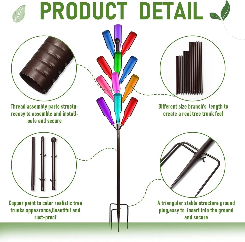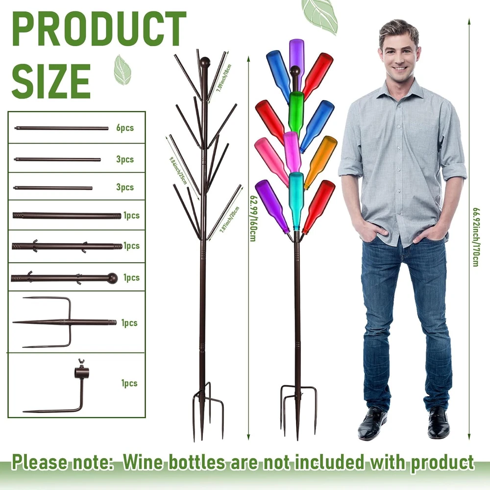 Sturdy Design: the wine bottle yard tree adopts thread assembly parts structure and proven design, easy to assemble and install, safe and secure; Equipped with a triangular stable structure ground plug, which is more convenient to insert into the ground and secure Well Crafted and Durable: the height of the wine bottle tree for the garden is about 5.25 feet/ 160 cm; It has 17 parts, bottom triangular ground plug structure, equipped with 12 branches assembled with threaded teeth, divided into 3 different size lengths to create a real tree trunk feel, respectively 9.84 inch (6 pcs), 7.87 inch (3 pcs), and 7.09 inch (3 pcs), it can hold 12 bottles in total; Please note, wine bottles are not included with product Versatile and Elegant Decoration: the wine tree for empty wine bottles is designed like in copper paint to color realistic tree trunks appearance, you can fill it with different kinds of glass bottles, and decorate with light string or other accessories, to make it look attractive and exquisite Undefined: the bottle tree stand adopts quality welded solid metal, hard and stable, not easy to deform or break, durable and long lasting Eye catching and Low maintenance Accent: you can plug your favorite glass bottles to decorate your wine bottle tree and delight your garden or backyard, ideal decoration for weddings, birthday parties, bridal showers, baby showers, housewarming events, and more Product Description