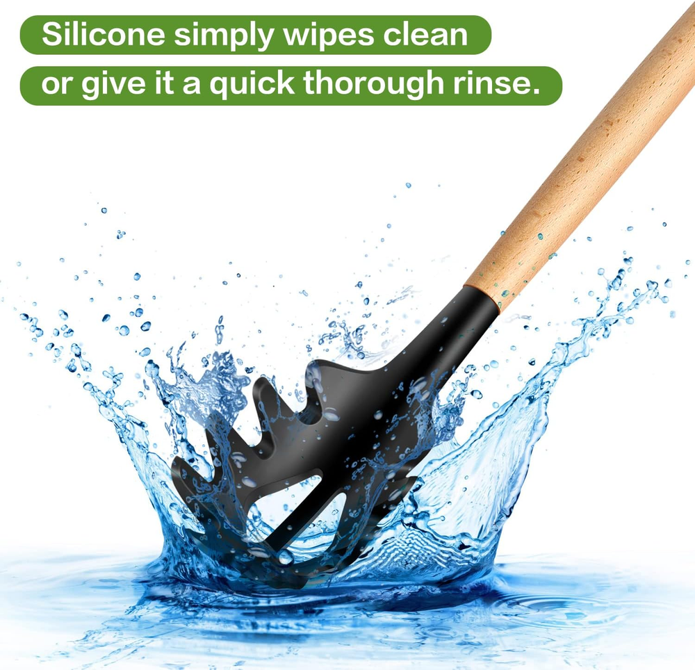 12" Wooden Handle Silicone Pasta Fork Spoon Food Grade Noodle Utensil
