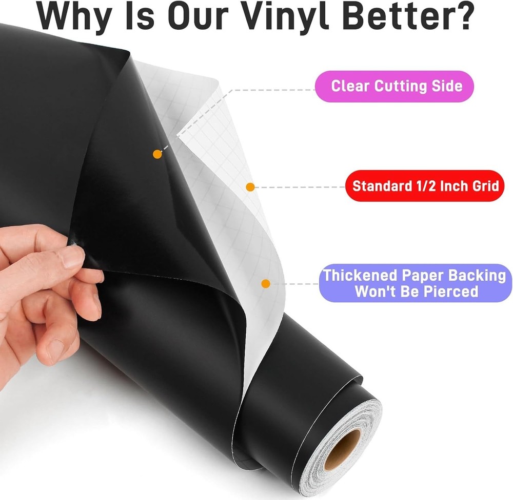 12'' X 42Ft Matte Black Permanent Vinyl Roll - Permanent Adhesive Vinyl Roll for About this item Size & Features- 30.5 cm x 12.8 m (12 inches x 42 feet) matte black vinyl roll for DIY. The permanent vinyl has enough stickiness and easy to cut feature which works best on smooth, sturdy surfaces. You can use it in a variety of customized ways, For example, making home decor, car decals, party decorations, decorating ceramics, laptops, mugs, phones, tumblers, and windows. Waterproof & Light Proof- The black self adhesive vinyl roll uses premium pigment to present true & bright colors, avoiding light transmission through objects. Along with a waterproof feature, making it ideal for interior and exterior decorations, ensuring a 5 years indoor and 4 years outdoor durability. Please avoid water for at least 24 hours for vinyl and object to merge better. Machine & Setting- The black permanent vinyl is compatible with most cutting machines including series and Silhouette cameo 3/4. The recommended setting for Blade-Standard. A test for setting on pressure and speed is suggested since the complexity of the pattern and type of the vinyl may vary. Thick Backing Paper- The thickness of the backing paper is thoroughly calculated. Making it thick enough to cut through without the vinyl stuck to the mat board result to tear-up, say goodbye to the repeated cutting and weeding process for a single pattern and save you precious time from fighting bubbles and wrinkles. With professional DIY materials, engraving small font decals is no longer a problem. 90 Days Returns- As a customer-first DIY brand, we evenly value the nice of the products . Therefore, we has a 90 days-return policy . If our products have failed your expectations or you’ve encountered any problems, please consult us. 12" × 42ft Matte Black Permanent Vinyl Roll Permanent Adhesive Craft Vinyl for DIY & Professional Projects Create bold, long-lasting designs with this 12-inch x 42-foot Matte Black Permanent Vinyl Roll . Designed with a strong permanent adhesive , this vinyl delivers excellent durability and a smooth matte finish that looks professional on any project. Perfect for cutting machines like Cricut, Silhouette, and Cameo , the vinyl cuts cleanly, weeds easily, and adheres firmly to a wide range of surfaces. Ideal for both beginners and experienced crafters. ⭐ Key Features Size: 12 inches x 42 feet (long continuous roll) Matte black finish for a modern, clean look Permanent adhesive for long-lasting applications Compatible with Cricut, Silhouette, Cameo & more Easy to cut, weed, and transfer Strong adhesion to smooth, clean surfaces Water-resistant and fade-resistant Ideal for indoor & outdoor use