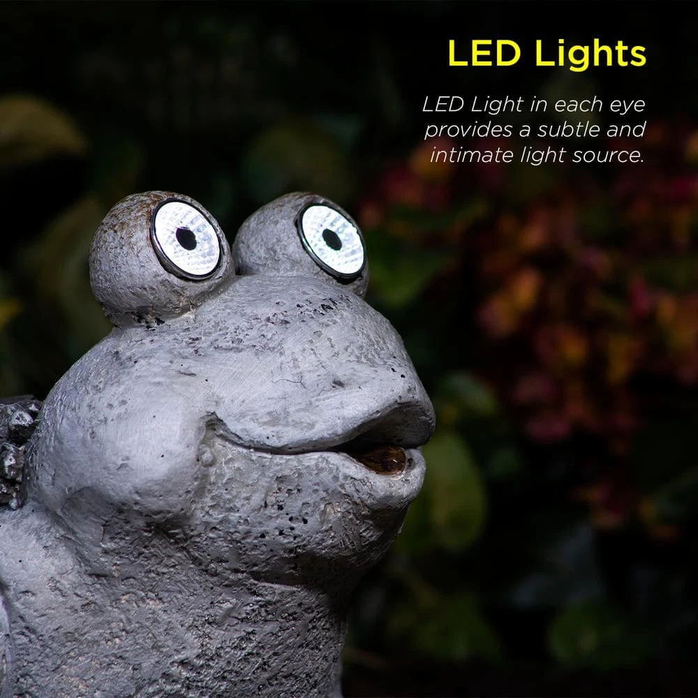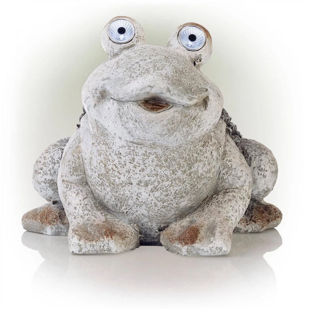 12 in. Tall Outdoor Solar Powered Frog Yard Statue with LED Lights, Gray Solar powered - set it in a sunny spot in your yard and enjoy Features LED lights for a lovely ambiance Durable and versatile for long-lasting enjoyment Welcome your house guests with the warm and inviting 12 in. Outdoor Solar Powered Frog Yard Statue with LED Lights from Alpine Corporation. This statue features an adorable happy frog that provides a unique and decorative addition to your home's exterior Decor. The lighted yard art is powered by solar energy to keep your outdoor yard statue lit up and features a pair of white LED lights located in the frog's eyes. Constructed from durable magnesia, the yard art is made tough for outdoor use and is weather-resistant for long-lasting, quality use on your porch, patio, or flowerbeds. Add one or multiple statues to create an enchanted garden display. The yard decor is perfect for display on pathways, entryways, decks, courtyards, and outdoor living spaces. The outdoor garden statue measures 14 in. L x 16 in. W x 12 in. H to fit almost any outdoor space and a 1-year manufacturer's warranty from date of purchase. Color Family: Gray Garden Décor Features: Lighted Included Parts: LED Light(s) Indoor/Outdoor: Outdoor Material: Plastic Mounting Type: Free standing Outdoor Compatibility: Weather Resistance Primary Power Source: Solar Product Weight (lb.): 8.57 lb Returnable: 90-Day Style: Coastal Manufacturer Warranty: 1 Year Limited Warranty Product Depth (in.): 14 in Product Height (in.): 12 in Product Width (in.): 16 in