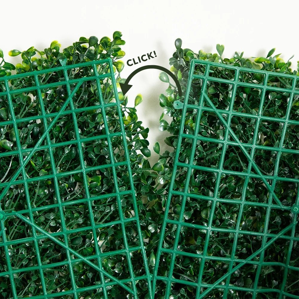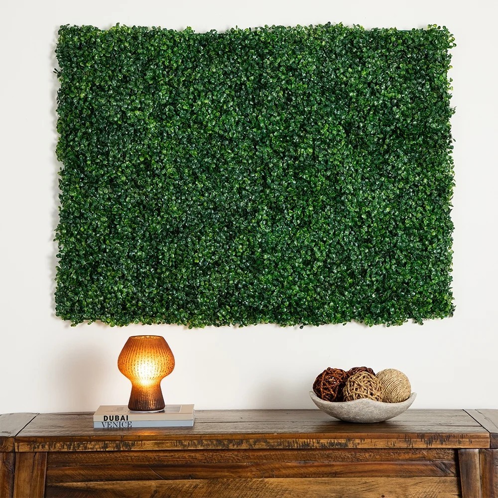 Mat Dimensions : Each artificial boxwood mat measures 20 inches by 20 inches, providing a flat, square decorative element. Bulk Quantity : This product includes a set of 12 individual artificial boxwood mats, suitable for larger decorative projects. Effortless Maintenance : The artificial nature of these boxwood mats requires minimal upkeep, eliminating the need for planting or potting. Indoor Application : Designed specifically for indoor use, these decorative mats are ideal for enhancing various interior spaces. Lifelike Appearance : Crafted by expert horticulturists with attention to detail, the mats offer a highly realistic and lush green aesthetic. Versatile Display : Easily hung and displayed, these mats can refresh walls, desks, bathrooms, or be combined to create a stunning green wall. Business Enhancement : Popular among businesses like cafes, weddings, spas, restaurants, and bars for event decoration and ambiance.