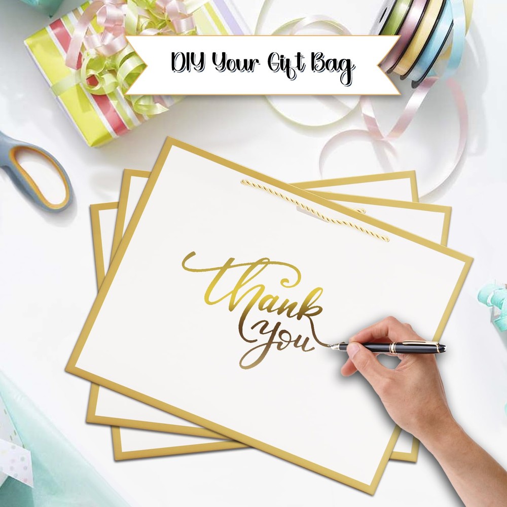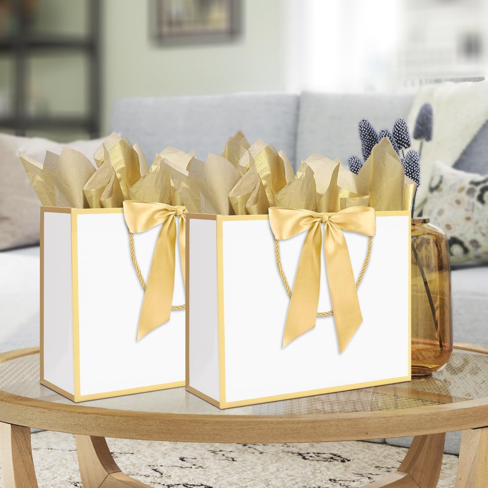 Large Size: Kraft paper bags with handles measure 12.6"L x 4.5"W x 10"H, reusable and recyclable. The present bags can be widely used for in hotel, shops , boutique, party and other places Simple and Elegant Design: The gift bags with handles is designed with golden trims and bow ribbon to make your gift look more elegant and fashionable, making your gift more memorable to the recipient Rope Handle & Tissue Paper: The exquisite rope handle is stronger than ordinary paper handles, and it is more comfortable to use. Each bag is matched with two gold tissue papers. It will makes the gift look more upscale and texture Thickened Gift Paper Bag: Thanks to the big paper bag is made of 300 g thick kraft paper material, the bottom is reinforced and flat, sturdy, and not easy to tear. Our kraft paper bags can bear heavier weight Variant Occasions: These paper gift bags can be used as birthday party bags, bachelorette party bags, wedding bags, baby shower bags, thank you gift bags, anniversary party bags, Mother's Day and other holiday gift bags, party favor bags