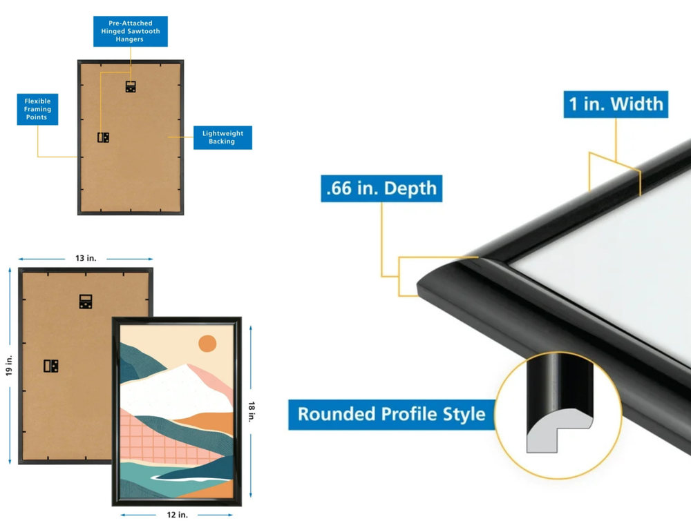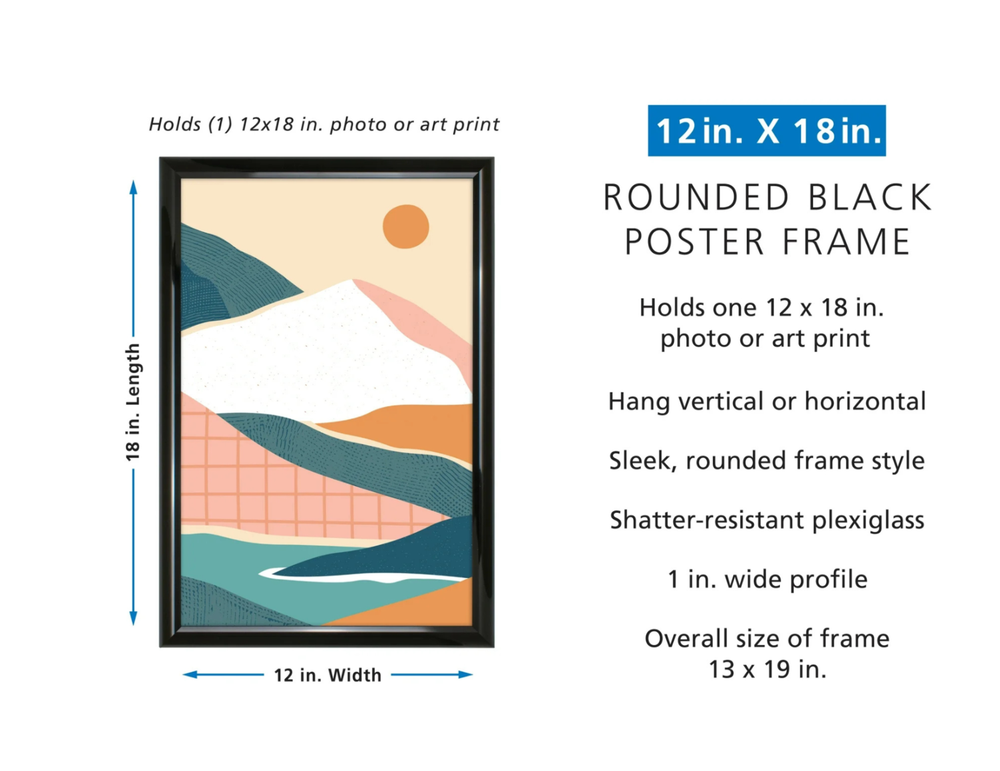 Product details Put the latest pictures of family and friends in the black Mainstays 12x18 Trendsetter Poster Frame. They can be used to display a poster, photograph or artwork for all to admire. The plastic poster frame is quite stylish and will fit in with most home decors with this solid black outside design. It is made with a plastic styrene front that gives it a sleek, streamlined design. It will easily complement different decor themes, from classic to contemporary. This Mainstays poster frame is an ideal choice for brightening up a home or professional office. Use it to dress up a bedroom wall or to showcase a favorite band or sports team. Combine it with additional frames from Mainstays to add more life to your living space. It makes a thoughtful gift for a housewarming or shower present. Mainstays 12" x 18" Plastic Picture Frames, Black Material content: plastic poster frame Color: black Holds 12" x 18" poster or print Styrene front Mainstays poster frame hangs vertically or horizontally Hanging hardware provided Assembled product height 19.62 in Finish Black Material Plastic Decor style Modern Shape Rectangle Weight 2 lb Size 12 x 18 Picture frame type Poster Frames Color Black Number of openings 1 Brand Mainstays