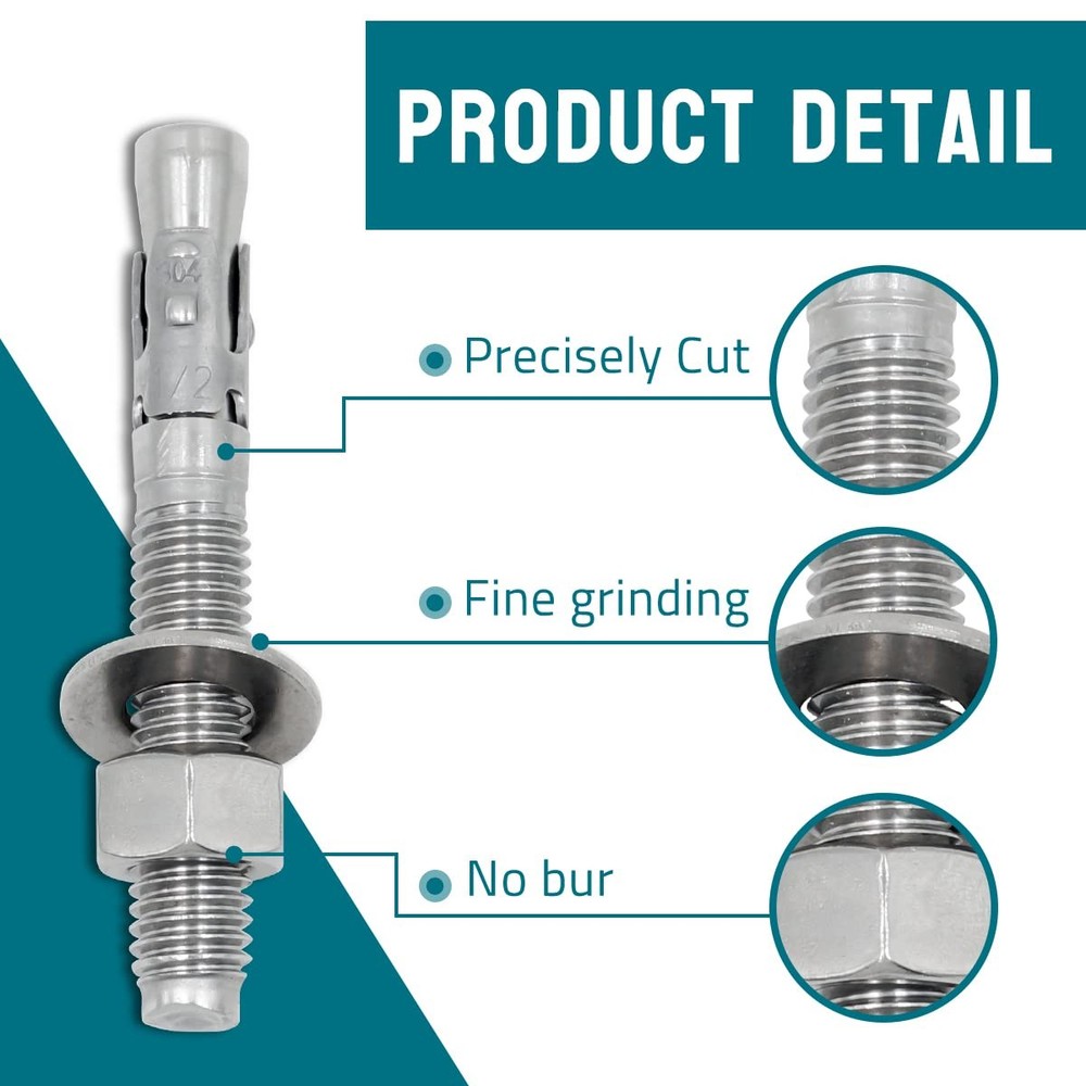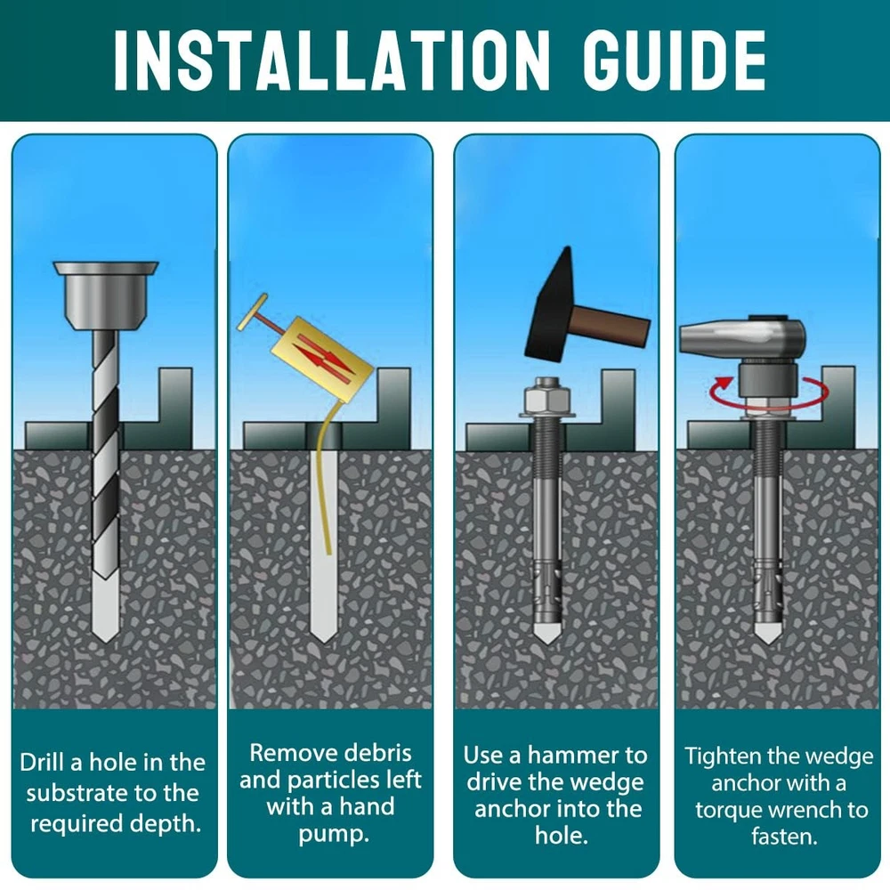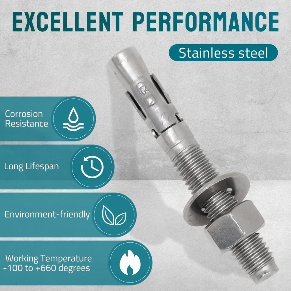 Come with the excellent experience of fastening. wedge anchors for cement is Made of stainless steel. screw in wall anchors is Corrosion Resistance The stainless steel wedge anchor is suitable for both indoor and outdoor use. Wedge anchor is great to have around for whenever you need it most. And its services life is very long. You'll no worry because you can use it for a long time. Therefore, not only will you have a bright shiny galvanized carbon look, but also be long lasting. High & Low Temperature Resistance female wedge anchor stainless steel material is strong and durable that its operating temperature reaches -80 to +600 degrees. expansion bolts concrete anchors and screws Concrete Anchors,1/4 wedge anchors stainless The wedge anchor is only designed for use in concrete, and should never be used in block or brick base material. expansion screws for concrete,anchor screw with nut stainless steel fasteners Application Scope reusable expansion screws Used in door, wall, concrete, masonry cement, fence, industrial, house and garden etc.concrete post anchor screw anchors concrete wedge anchor bolts, stainless steel wall concrete brick anchor expansion bolts The carbon steel galvanized wedge anchor is ideal for the installation of storage shelves, factory, machinery, elevator and handrail. wedge bolt and nut heavy duty anchors for drywall Diameter of heavy duty wedge anchor: 1/2 inch | Length of the anchor: 3-3/4 inches | Quantity: 5 pcs High Quality: Made of Premium stainless steel, anti-rust, sturdy and durable, can hold seawater and humid marine environments. Non-easy falling out Application: This concrete bolts is only suitable for concrete substrates, not for block or brick foundation materials Installation: Drill a small hole with a diameter of 1/2 inches to clean any debris from the hole, then tap the heavy duty bolt into the hole and tighten the screw Various Size: Select the appropriate size stanless steel bolt to achieve the perfect fastening effect