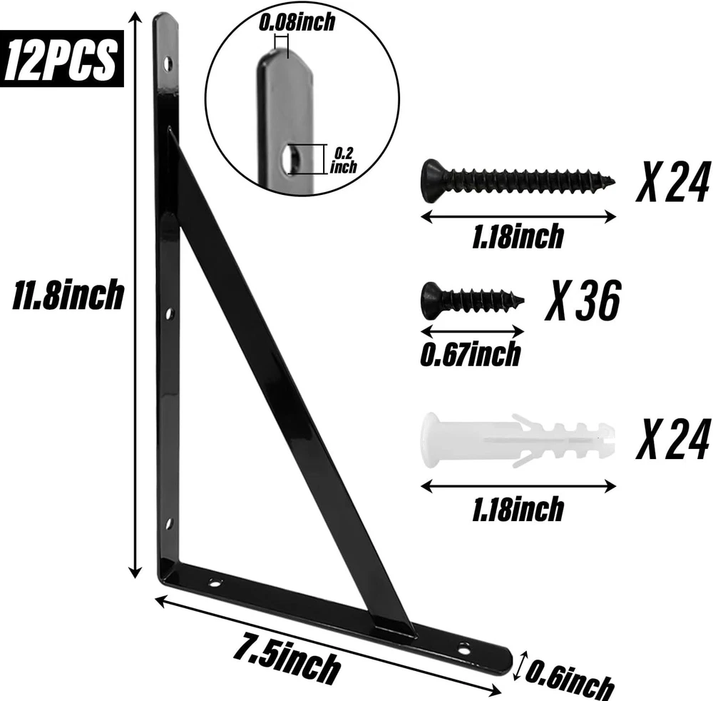 Sutekus 12" x 8" Heavy Duty Shelf Brackets with Screws Metal Shelves Supports Wall Mount Angle Brackets for Floating Shelves, 12Pack About this Item: Package includes 12 x Brackets , 24 x Long Screws and Anchors, 36 x Short Screws. Made of high quality steel with black powder-coating finish, our brackets are durable, water and corrosion resistant. Pre-drilled fixing holes on each side and included screws are convenient for installation. Heavy duty design with max weight capacity per pair is up to 110lb/50kg. Perfect for DIY floating shelving for your home, office, garage and kitchen etc.